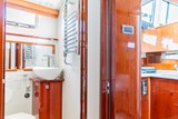 Master cabin aft with spacious island walk-around double berth, storage under berth, dressing table with mirror, hanging storage, down-lights, reading lights, opening portholes and hatches. Master cabin ensuite with Jabsco electric vacu-flush toilet, storage with mirror, sink and towel radiator. Separate master ensuite shower compartment.