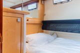 Guest cabin to port with single bunk berth with hammock style 'Pullman' single berth above, hanging locker, storage, down-lights and reading lights.
