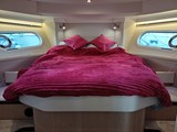 Owners cabin forward with island double berth and padded headboard, with storage underneath and stowage on both sides of berth, mirror, hanging locker with lighting, cupboard with shelves, opening hatch with mosquito screen and blind, two hull windows with opening portholes and venetian blinds.