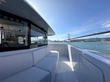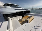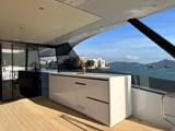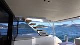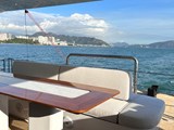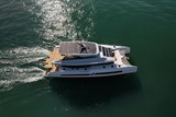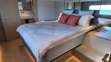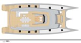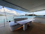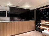 The yacht's internal volume has been maximised and every space configured with distinct purpose in a layout that dispels all preconceptions of yacht interiors. She features a huge saloon lounge with a dining area and open plan galley on the main deck, a spacious aft deck with sofas and al fresco dining space, and a cosy exterior lounge forward of the superstructure. On the flybridge there is another informal dining area and freestanding lounge furniture, with sun loungers positioned aft to make the most of the elevated and uninterrupted views. The flybridge itself is sheltered by a fixed bimini with a retractable centre 'sun roof' panel.