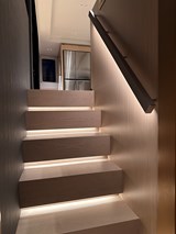 Clear carbon off center stair and handrail to fly bridge with illuminated steps on stbd aft side deck
