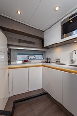 The cockpit of the Gran Turismo 45 is furnished with a vast U-shaped seat that creates a comfortable and convivial area for guests, who sit facing the Wet Bar that features a sink, fridge and ice-maker. This wetbar contains a retractable TV that can be raised to provide entertainment.