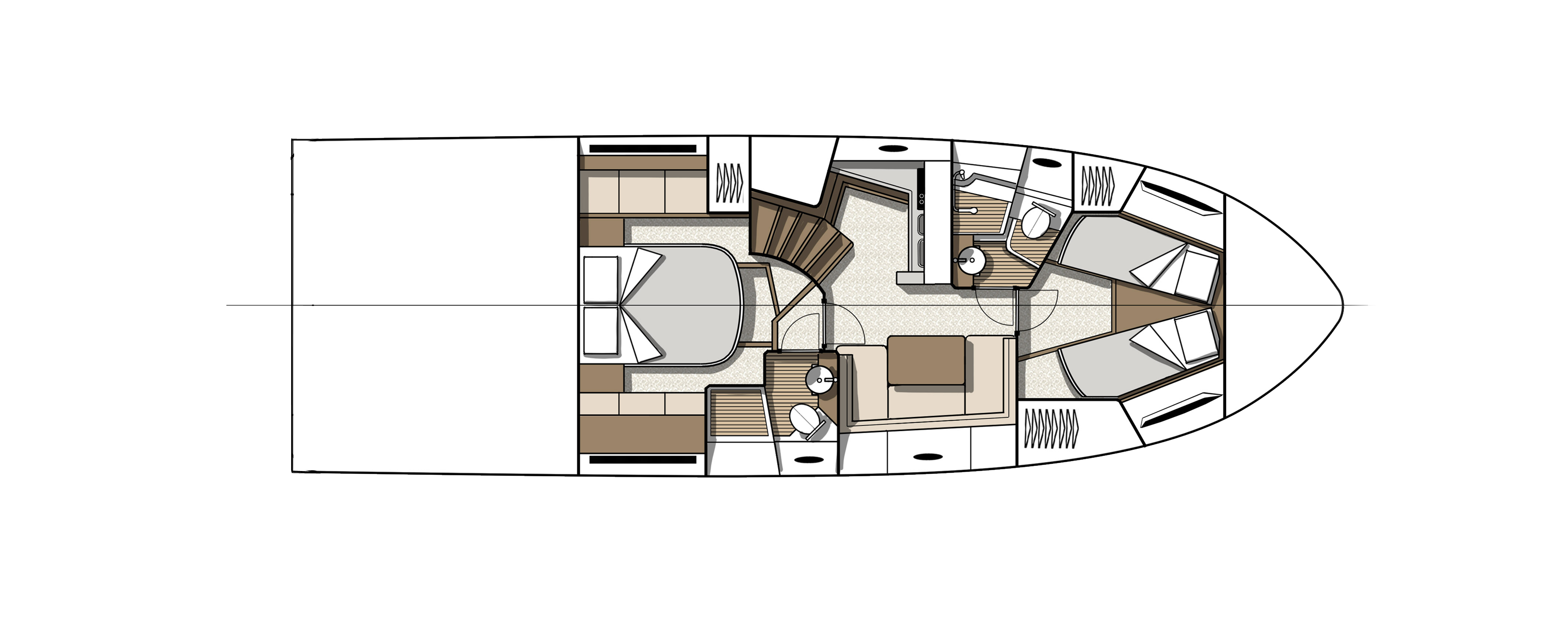 With its sleek lines and sporty hull, this 14.78-metre yacht boasts elegant details such as the metallic grey “fashion plates” fixed to the sides of the hard-top and on the engine air intakes. The hard-top and the large hull windows, a feature of the new generation of Express Cruiser, give the boat a sleek, modern look and infuse the interior with soft, natural daylight.