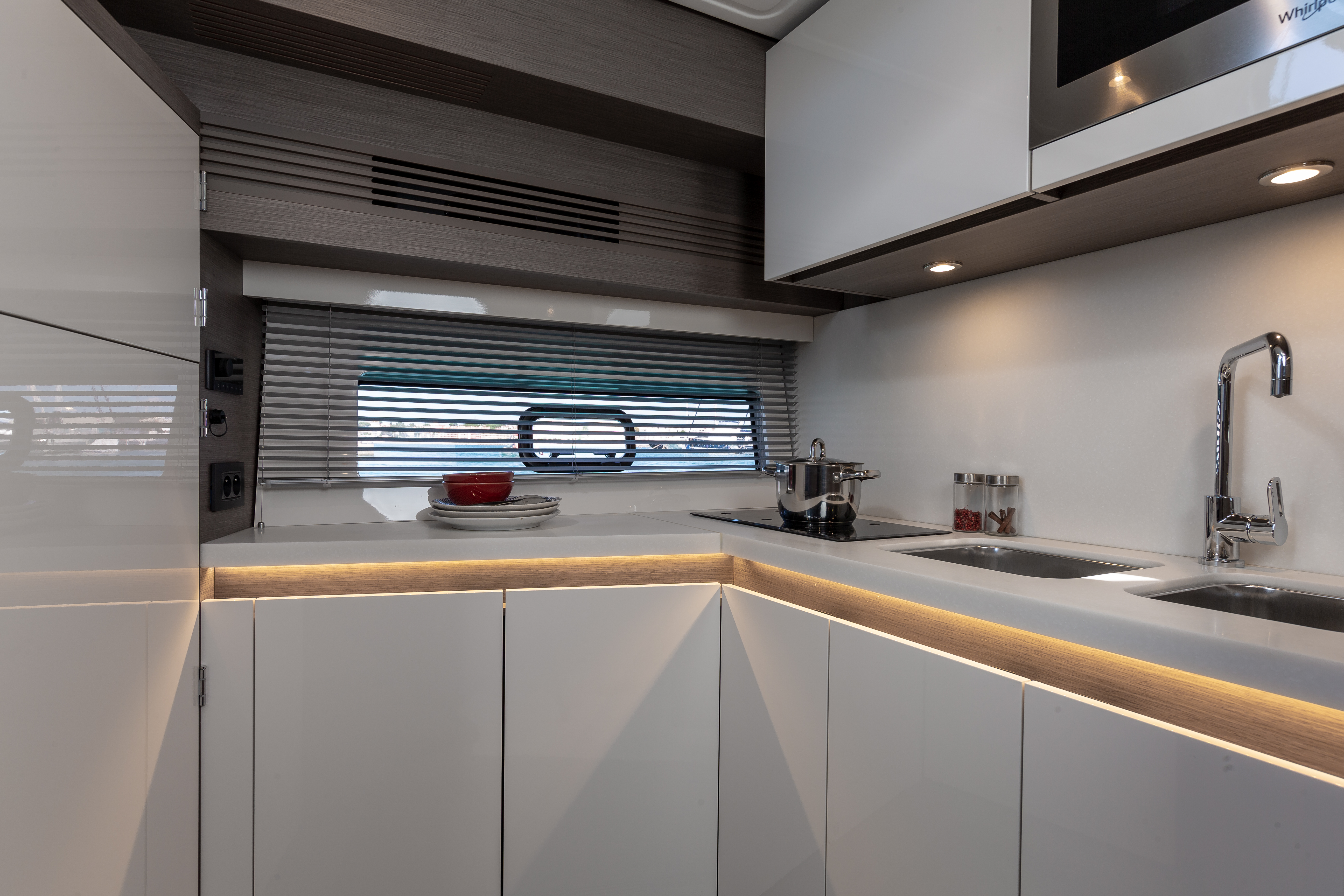 The cockpit of the Gran Turismo 45 is furnished with a vast U-shaped seat that creates a comfortable and convivial area for guests, who sit facing the Wet Bar that features a sink, fridge and ice-maker. This wetbar contains a retractable TV that can be raised to provide entertainment.