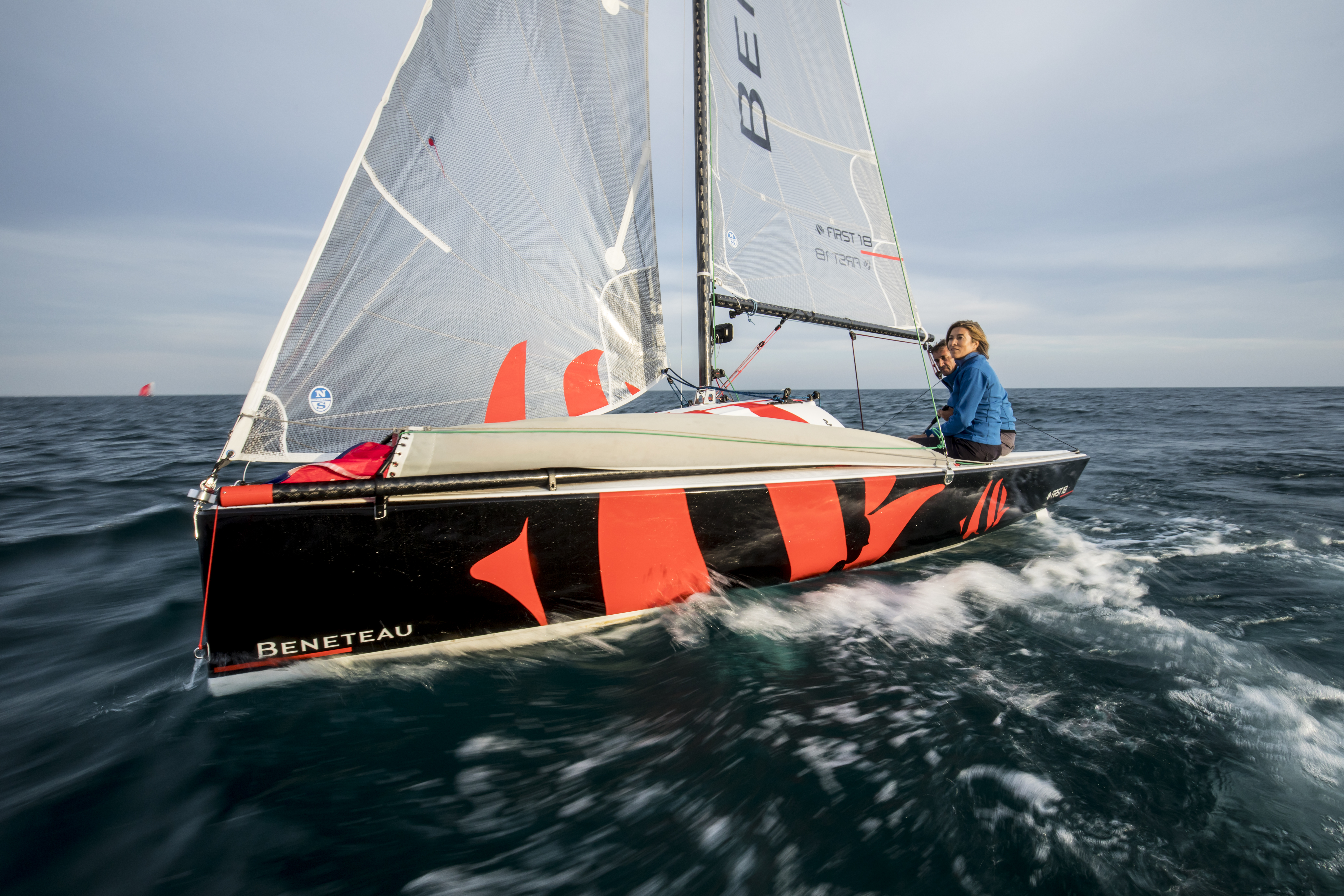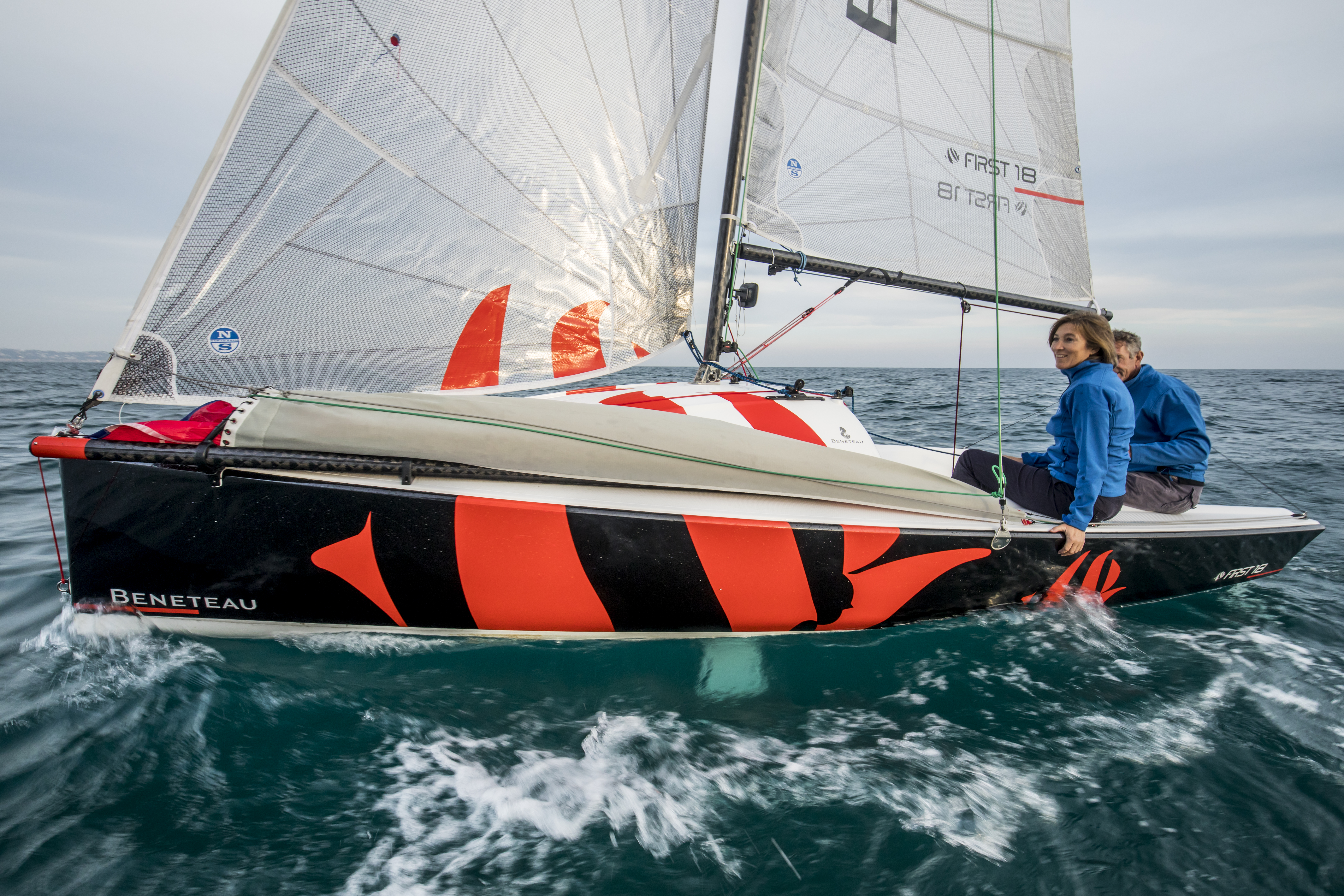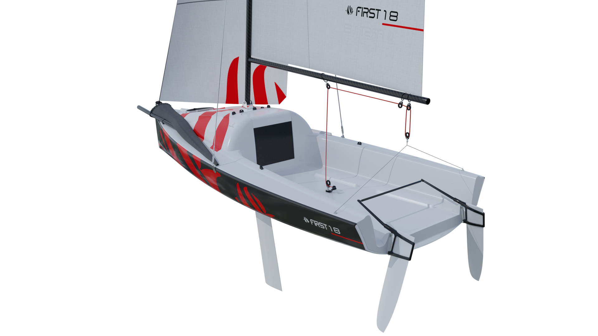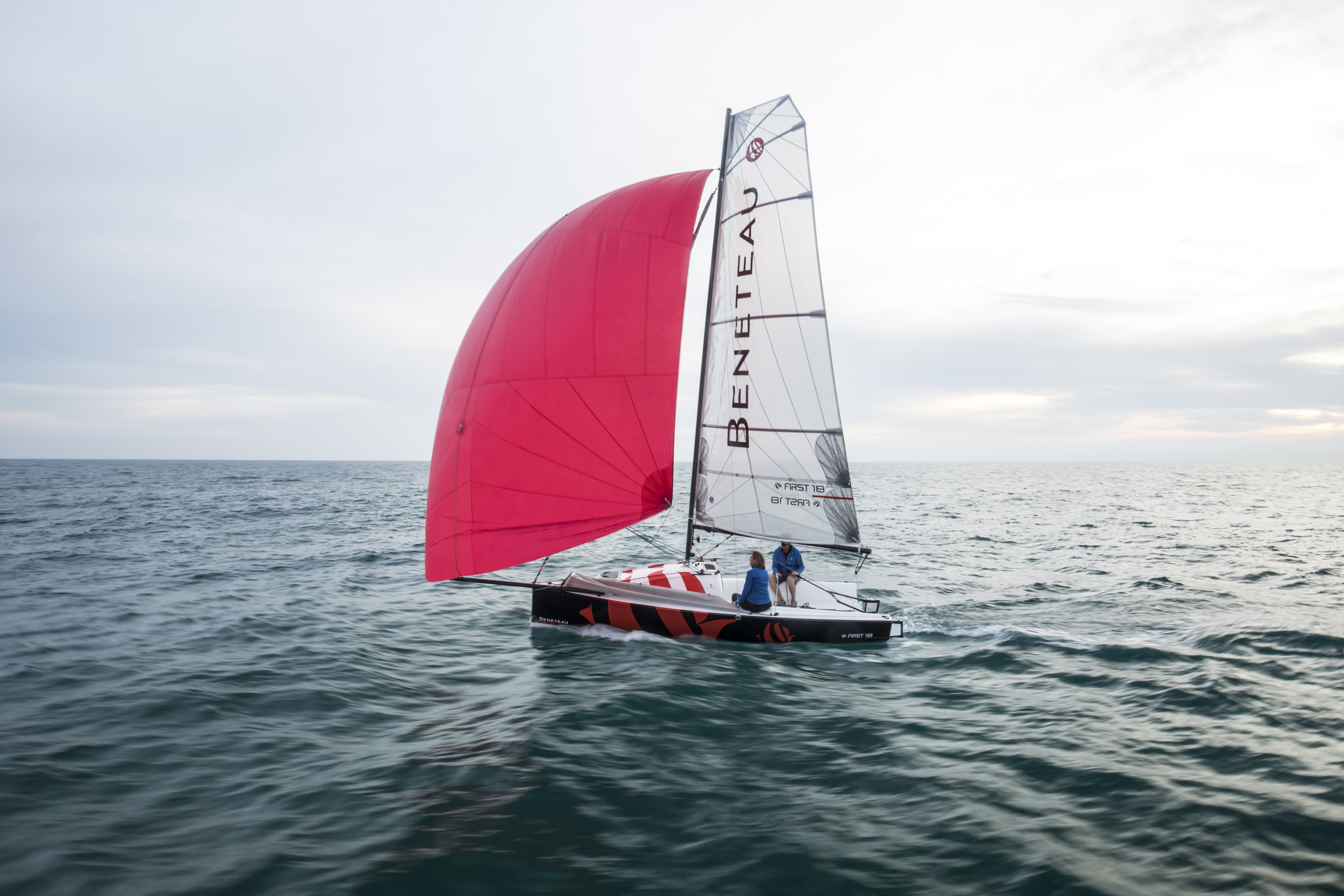 A large progressively chined hull gives you a taste of what is to come. The First 18 offers speed and sensations, whatever your programme. Stable and lightweight, with a planning hull and high-performance rigging, the First 18 makes the most of the slightest puff of wind to reach speeds that can equal it! Stiff in a breeze, she is also perfectly at ease when the wind picks up. Certified for four people aboard, the First 18 handles easily with a crew of two or solo, even under spinnaker. Thanks to her lifting keel, you can beach wherever you want..