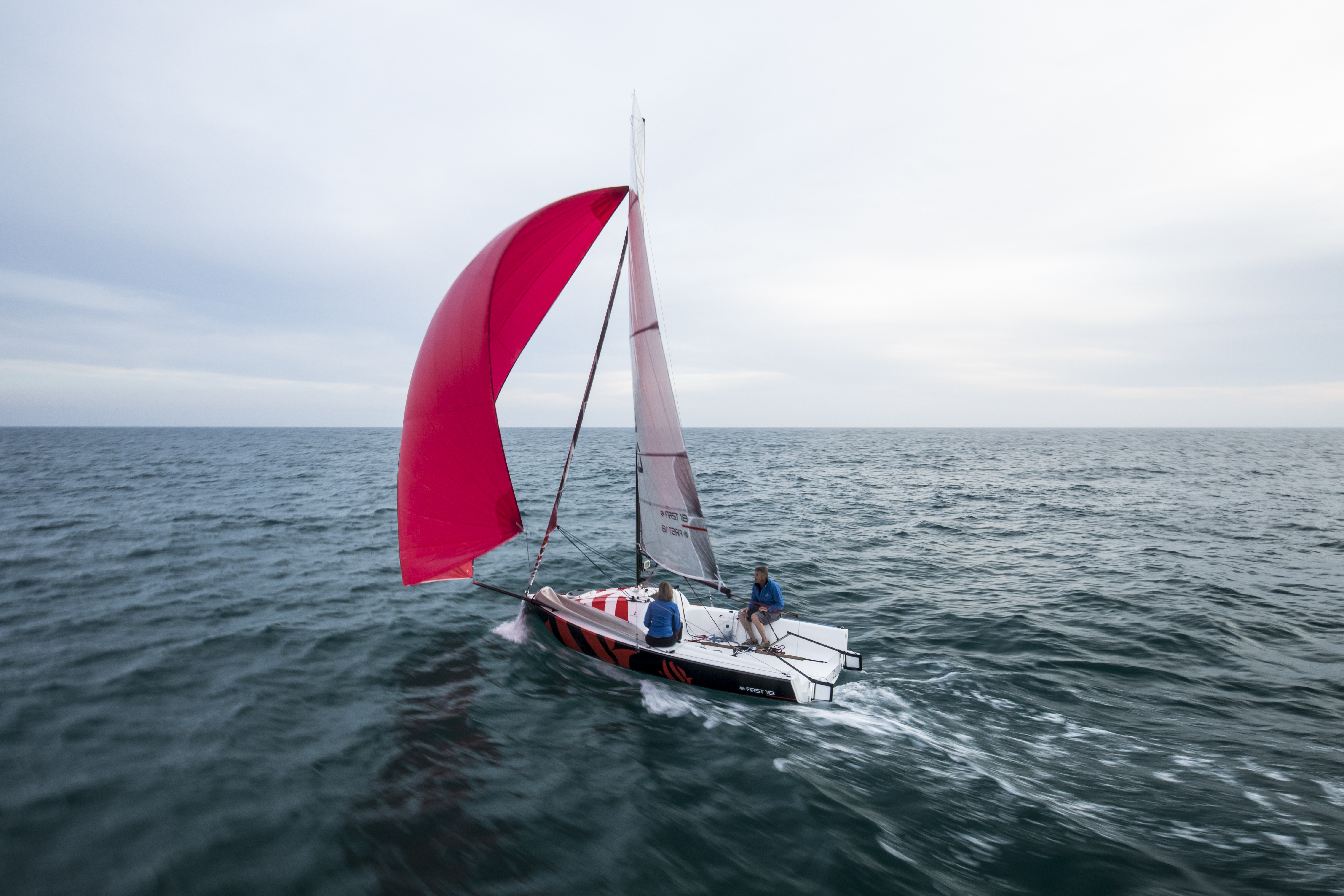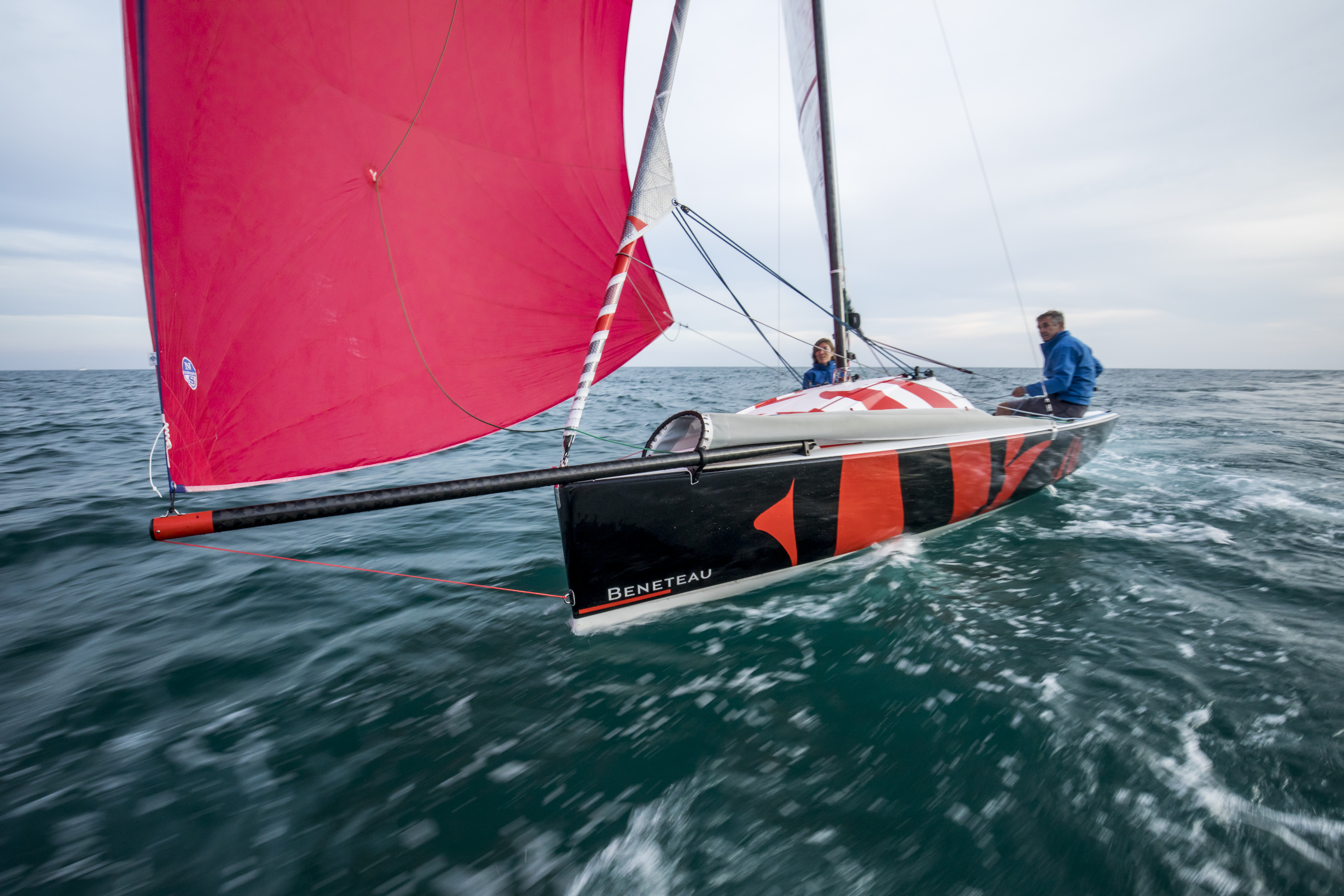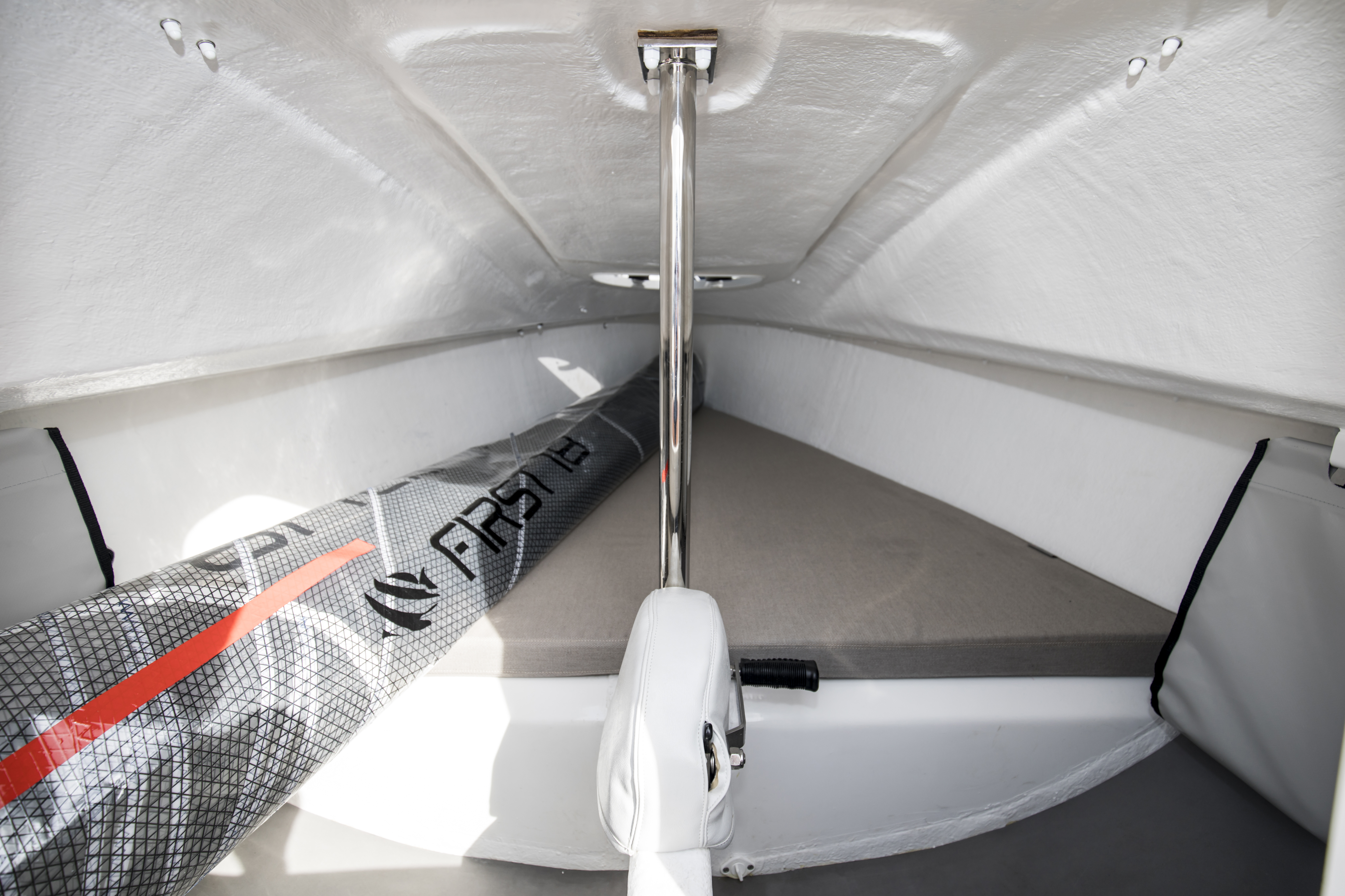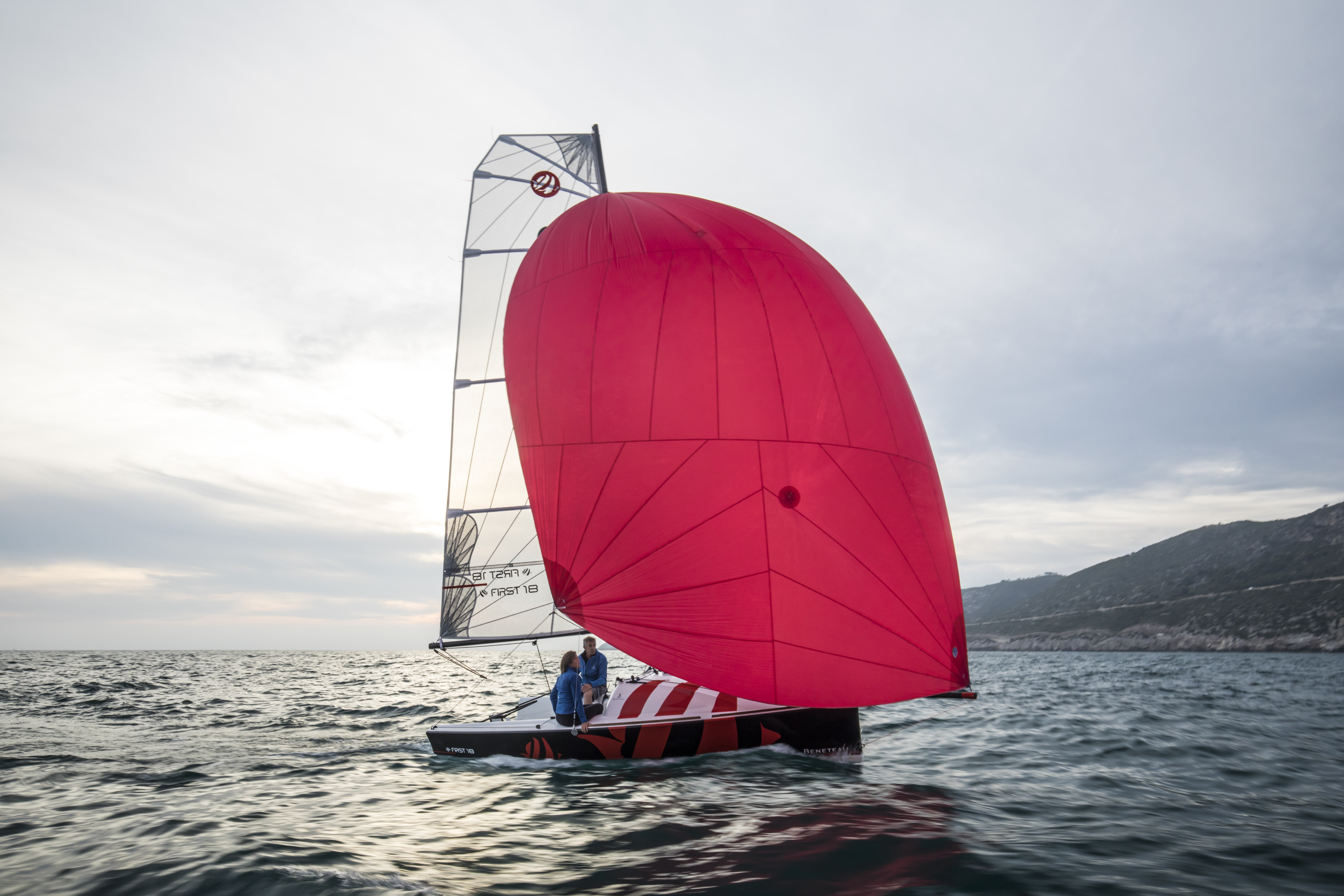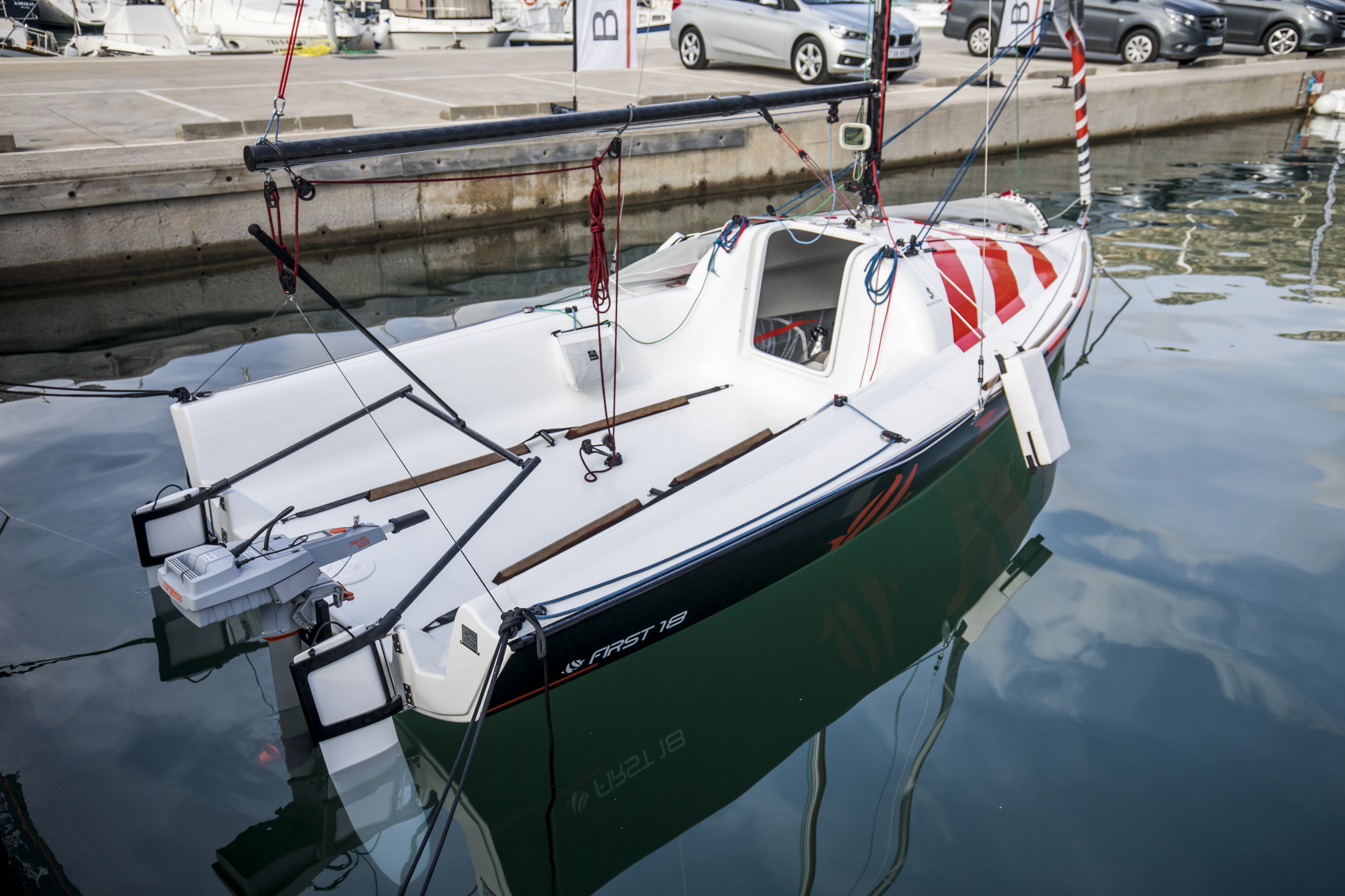 A large progressively chined hull gives you a taste of what is to come. The First 18 offers speed and sensations, whatever your programme. Stable and lightweight, with a planning hull and high-performance rigging, the First 18 makes the most of the slightest puff of wind to reach speeds that can equal it! Stiff in a breeze, she is also perfectly at ease when the wind picks up. Certified for four people aboard, the First 18 handles easily with a crew of two or solo, even under spinnaker. Thanks to her lifting keel, you can beach wherever you want..
