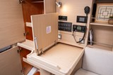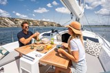 To retain easy handling shorthanded, all the rigging is brought back to the two aft winches. Only the halyards remain grouped around the coachroof. All the instruments, including a 7-inch plotter can be found on the starboard helm console.