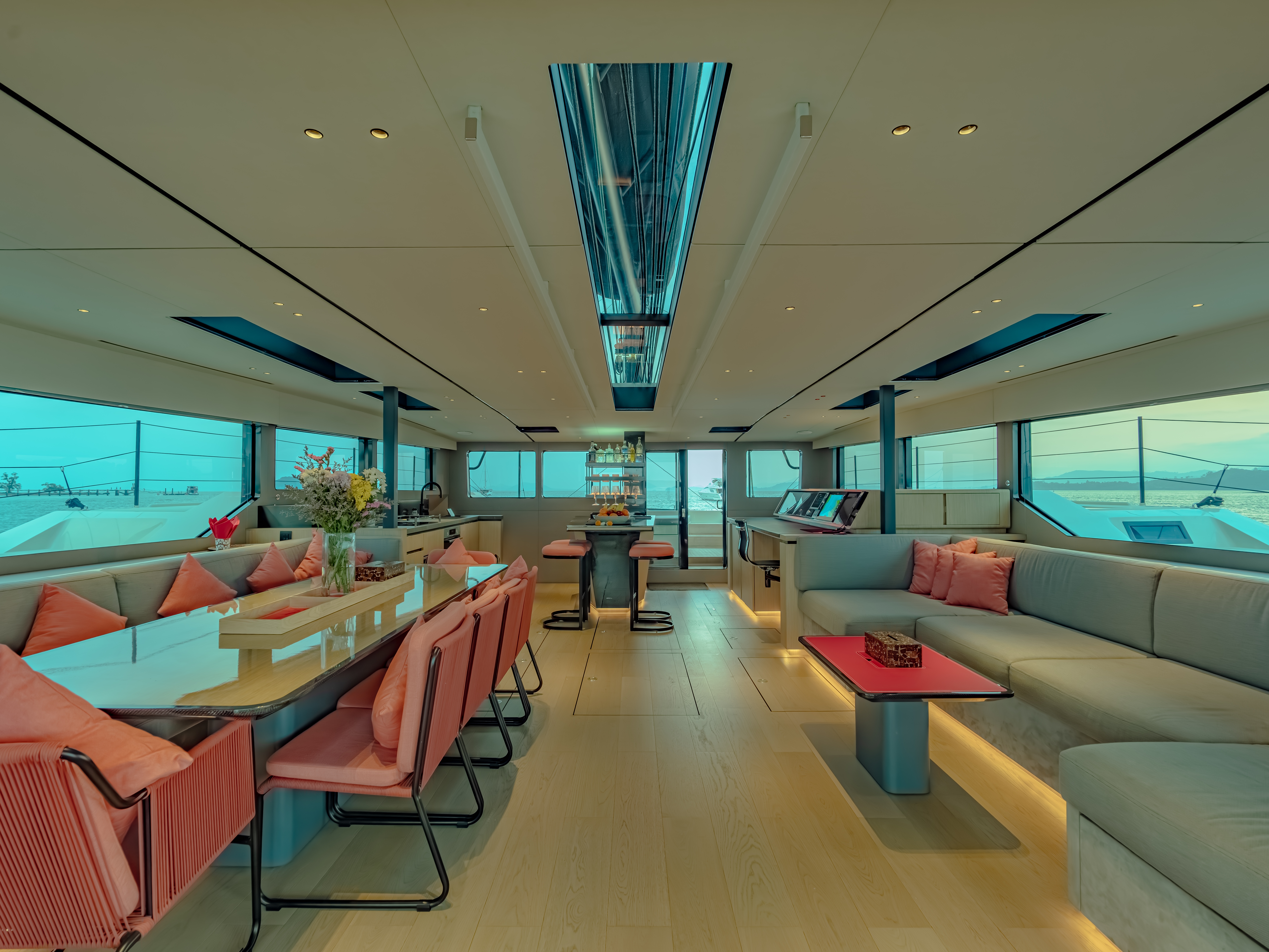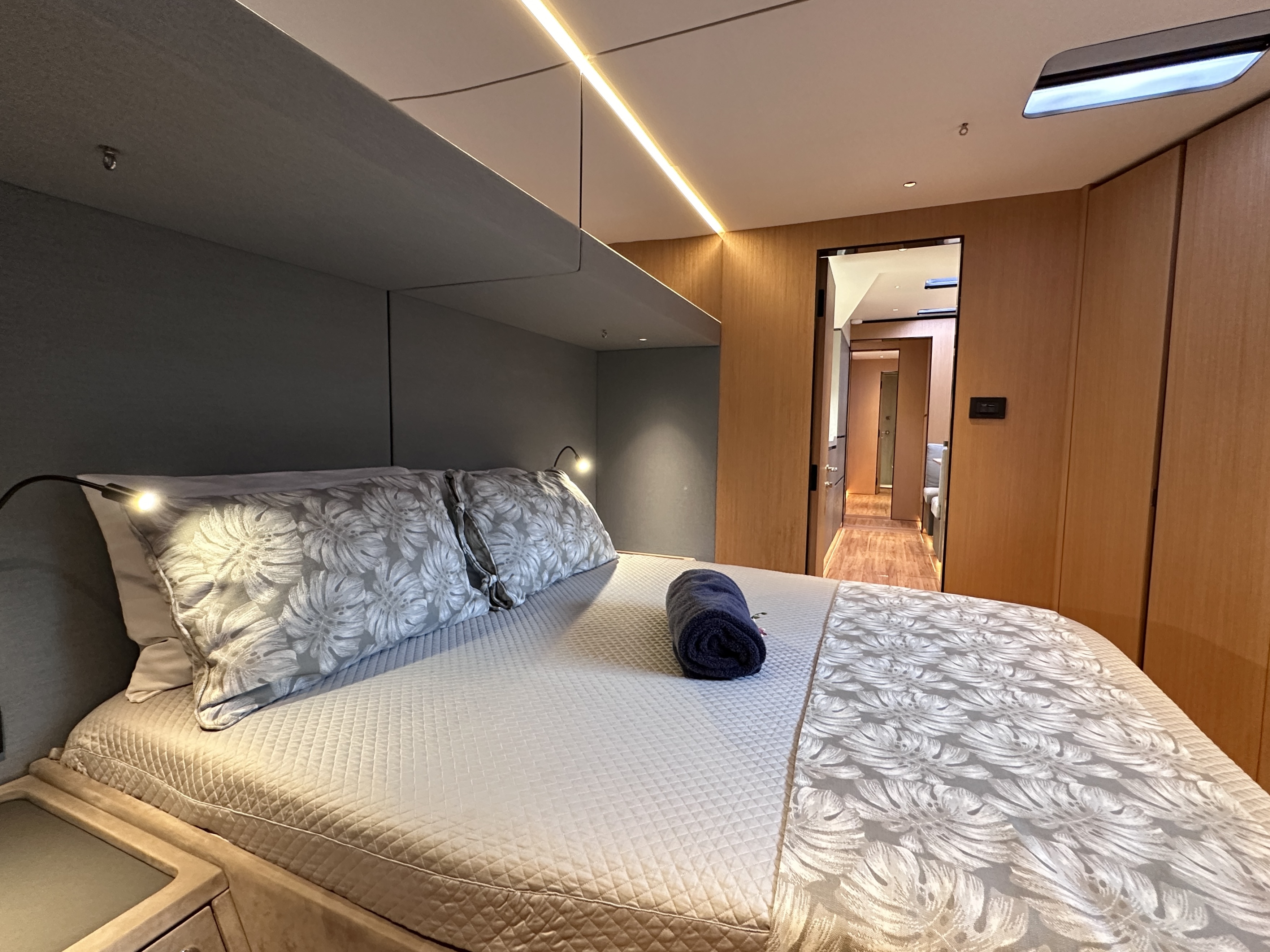 The open-plan interior can be tailor-made, with bespoke pieces that meet the client’s request for convenience and versatility as well as designer aesthetic. McConaghy pride themselves on their versatile abilities, able to customise any yacht concept to suit an individual client’s needs. This first MC75 features a huge saloon lounge with a dining area and walk-around bar, a spacious aft deck with sofas and al fresco dining space, and cushioned sun pads forward of the superstructure. There are five seaward-facing berths, all en suite, as well as a crew cabin – adjacent to the galley in the port hull.