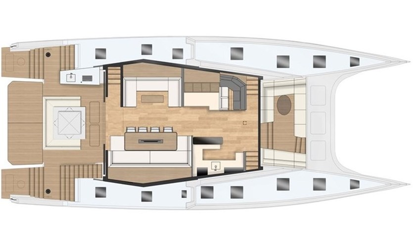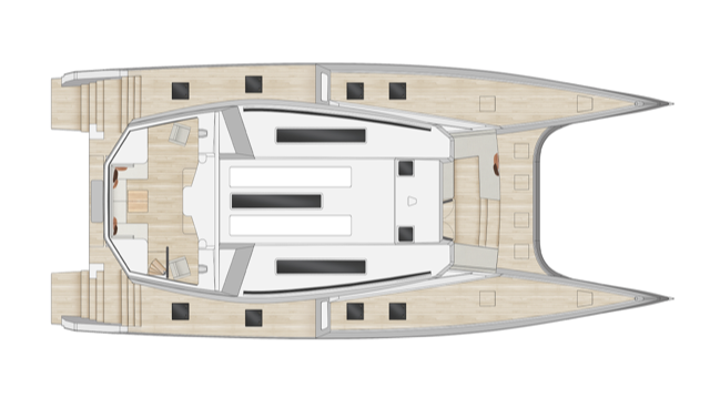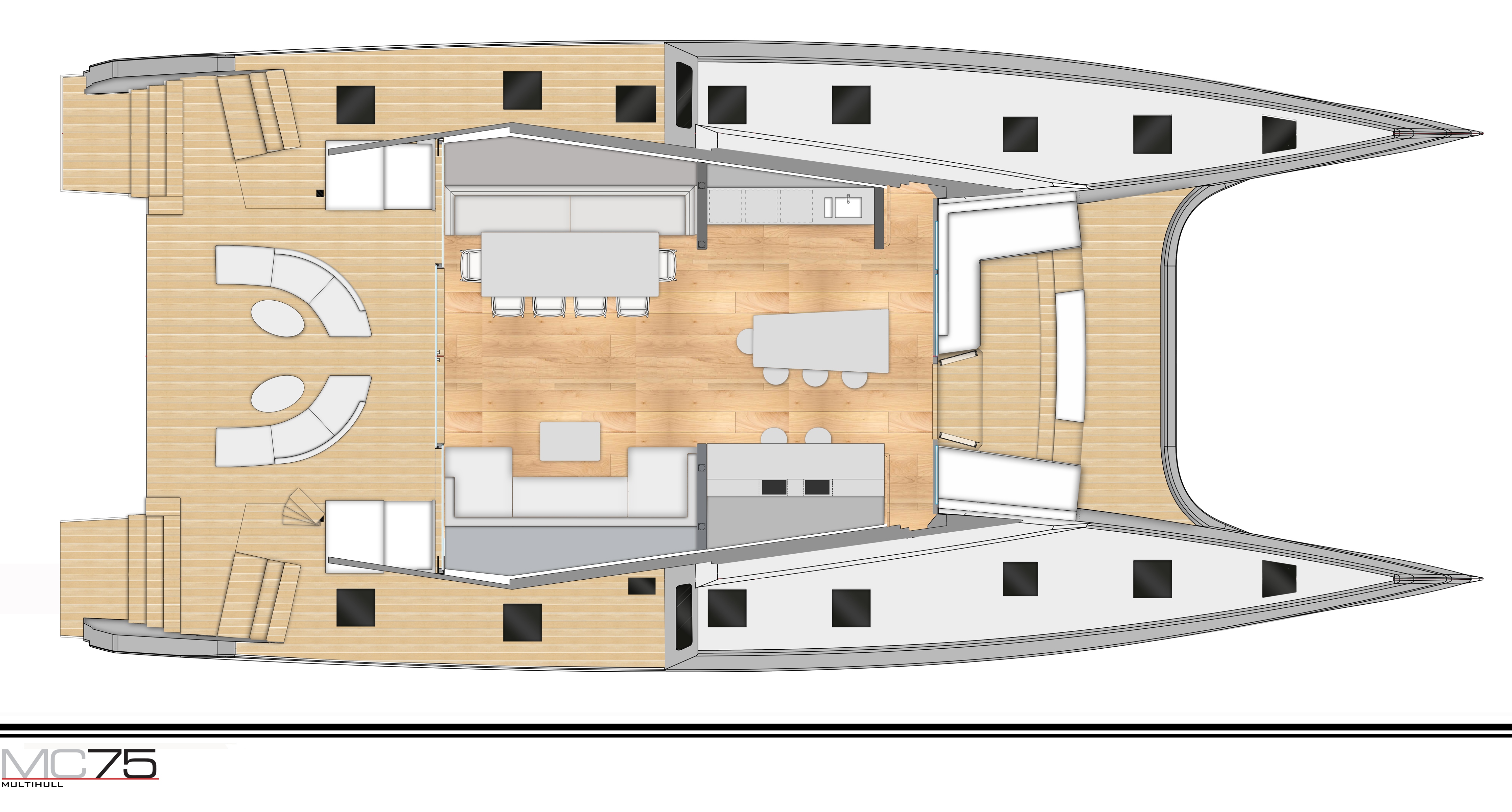 The progressive exterior lines follow those of other models in the Multihull series, with an appealing flybridge that can be ranged forward in a more aggressive styling or extended aft for a sweeping, sleeker look. Performing with an effortless grace even in light airs, the MC75 provides smooth sailing prowess with stability and enviable speed. In 20kts of wind at 110 true wind angle, the MC75 is predicted to reach 21kts of boat speed with a code zero sail.