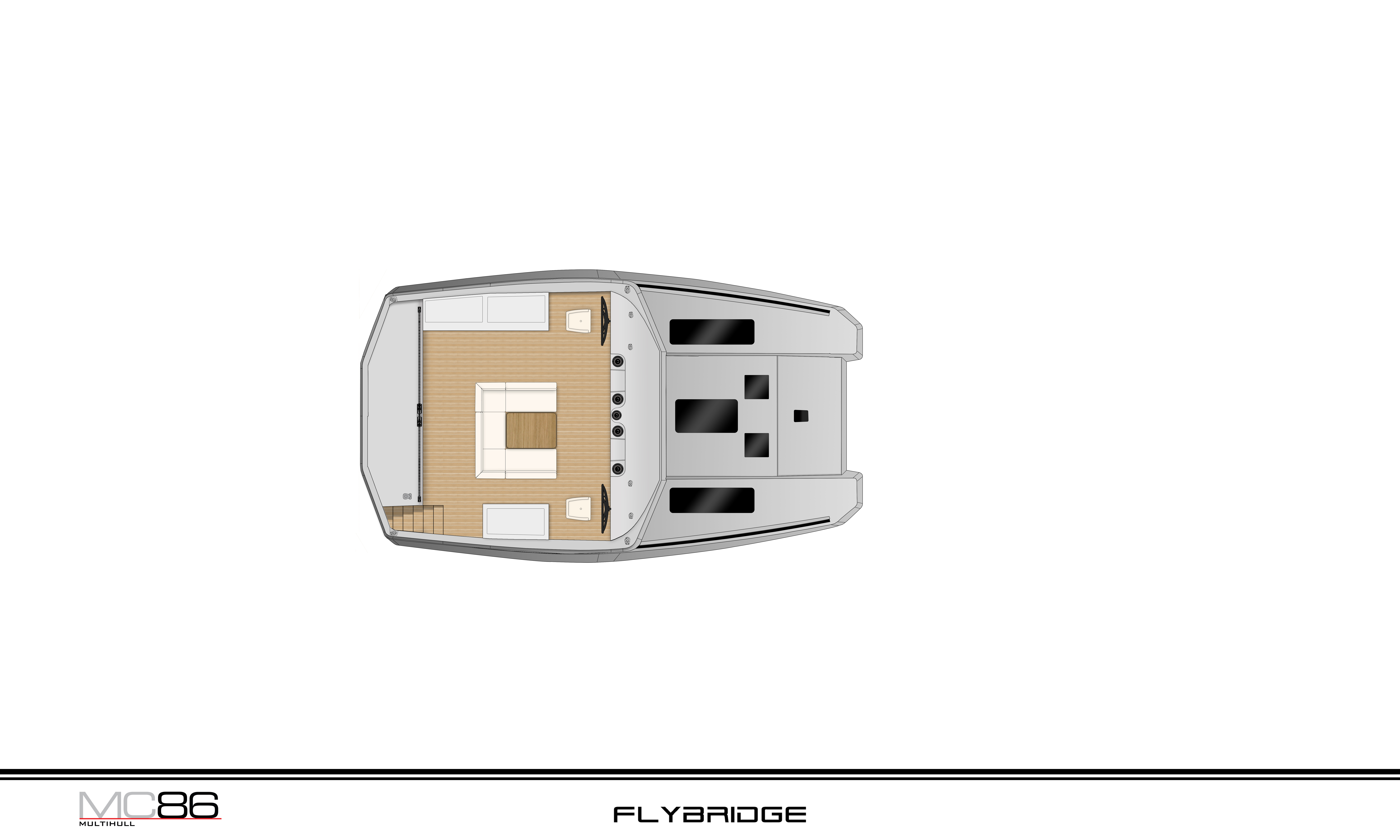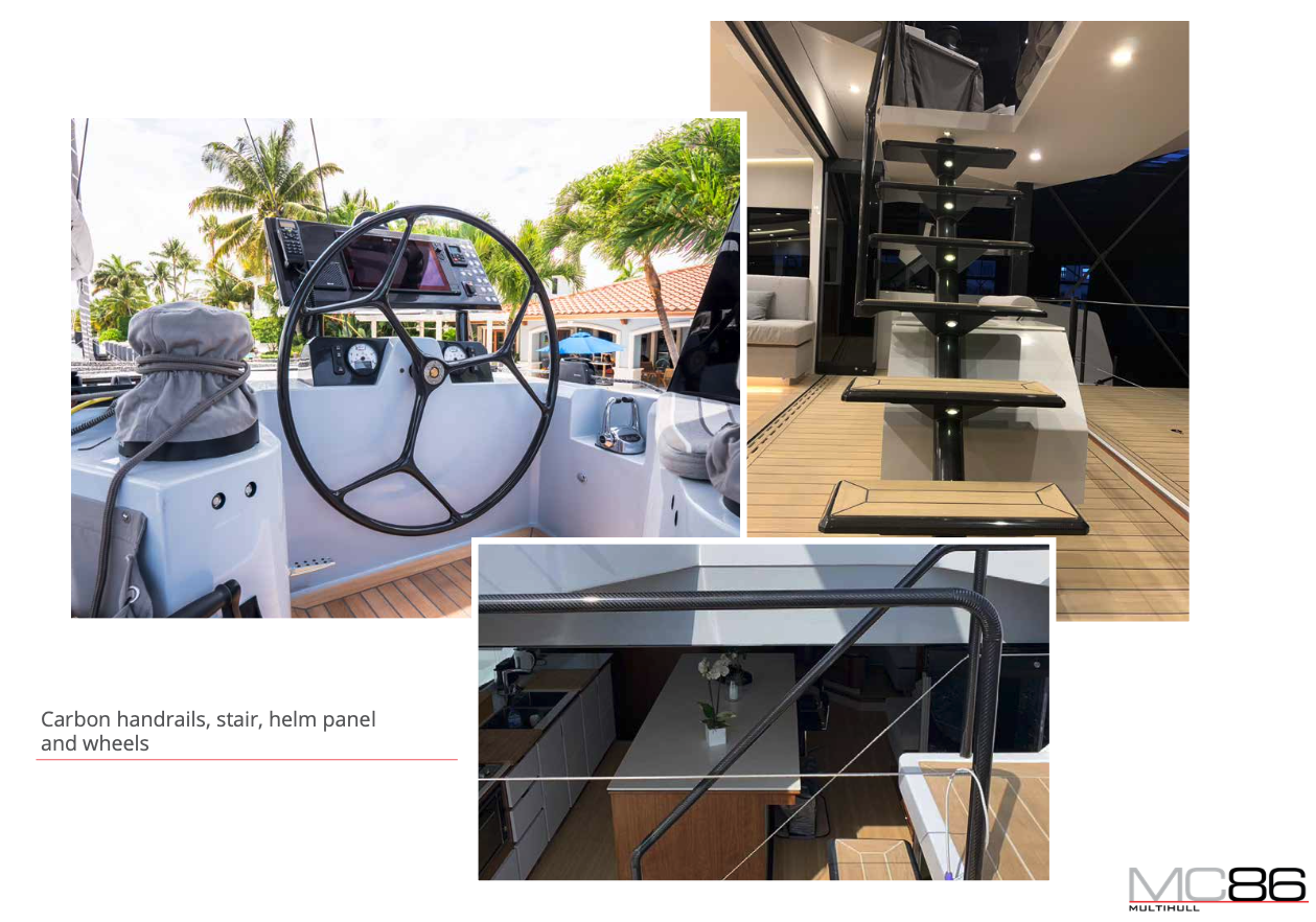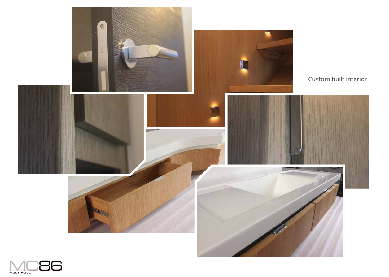 The MC86 whilst remaining true to McConaghy's identifiable exterior lines and key performance attributes, is a full-custom yacht in build philosophy. This allows owners to set out the interior’s general arrangement and equipment in a way that is unique to their own requirements, with multiple bespoke options. A true "wind speed" catamaran, the MC86 has an extensive range under power as well with up to 2,000 nm at economical revs. Her bespoke carbon centre boards allow her to point much higher than other cats, yet are safely housed below decks in their carbon watertight boxes. The MC86 benefits from many of the yards in house production, with extensive use of carbon and bespoke interiors from m2Atilier. A serious, capable offshore catamaran indeed.