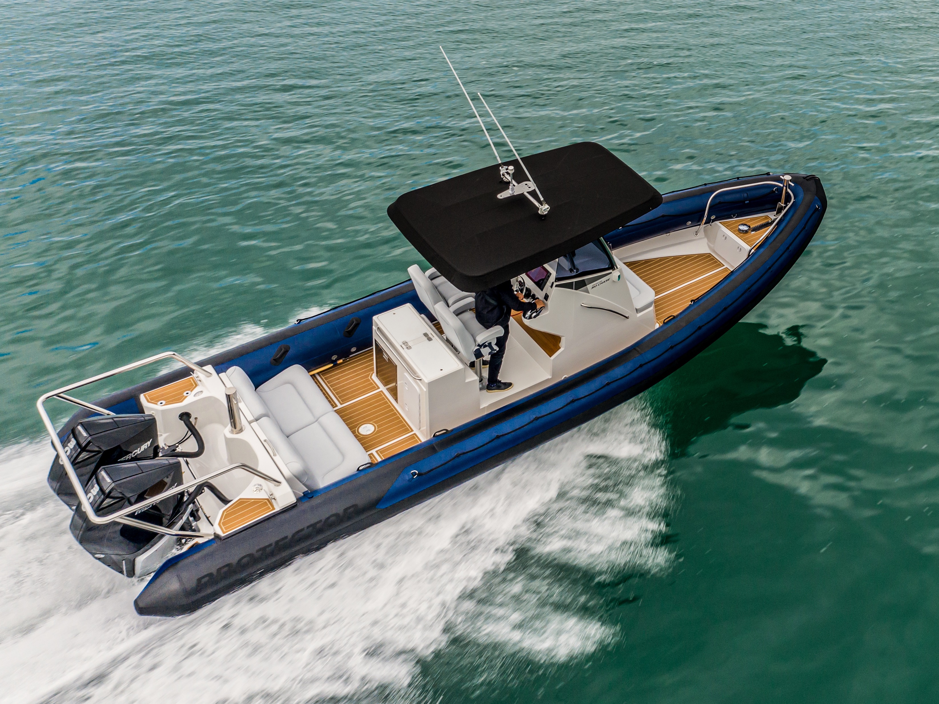 The Protector 330 Chase is a high performance centre console RIB which has found popular application in the world’s largest sailing events and latterly, recreational & commuter use. Its extended hull and advanced design means the Protector 330 Chase rides smoothly at high speeds, even in rough seas while its full sized Bimini top and front screen offers shelter from the weather. Larger fore and aft deck space means you have plenty of room for family & guests and storage for all their kit.