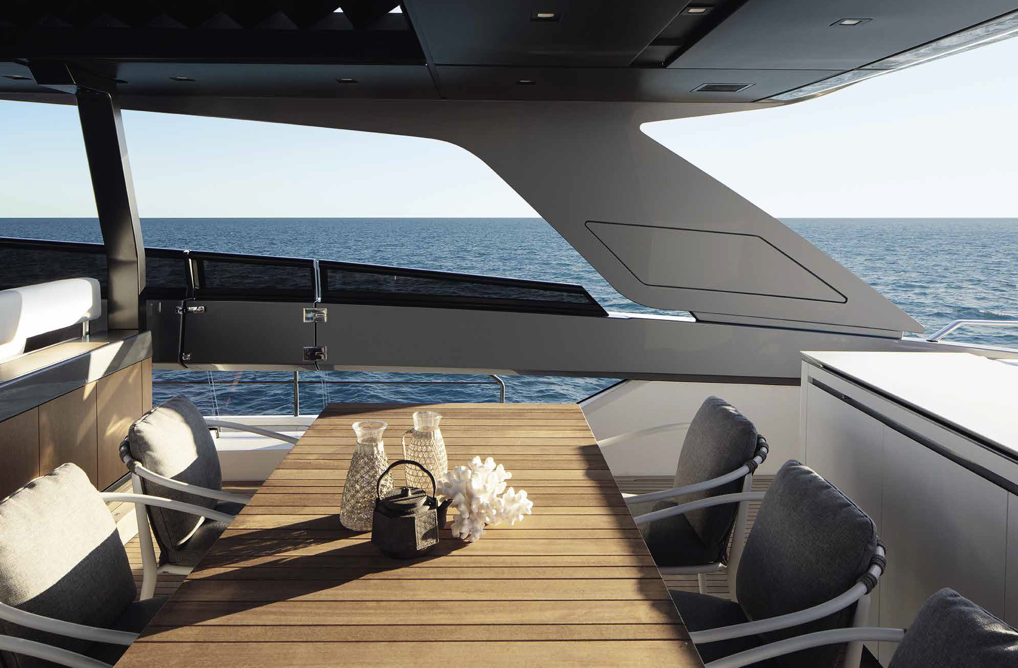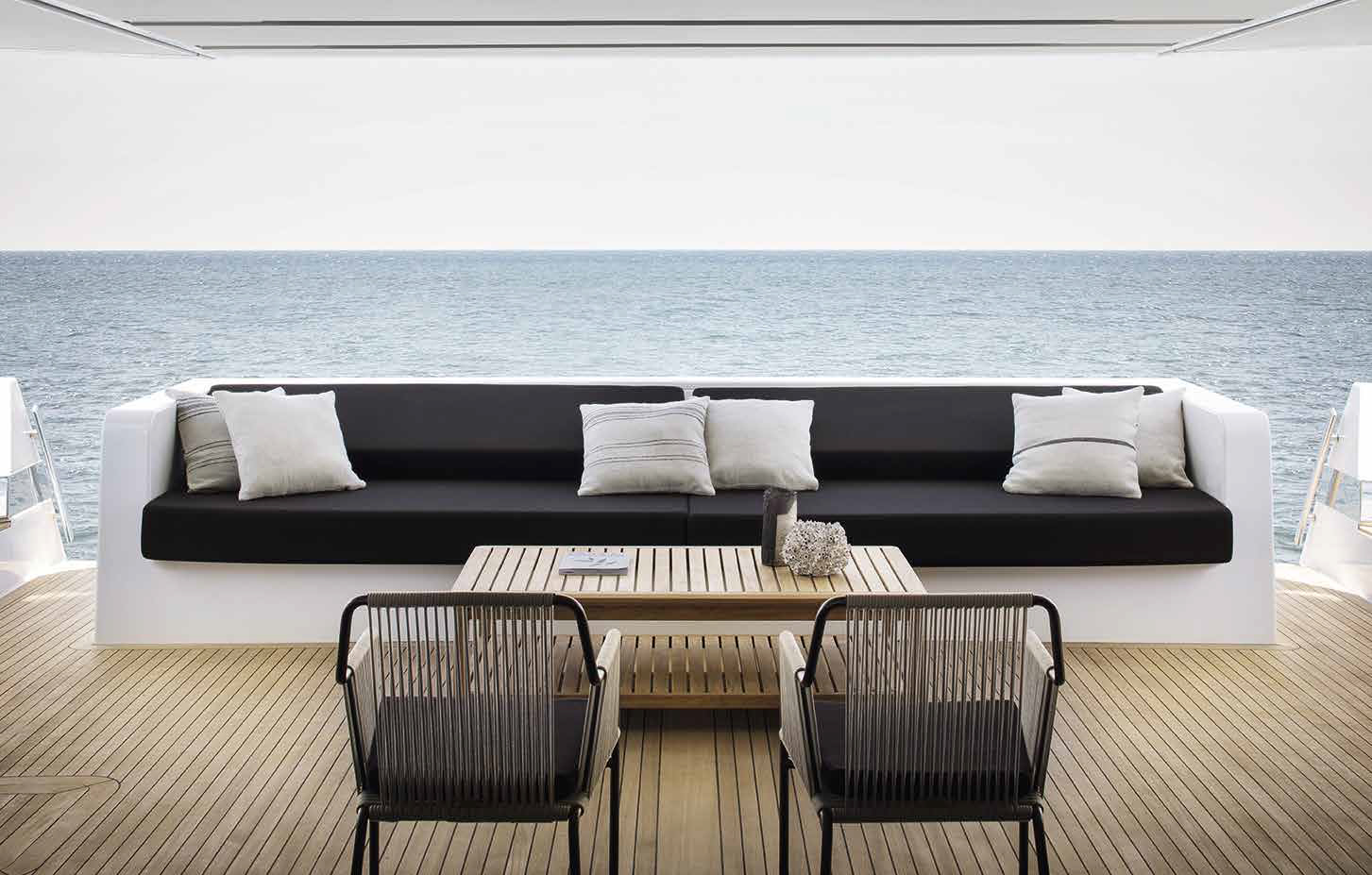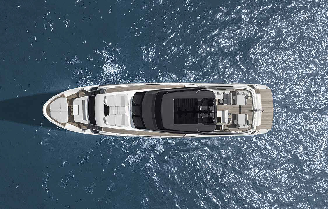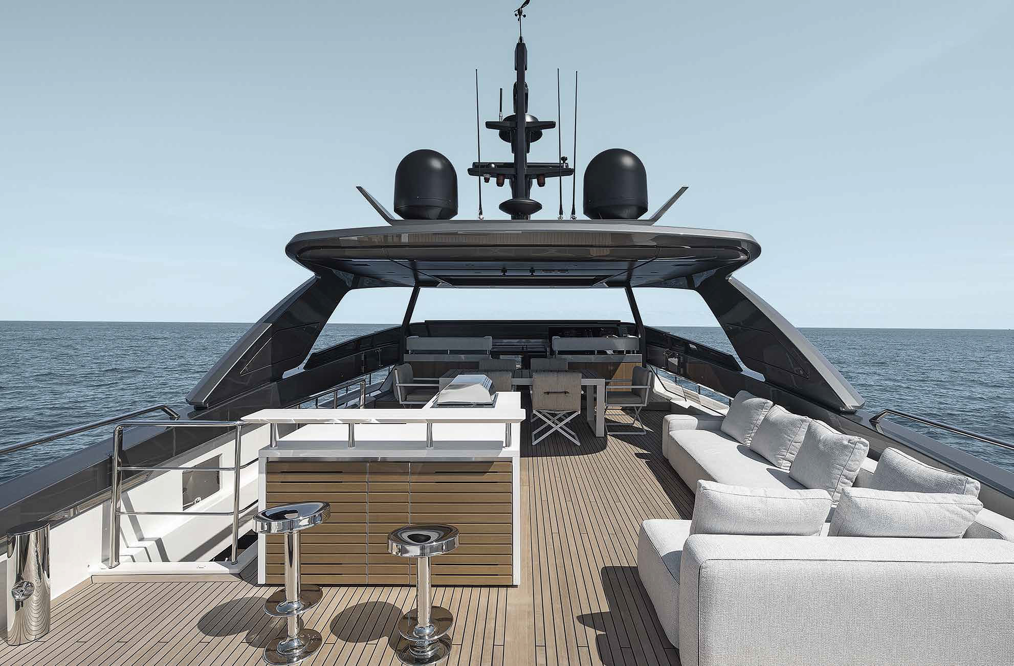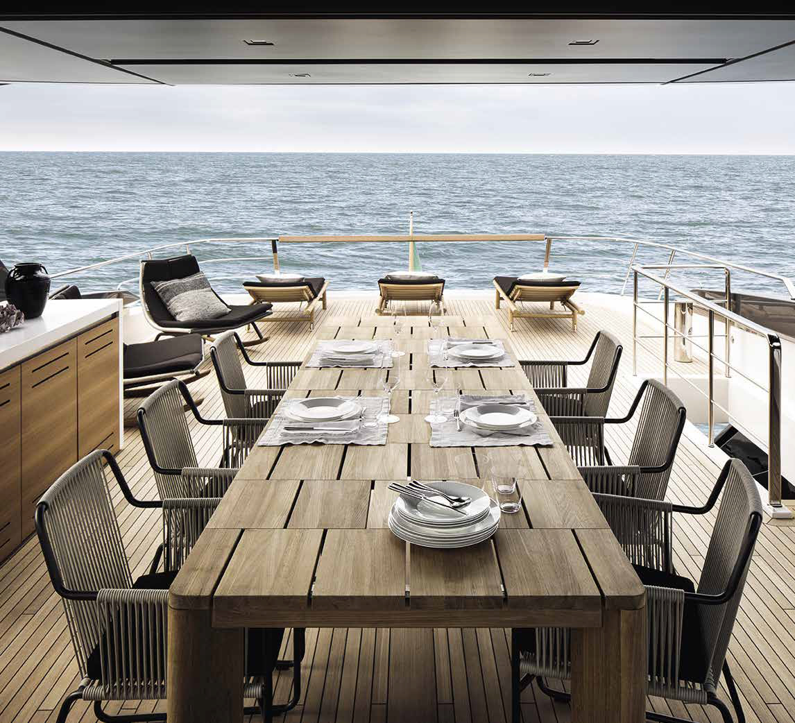 The innovative configuration increases interior volume, creating a more expansive and versatile onboard environment. This additional space allows for a redefined stern garage, offering increased capacity for tenders and water toys while maintaining an elegant profile. The enhanced sunbathing platform further strengthens the yacht’s connection to the sea, providing an inviting, immersive experience that blends style with practicality.