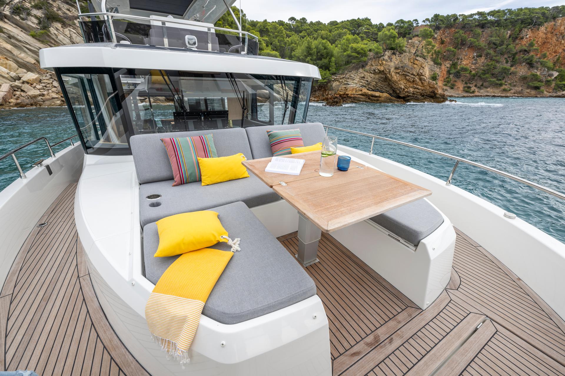 Flybridge U-shape seating with integrated storage and a folding leaf wooden table