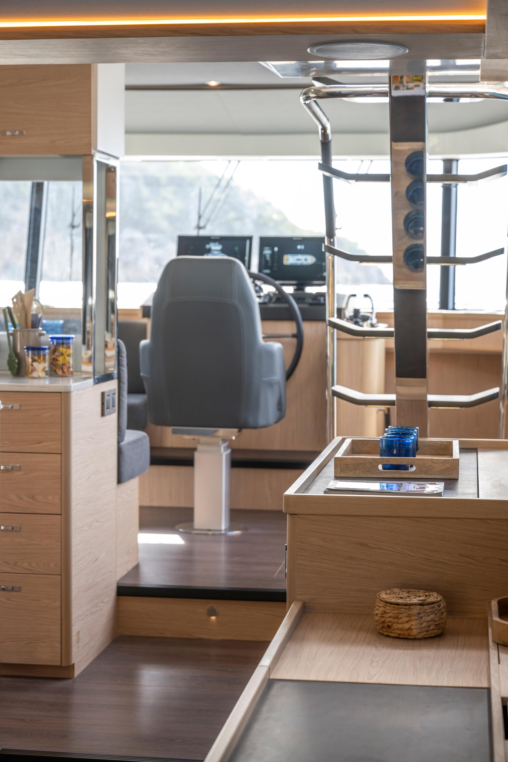 U-shaped saloon seating (2.30m x 1.37m - 7’7’’ x 4’6’’) to port in Noah 52 upholstery