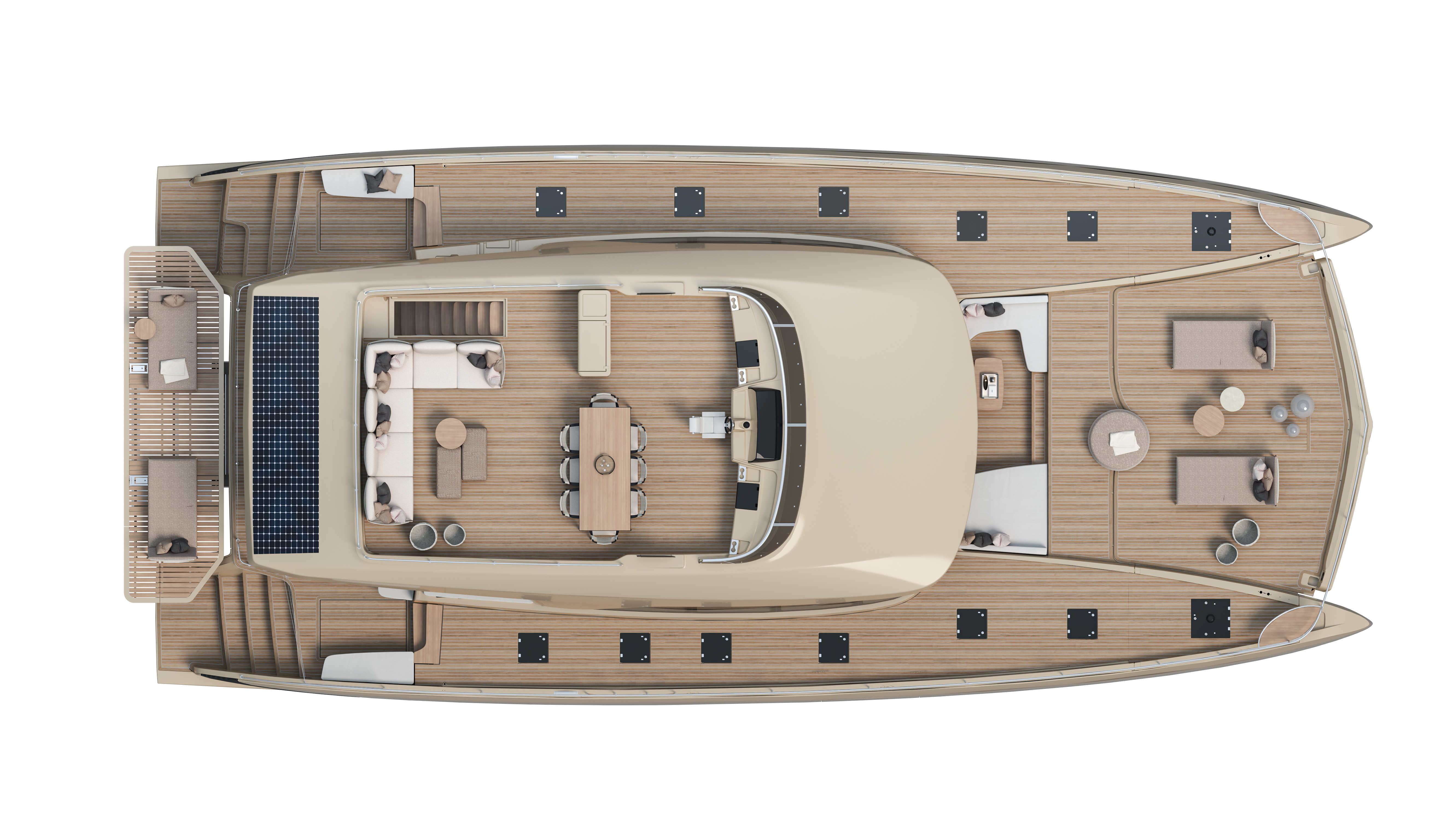 2 seating areas with storage locker under port seating (700L) and 1 large technical storage locker on starboard with access to hydraulic system (3500L)