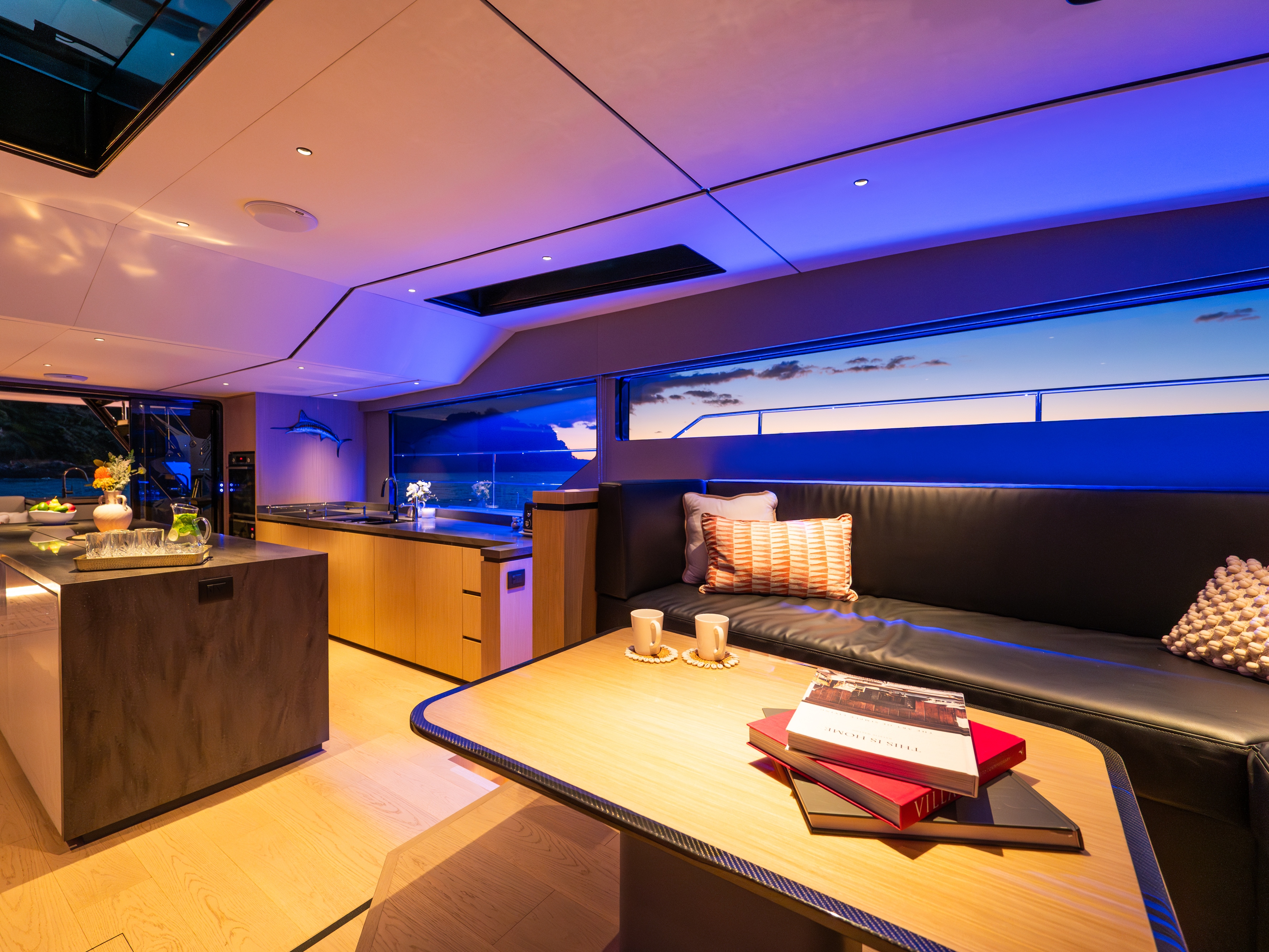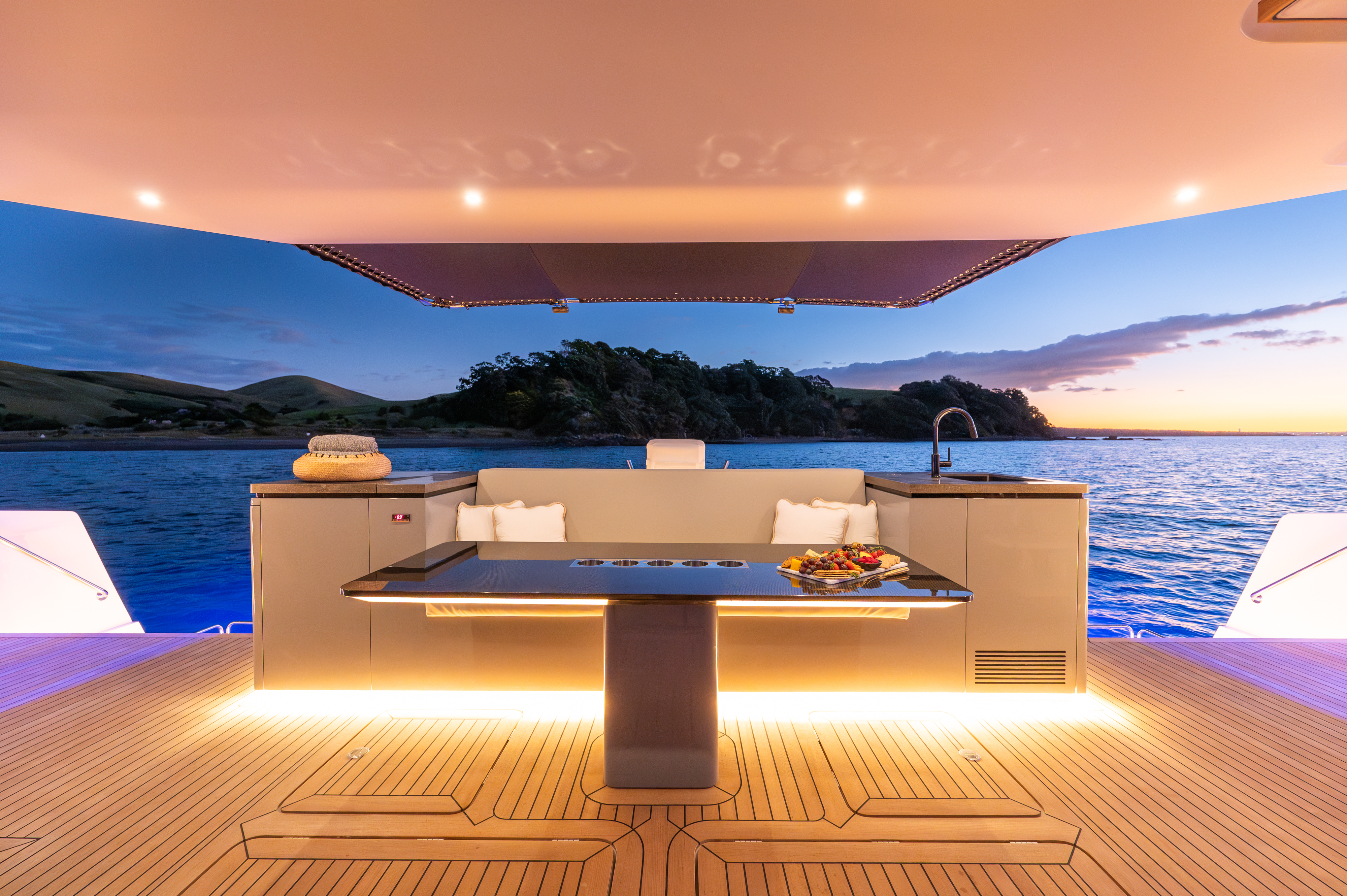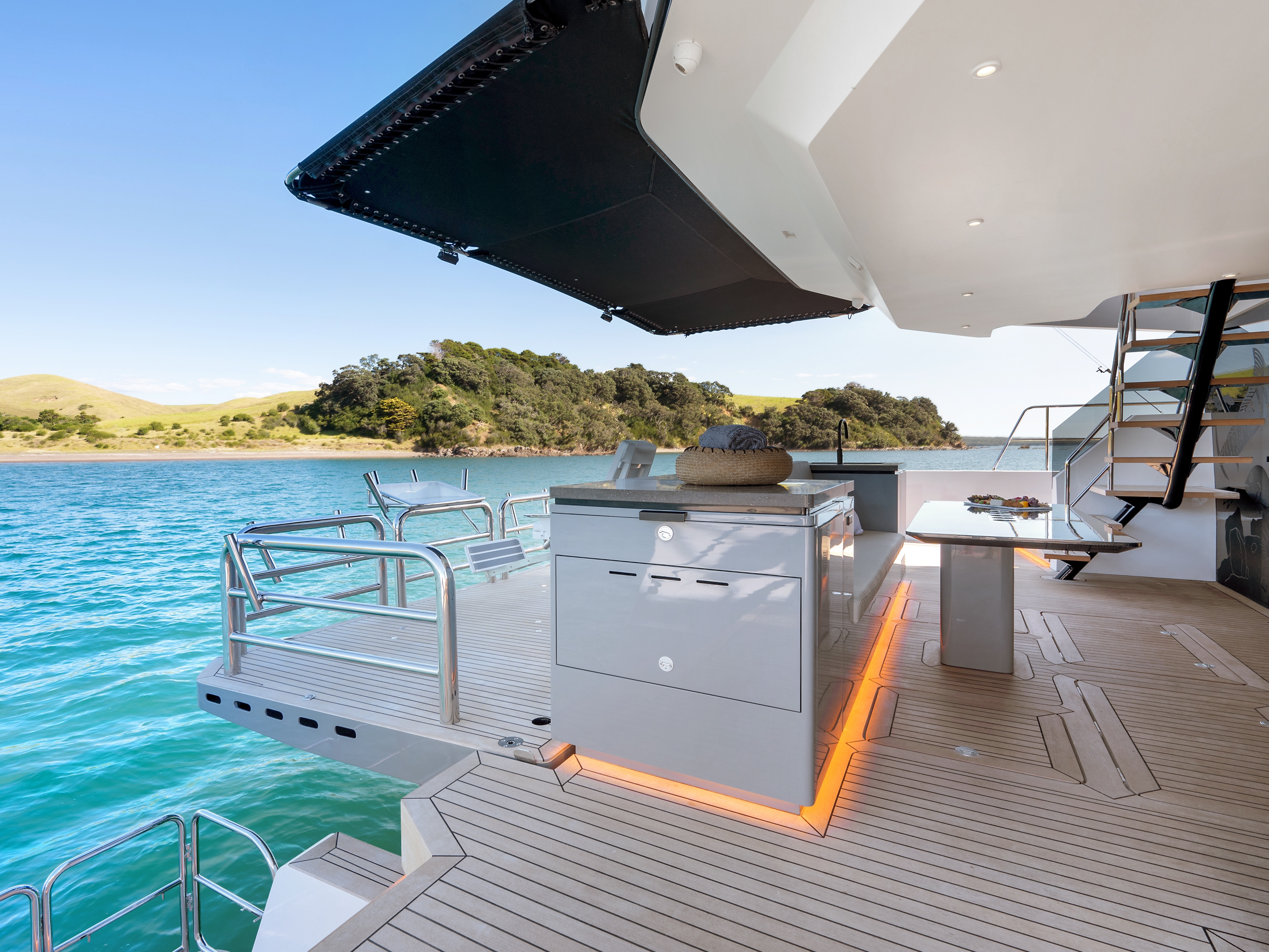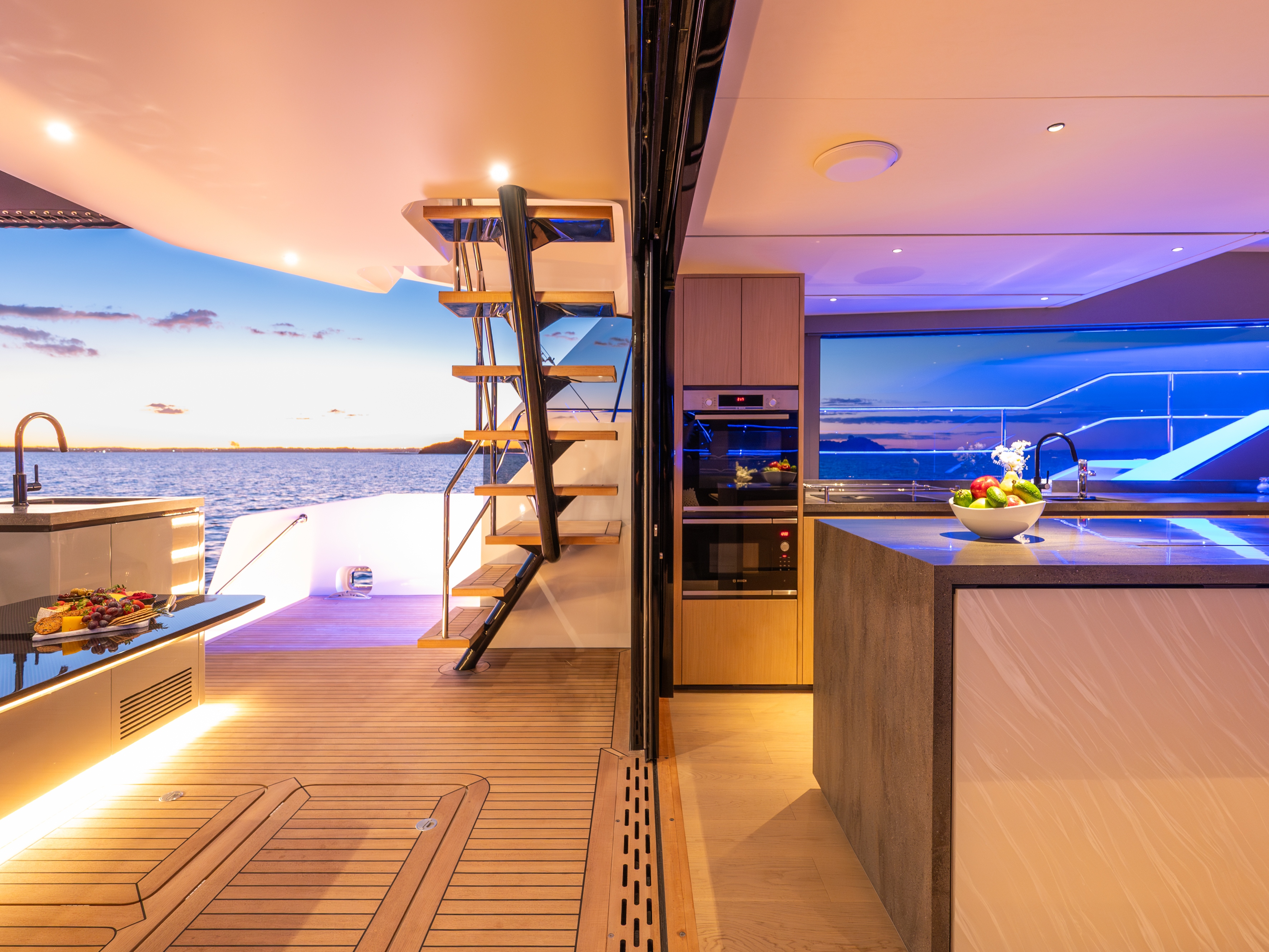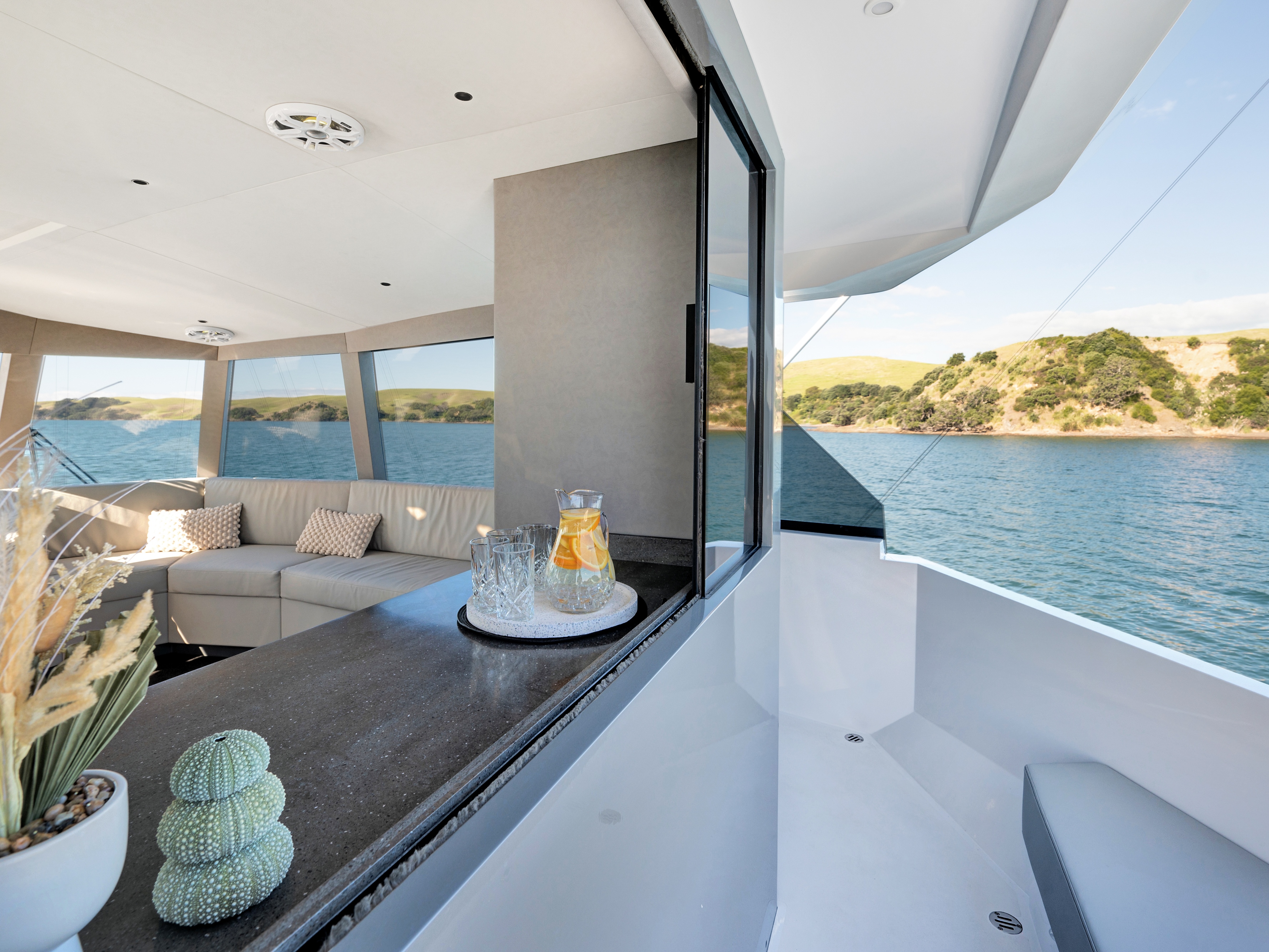 Frameless, sliding, tempered safety glass doors between saloon and aft deck