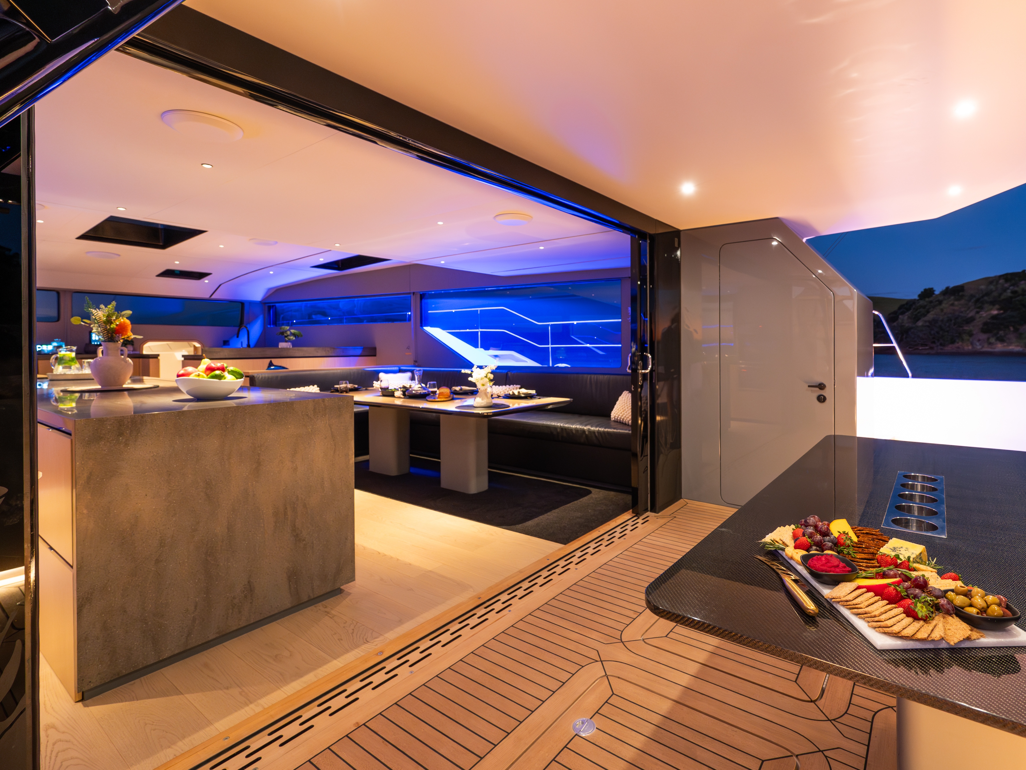 Frameless, bi-folding, tempered safety glass doors between saloon and aft deck