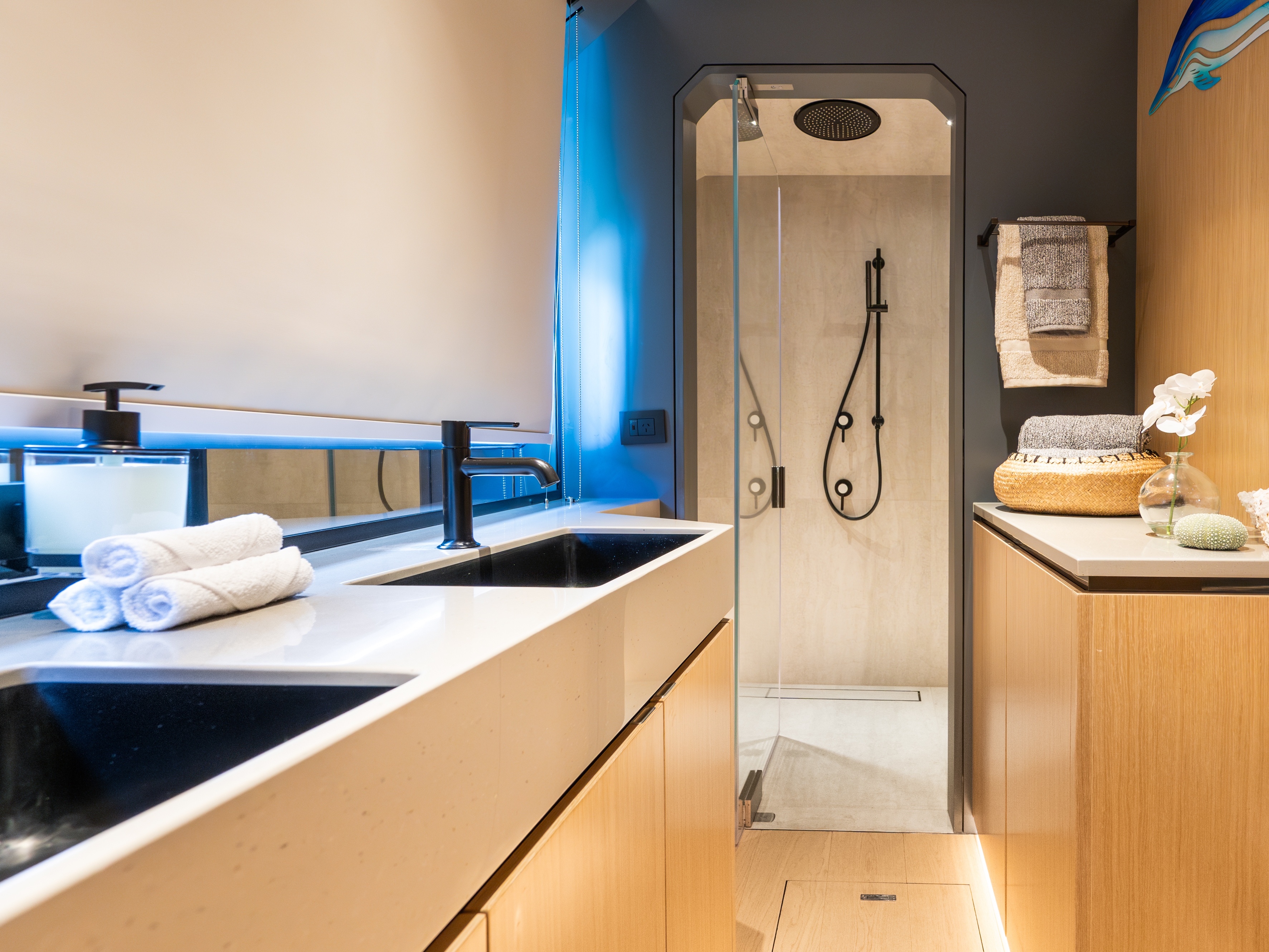Port side overhead rain shower recessed into flybridge structure, hot/coldmixer tap