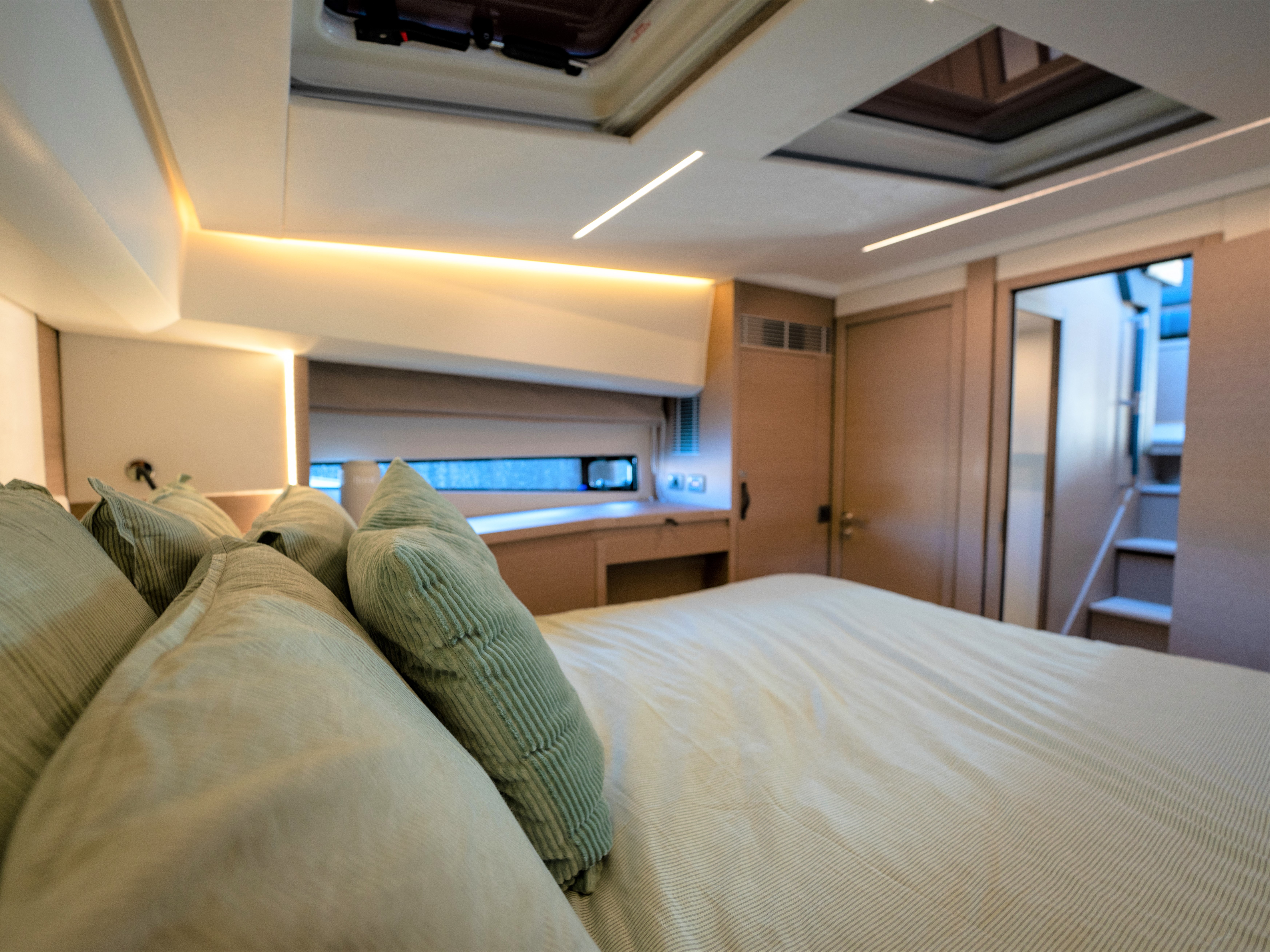 Featuring a three-cabin layout sleeping up to seven, and powered by Volvo Penta IPS600 440hp pod drives with joystick control, she is a joy to handle both at close quarters and underway.
