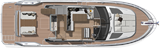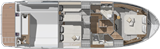 Internally, she offers a master cabin forward with king size double berth and spacious ensuite head, VIP guest cabin with a double or two single berth arrangement with ensuite and 3rd cabin with two singles. Also fitted with optional crew cabin with additional berth. The saloon has a large seating area around the dining table and the aft galley offers easy access to the cockpit which has two sofas with folding, lowerable cockpit table and access to the hydraulic bathing platform from both sides. The flybridge has aft seating, a forward sun pad and well-positioned helm station.
