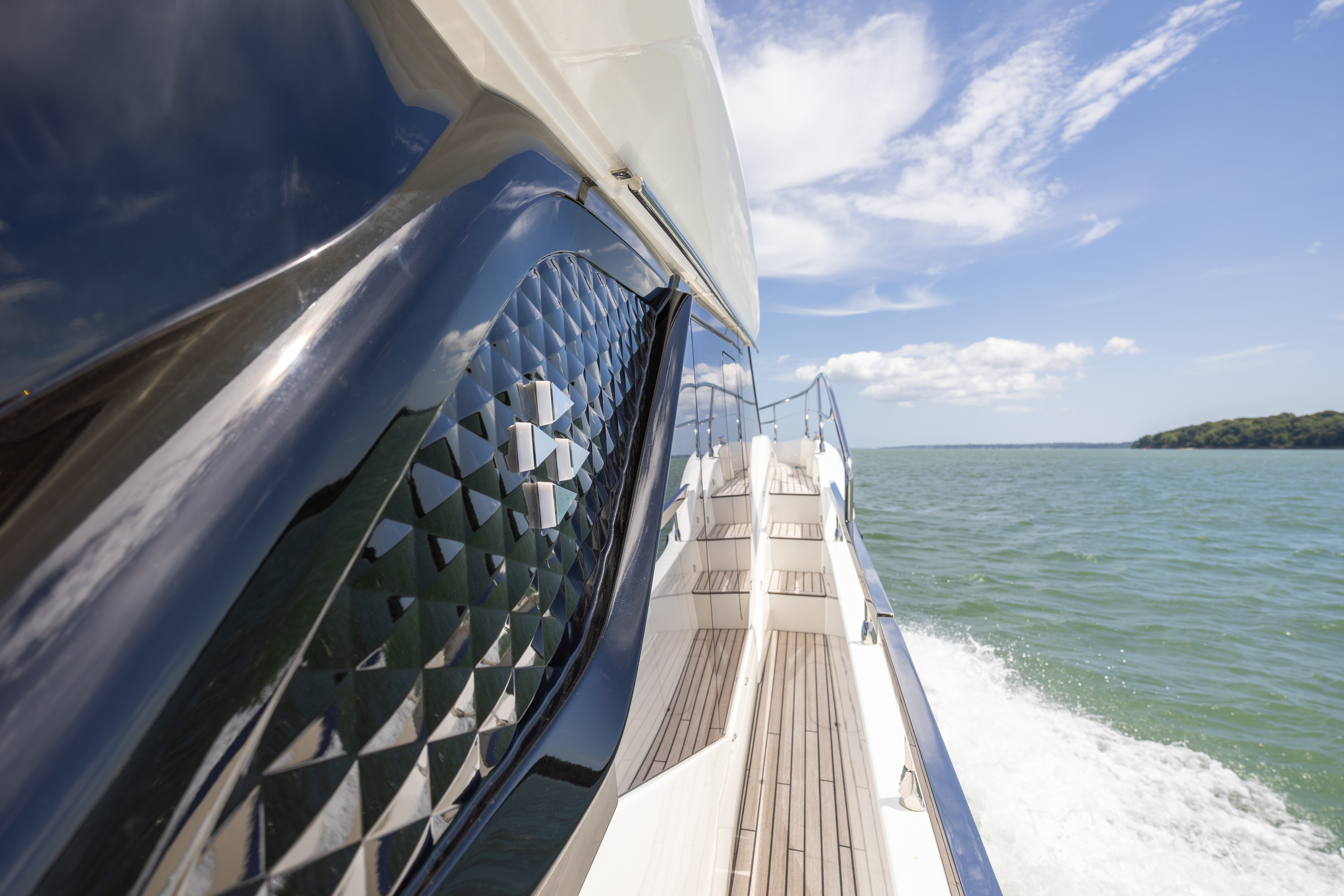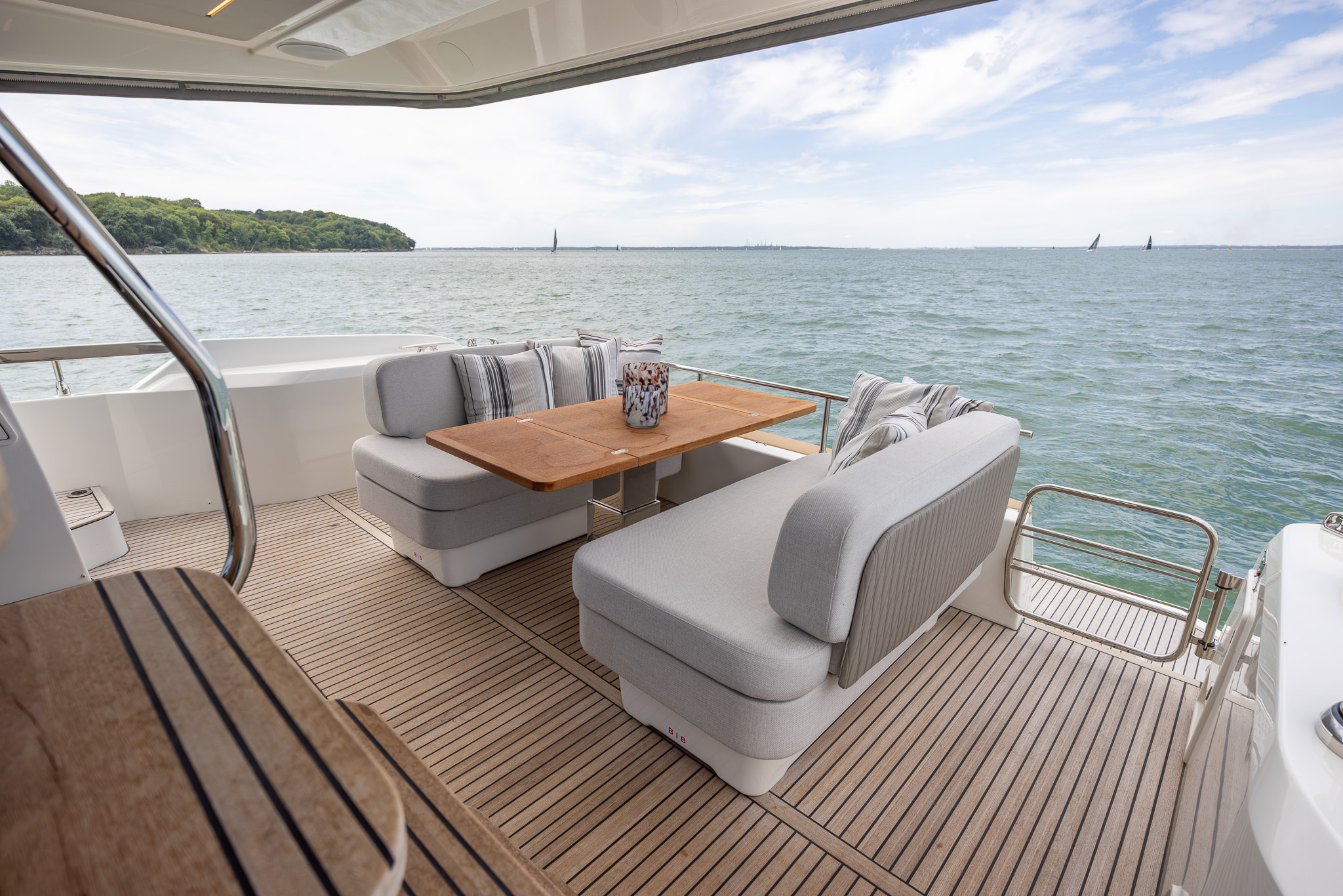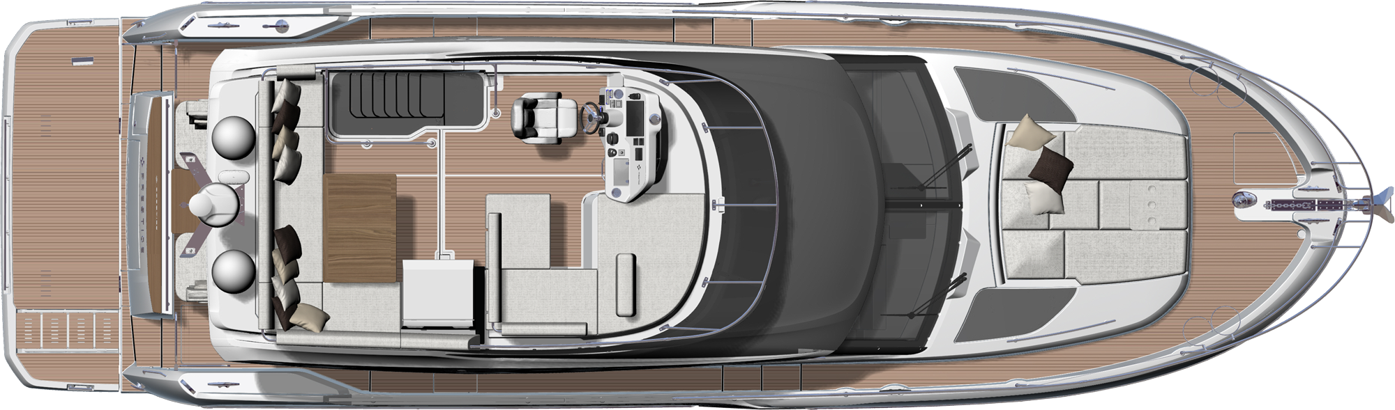 Natural wooden laid side decks, flybridge, cockpit & bathing platform