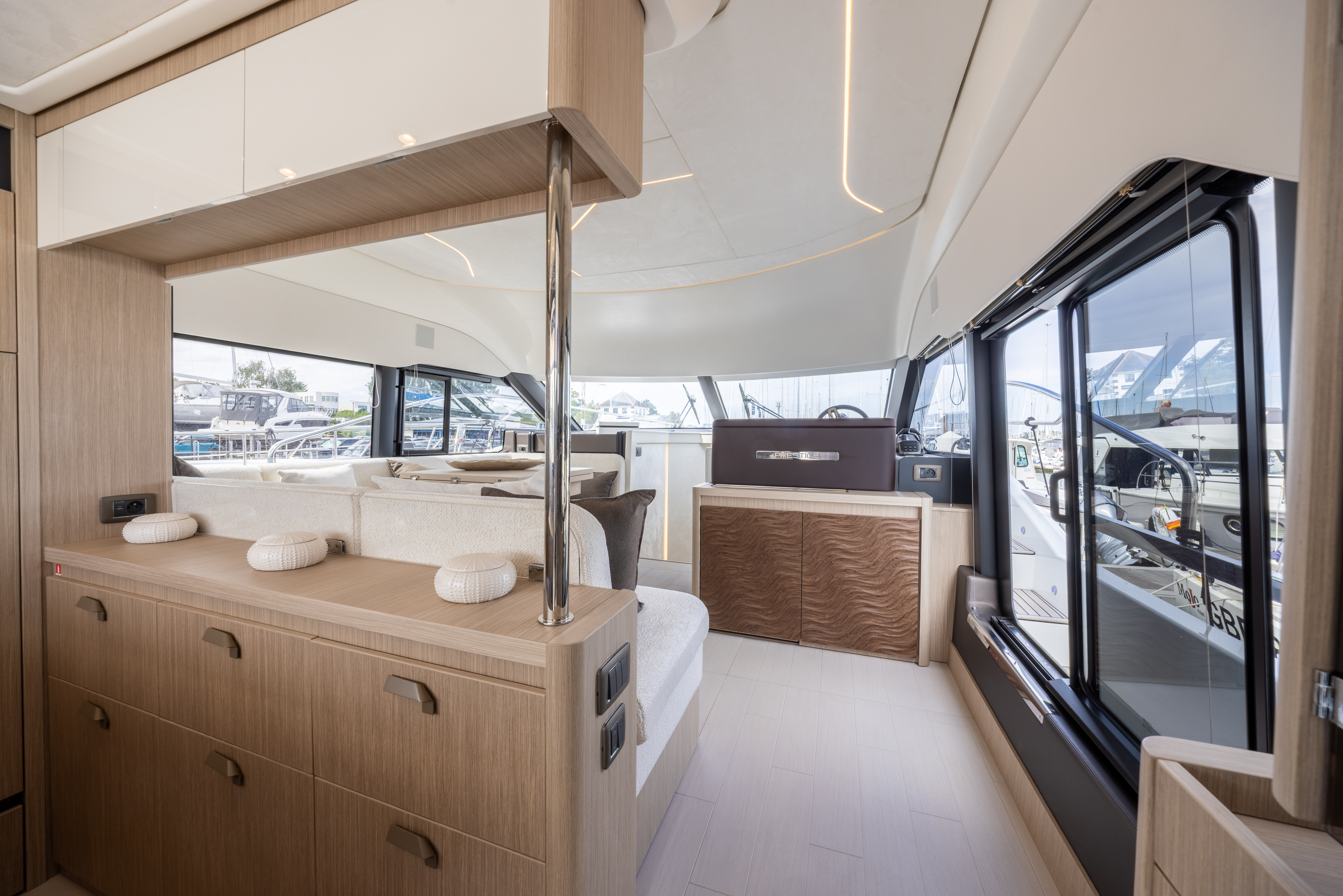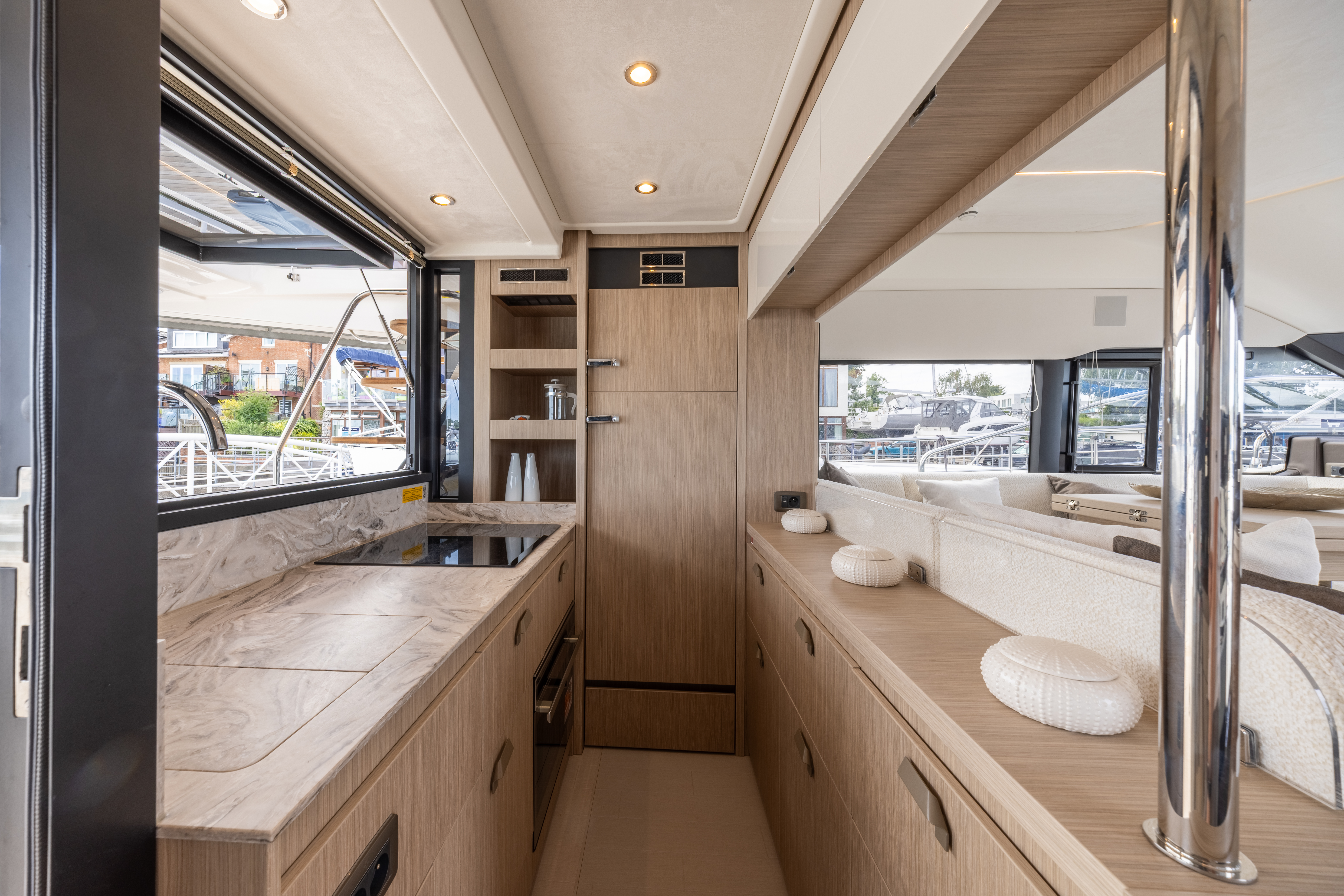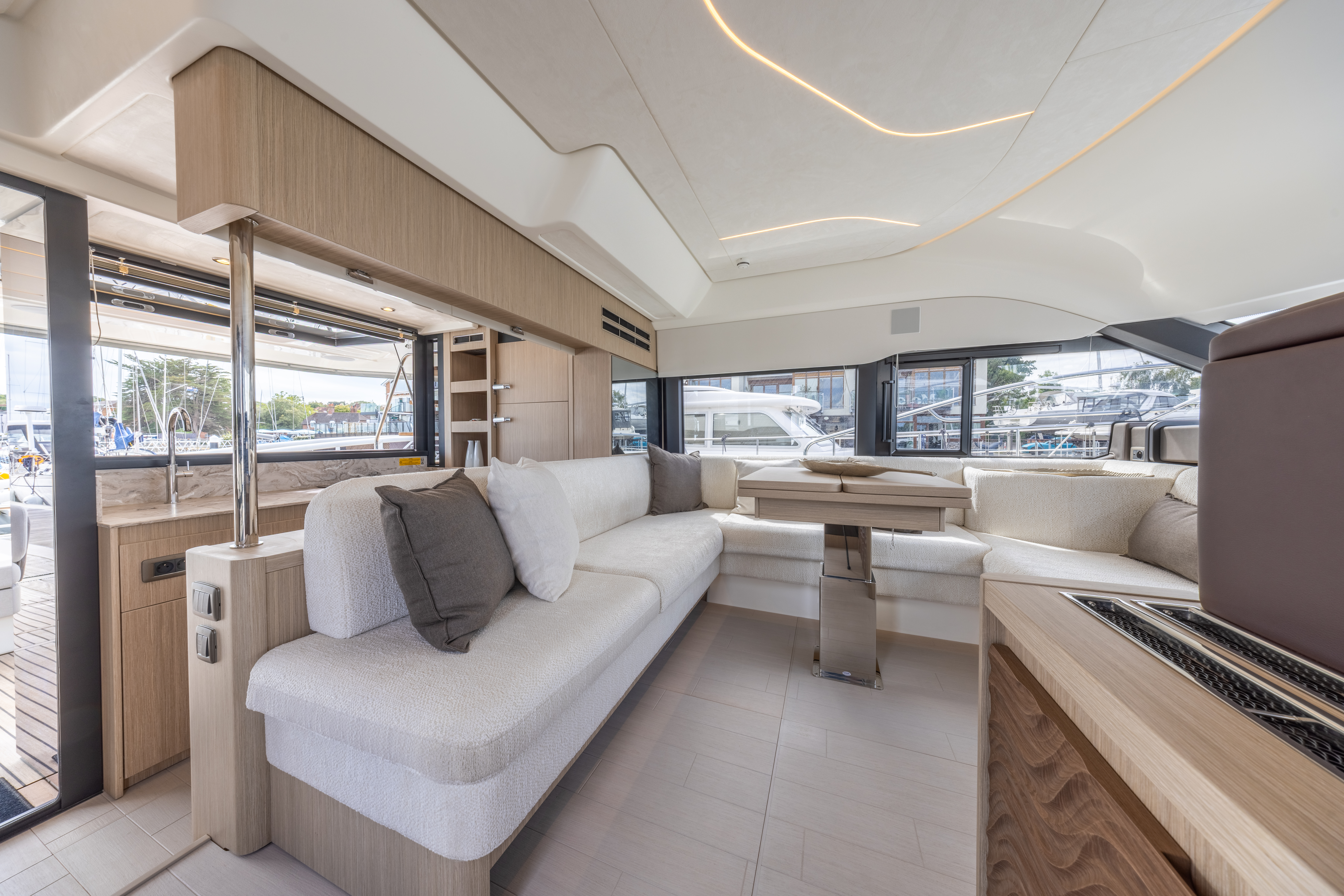 Flooring to saloon and galley: Brushed light oak hardwood flooring