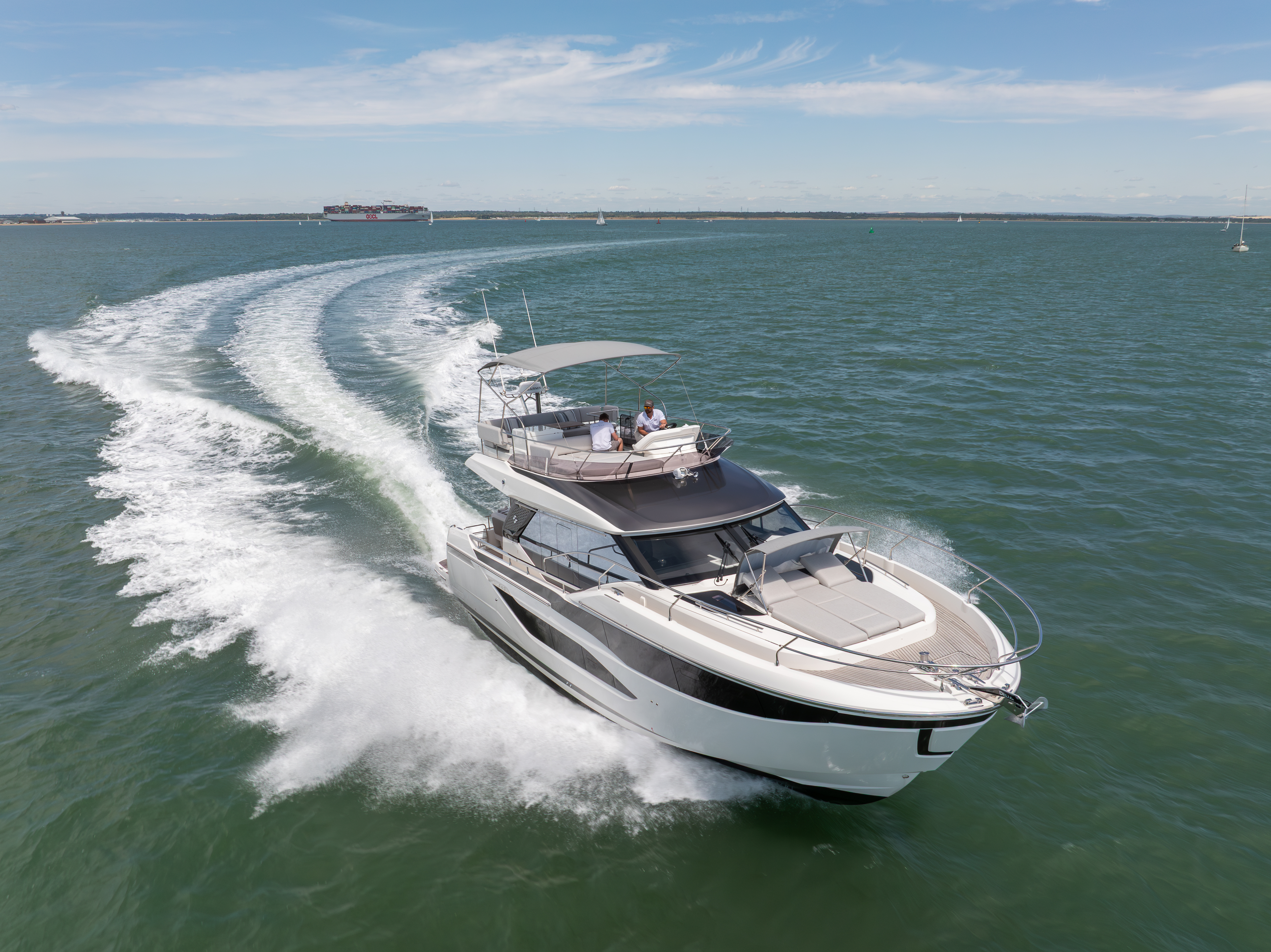 Internally, she offers a master cabin forward with king size double berth and spacious ensuite head, VIP guest cabin with a double or two single berth arrangement with ensuite and 3rd cabin with two singles. Also fitted with optional crew cabin with additional berth. The saloon has a large seating area around the dining table and the aft galley offers easy access to the cockpit which has two sofas with folding, lowerable cockpit table and access to the hydraulic bathing platform from both sides. The flybridge has aft seating, a forward sun pad and well-positioned helm station.