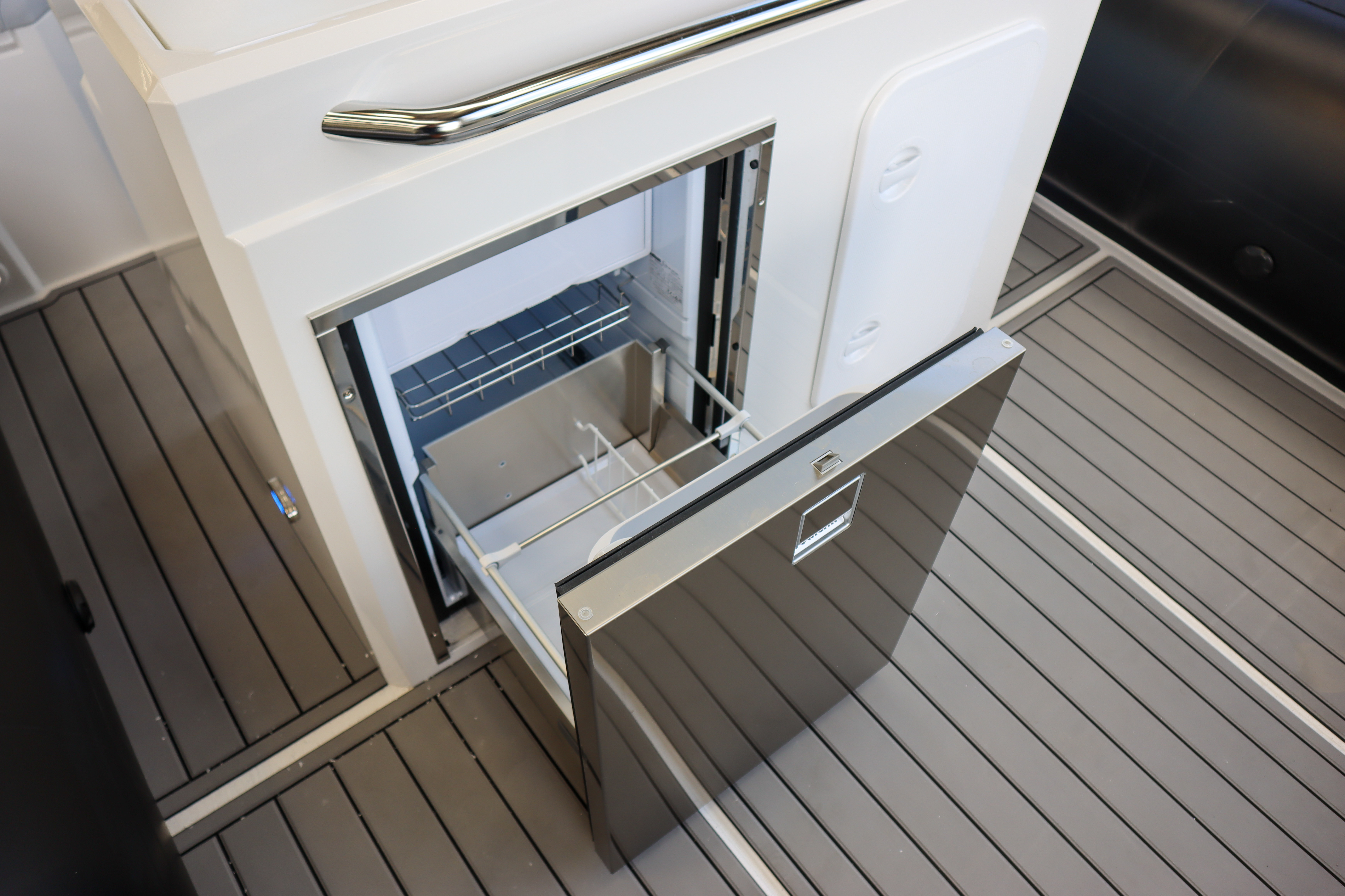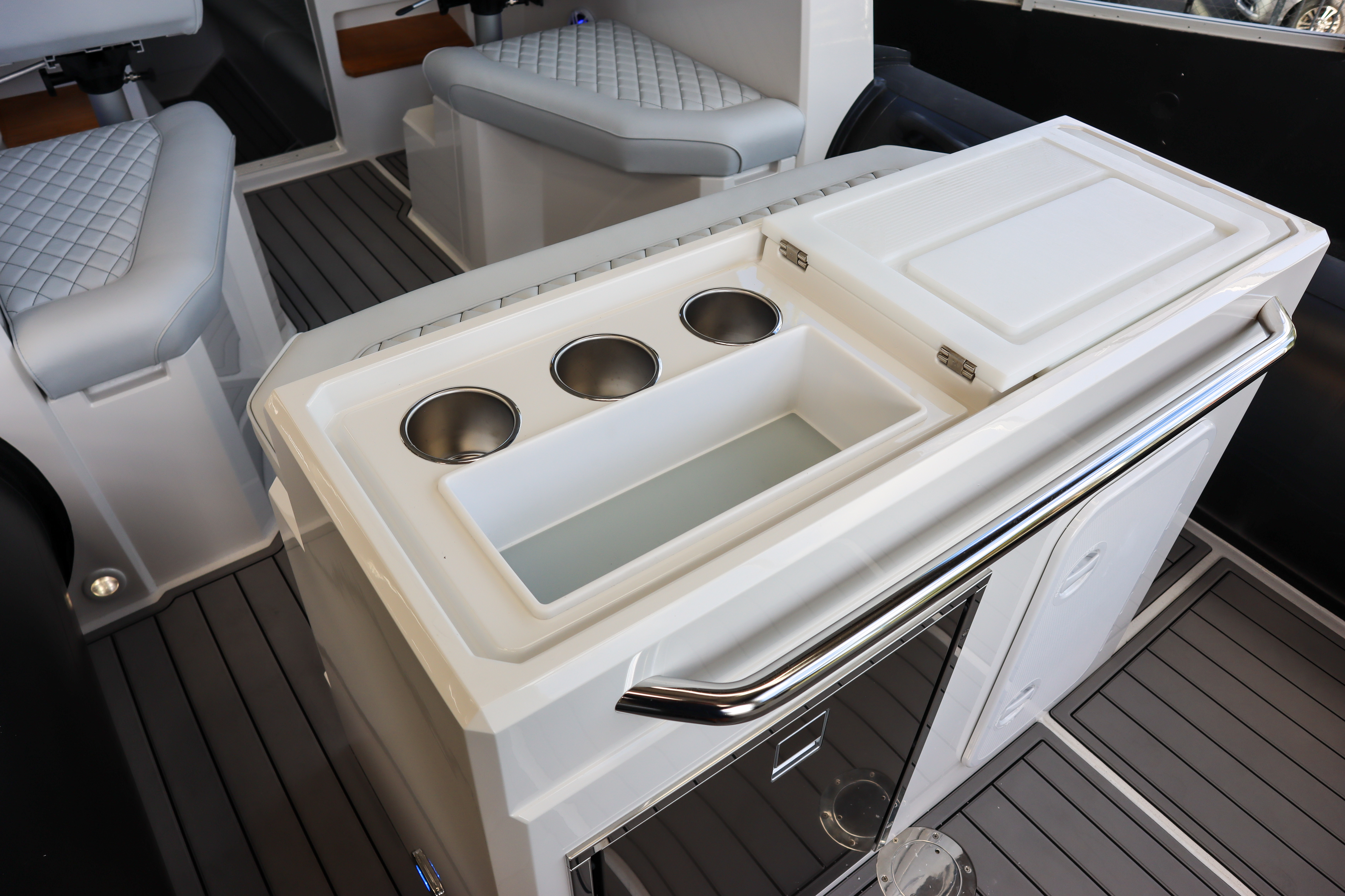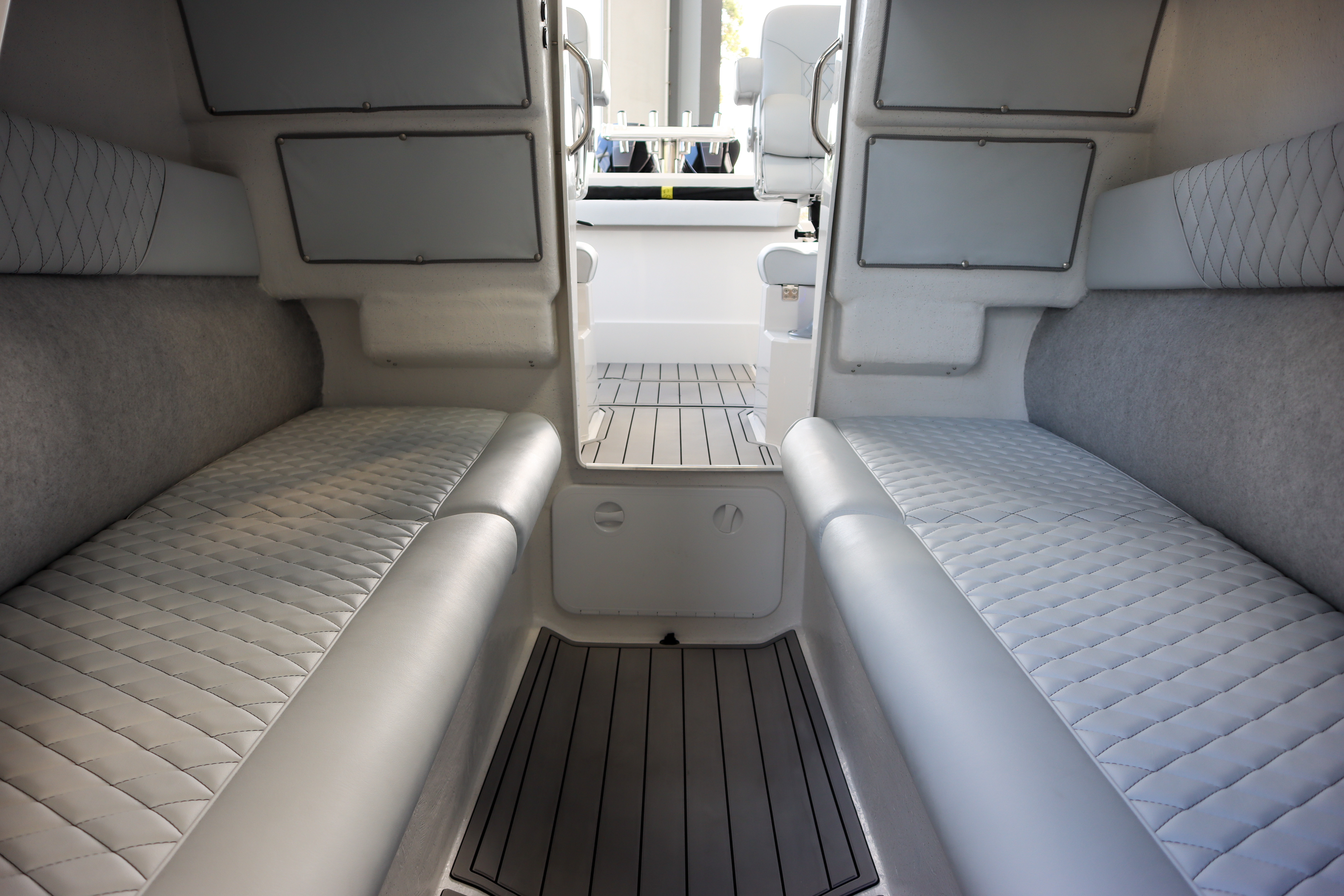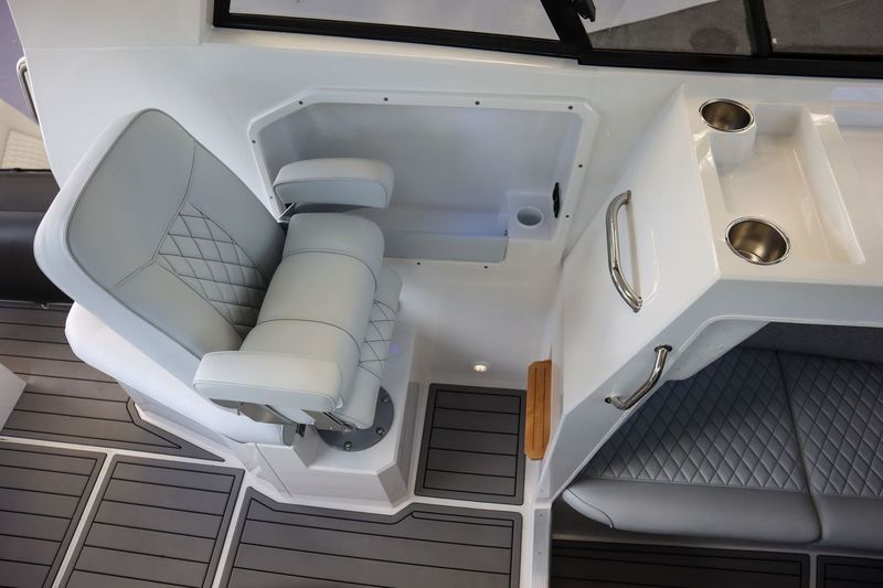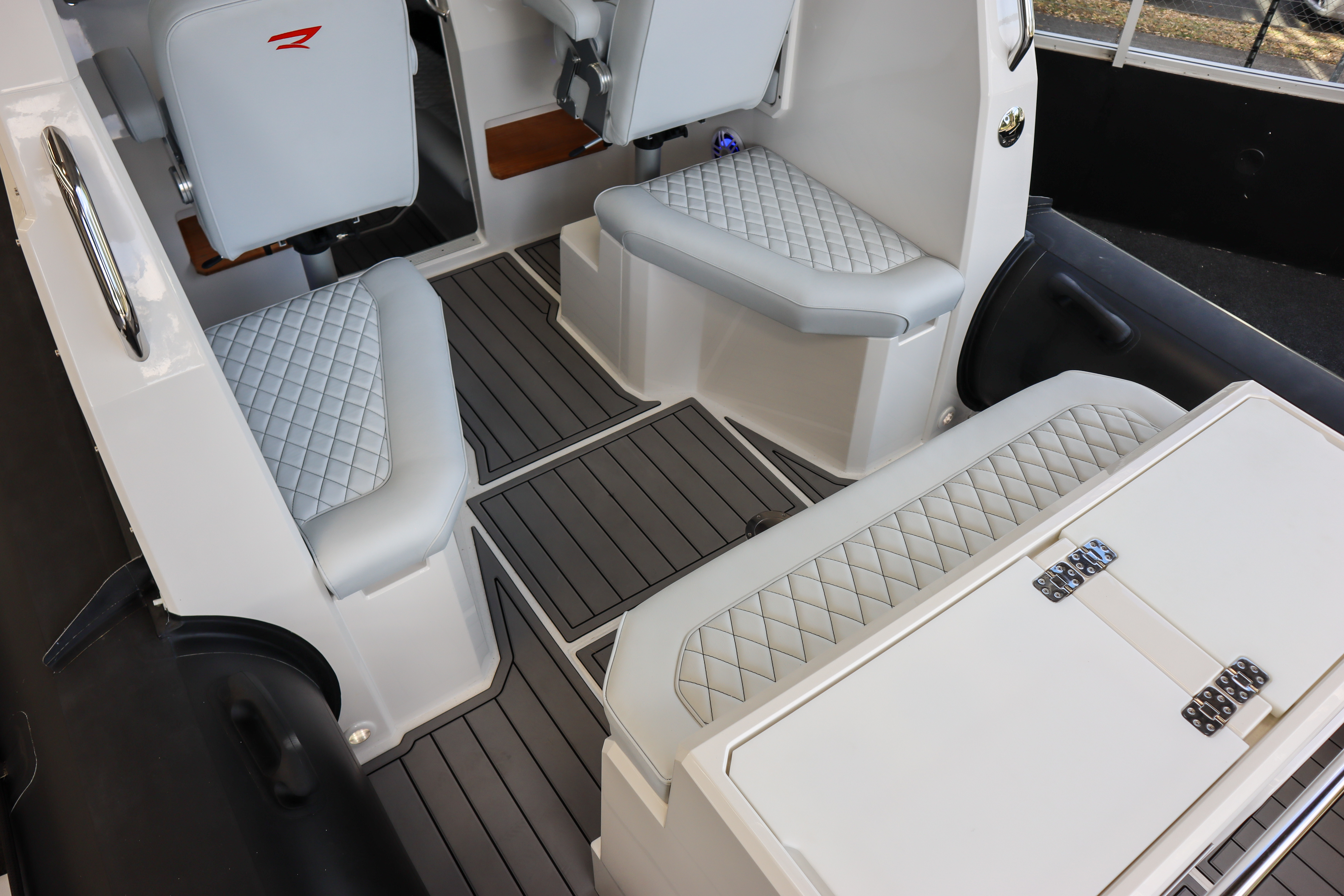 The 330 Targa features a large hardtop cabin capable of being fully enclosed with a vertical backdrop & clears, ideal for travelling in choppy, wet conditions and a versatile cockpit with ample seating including two-piece transom seats which can be removed to create a large deck area for fishing and diving, a wet station including a forward facing upholstered perch seat, fridge and freshwater system. This boat is the ultimate commuter where travelling at high speeds and is done with comfort and style.