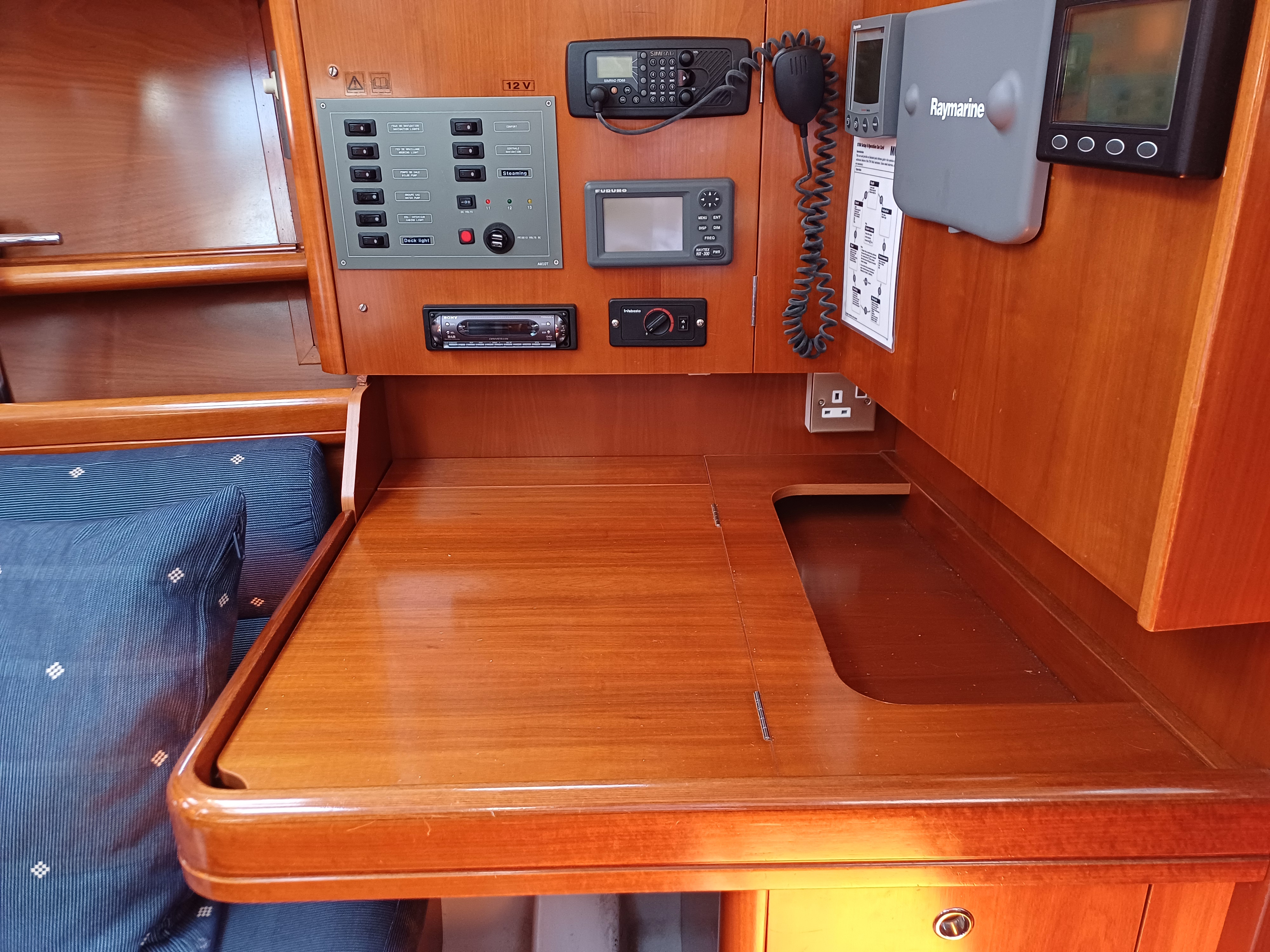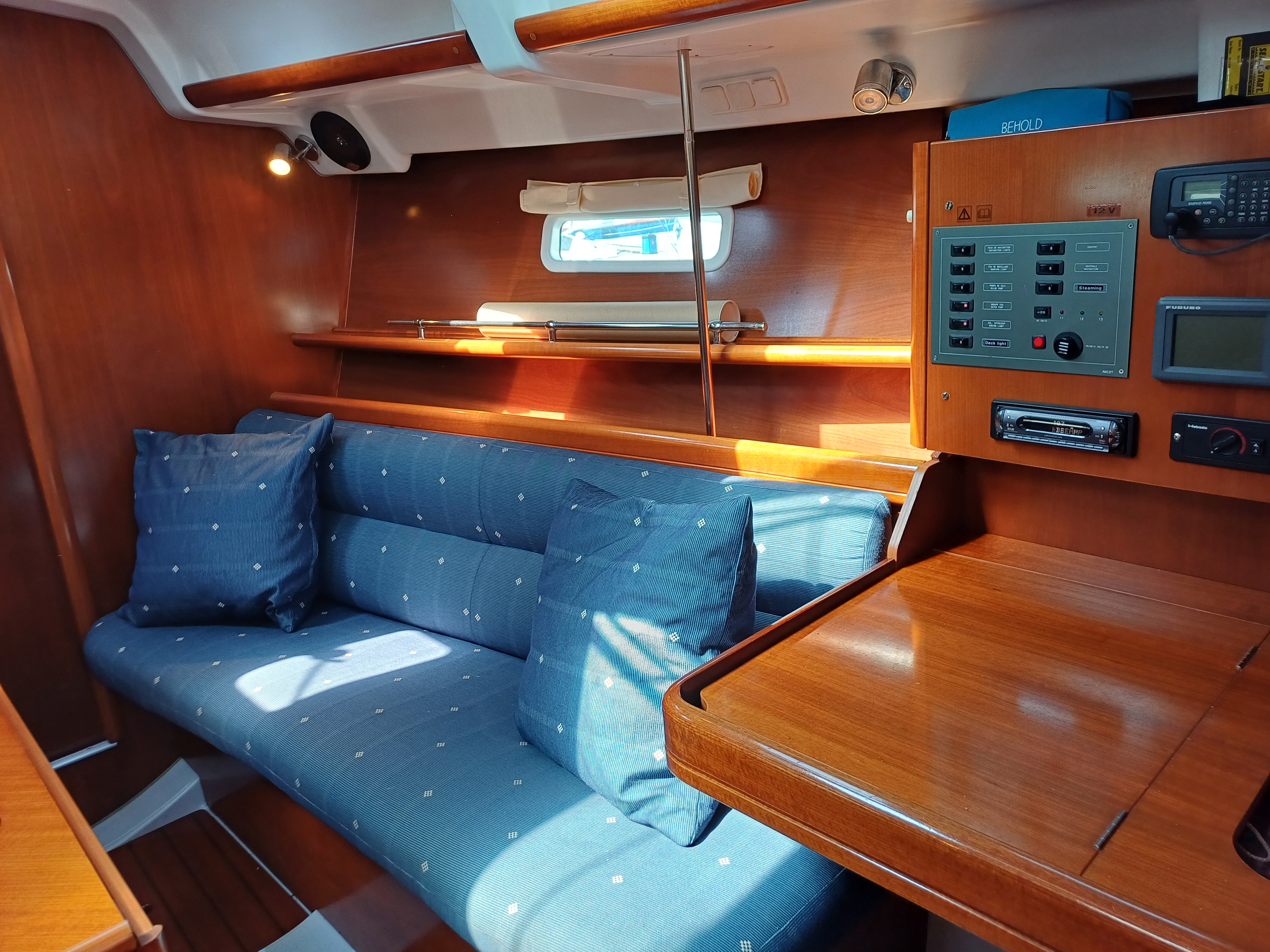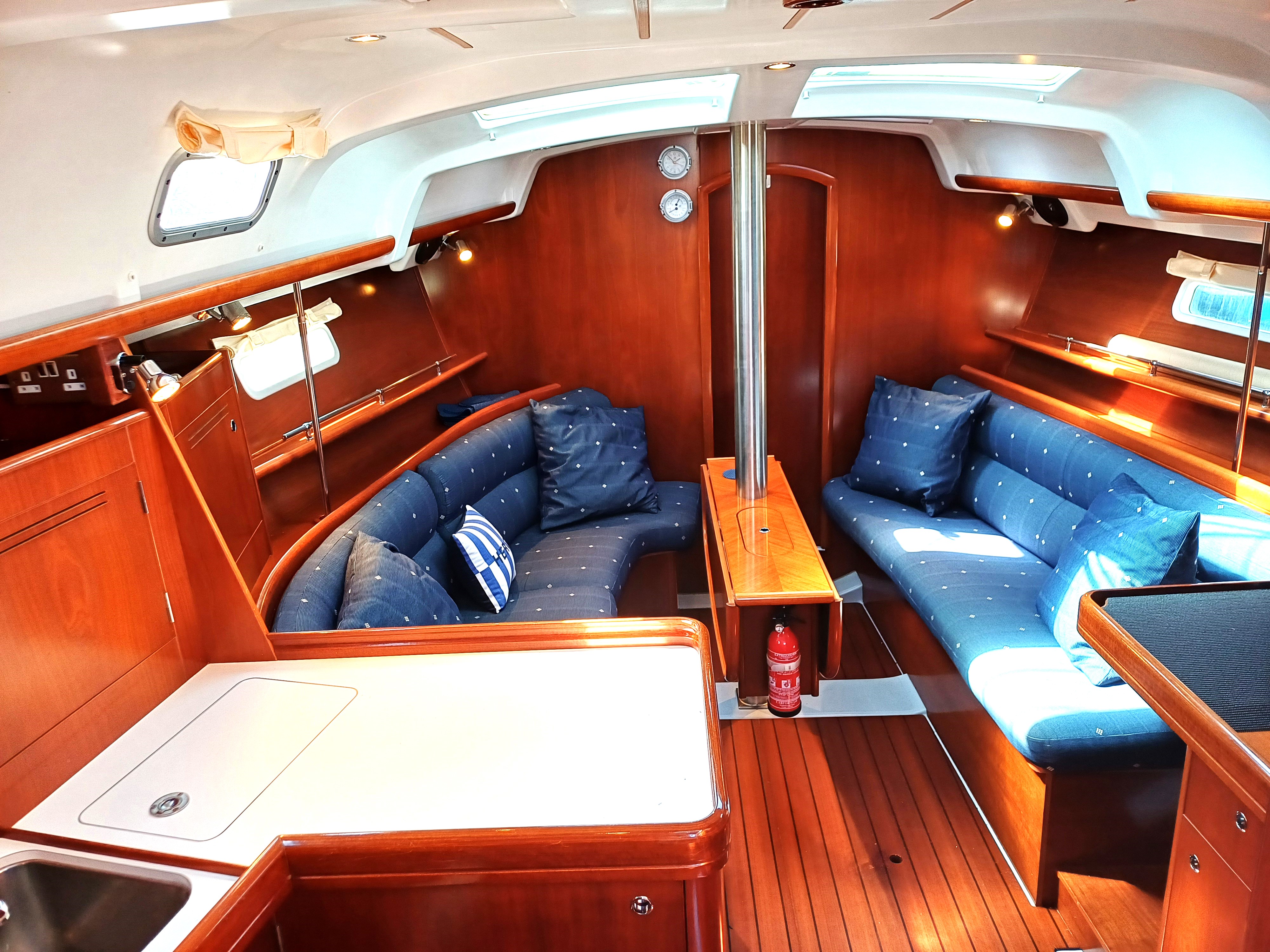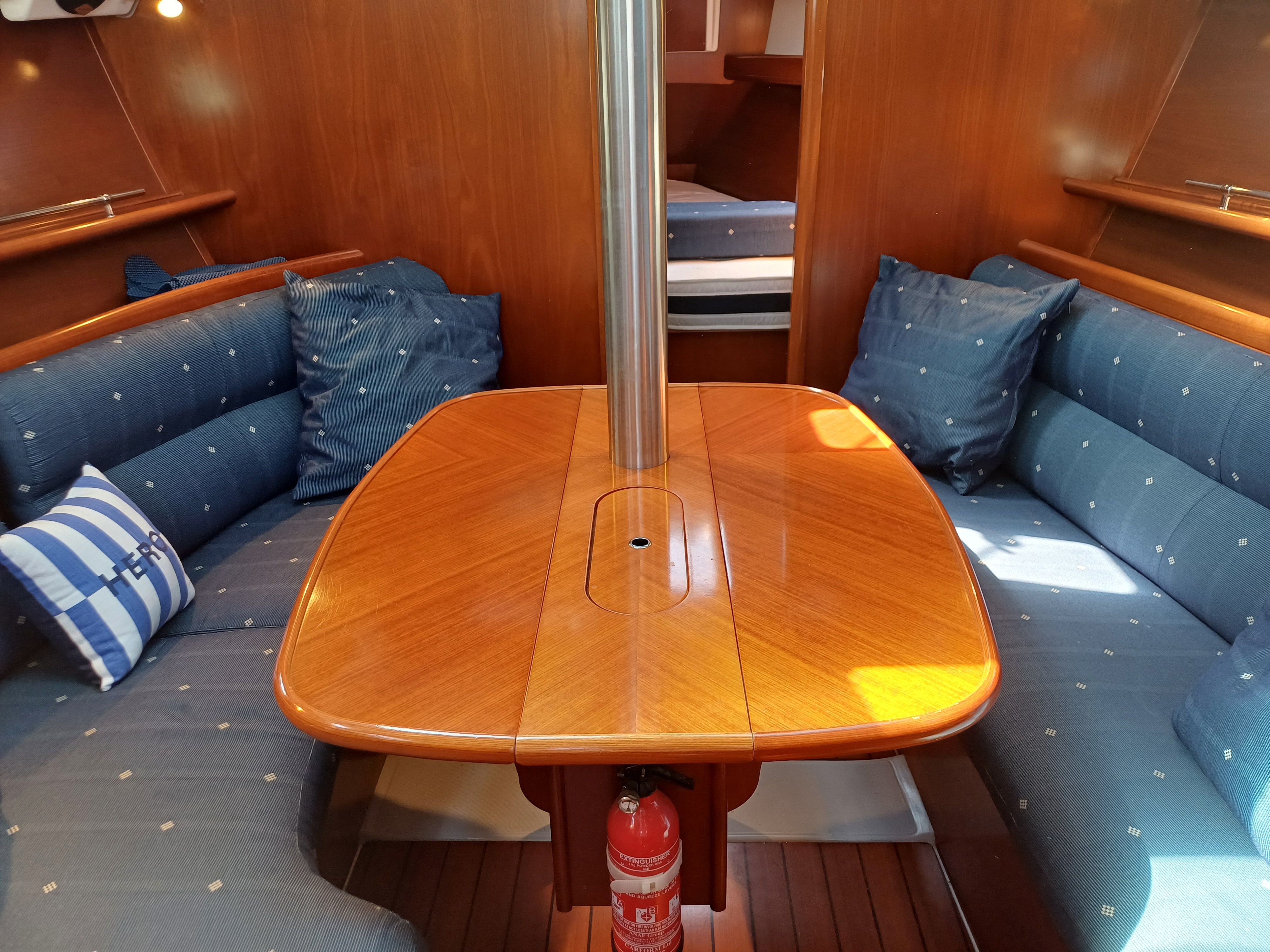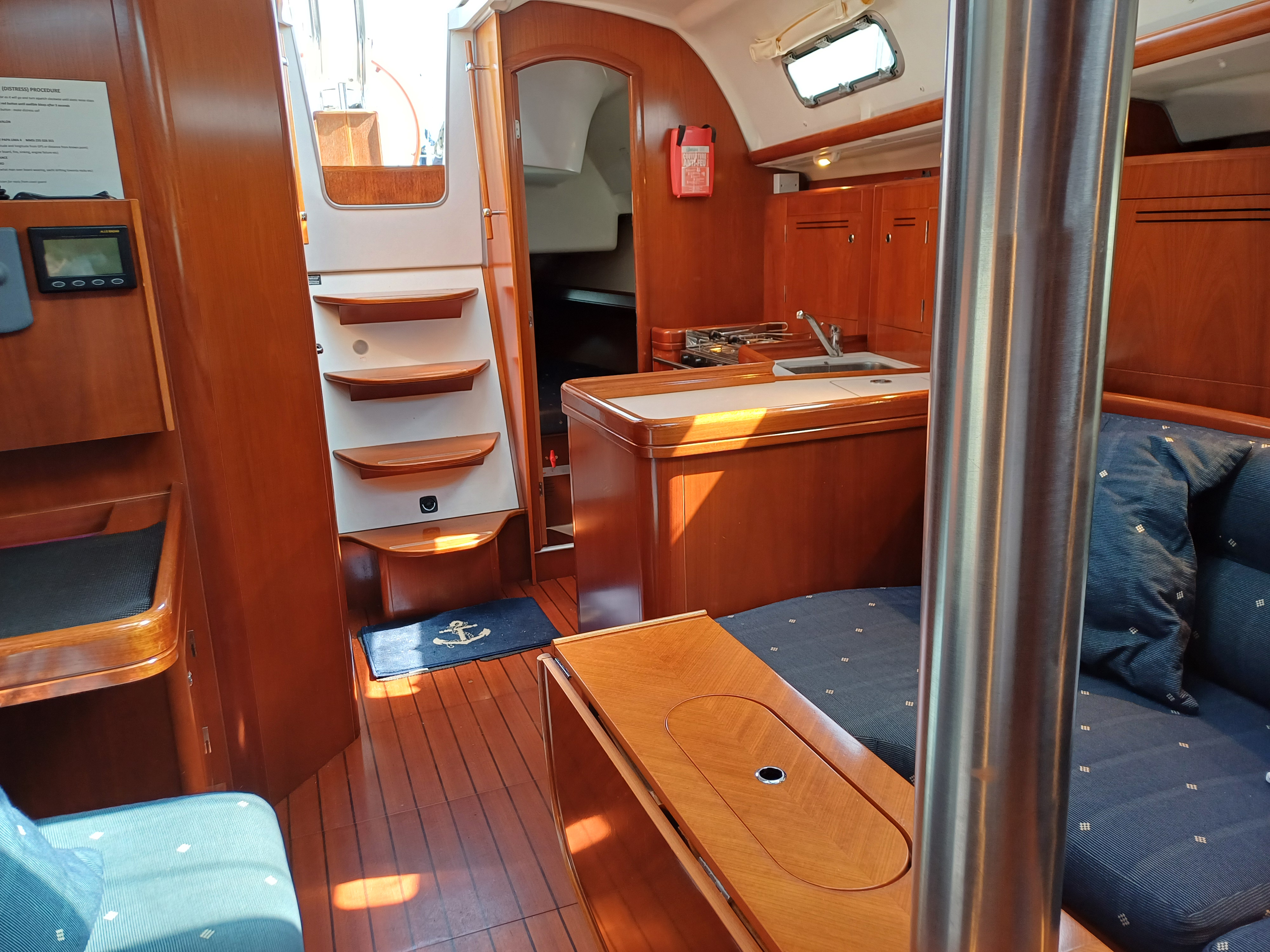 U shaped saloon seating to port converts to double berth, opening saloon table, single berth to starboard, chart table aft saloon