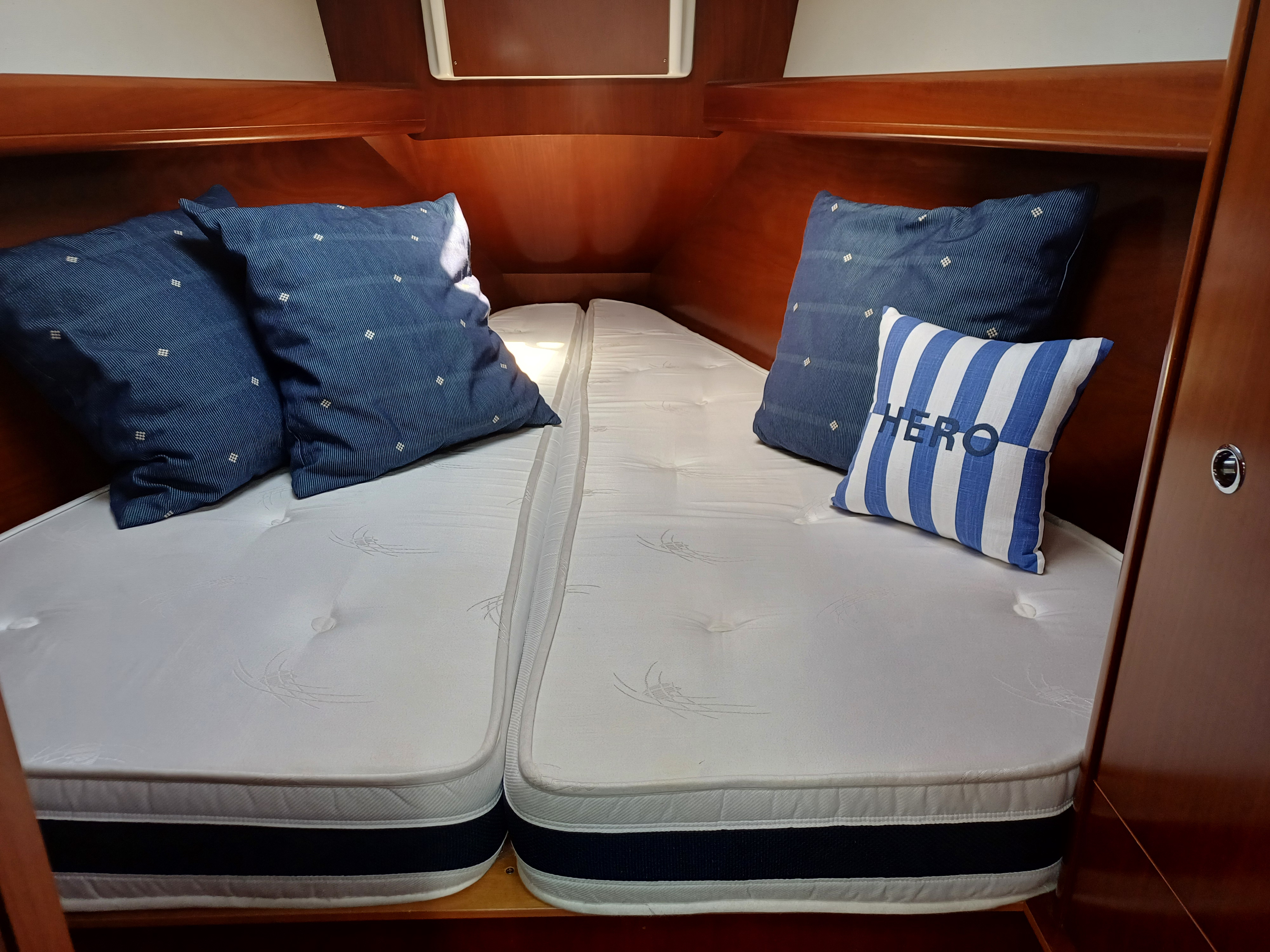 Master cabin forward with V berth with hanging locker and shelves