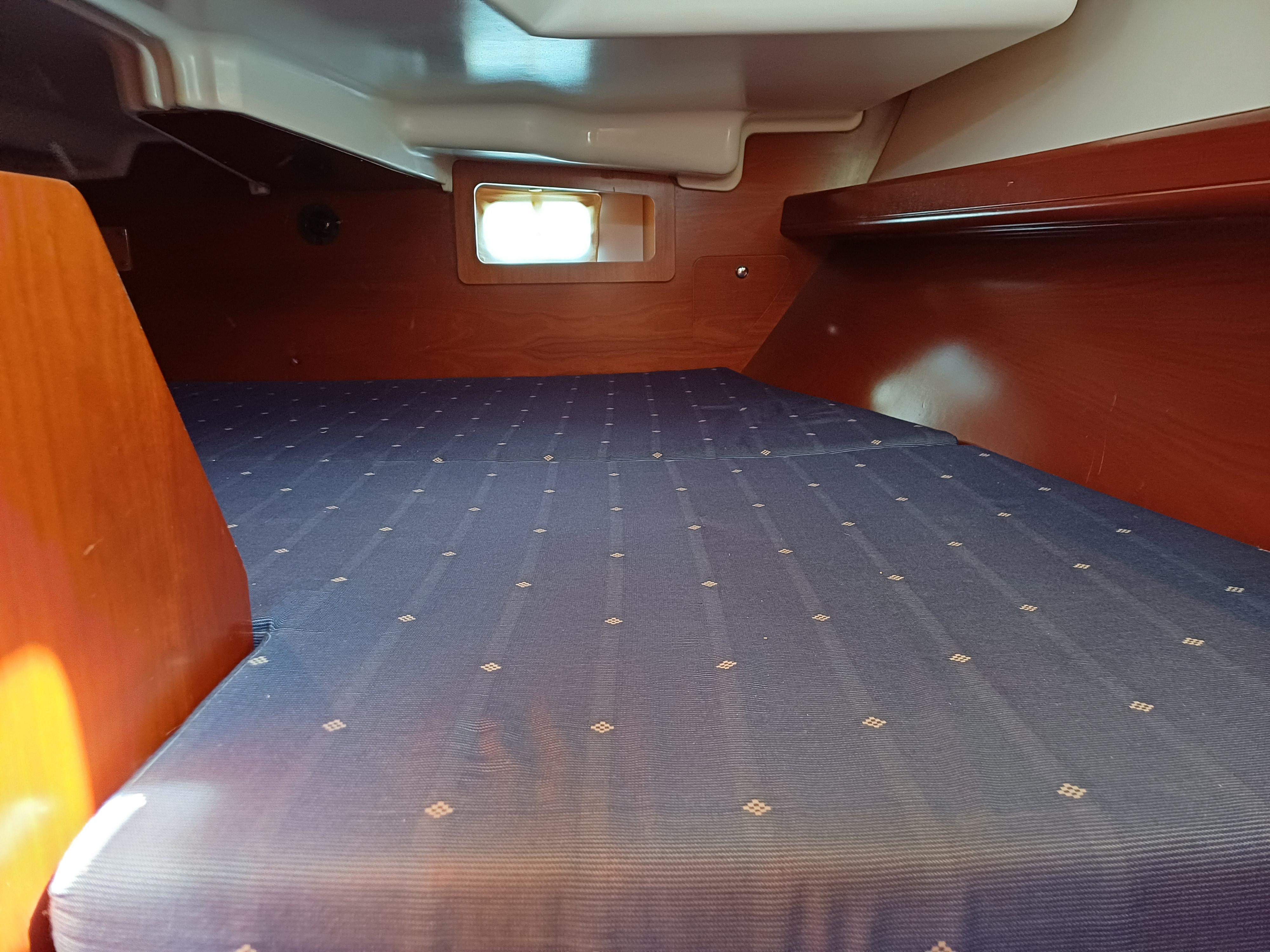 Guest cabin aft to port with double berth with hanging locker and shelves