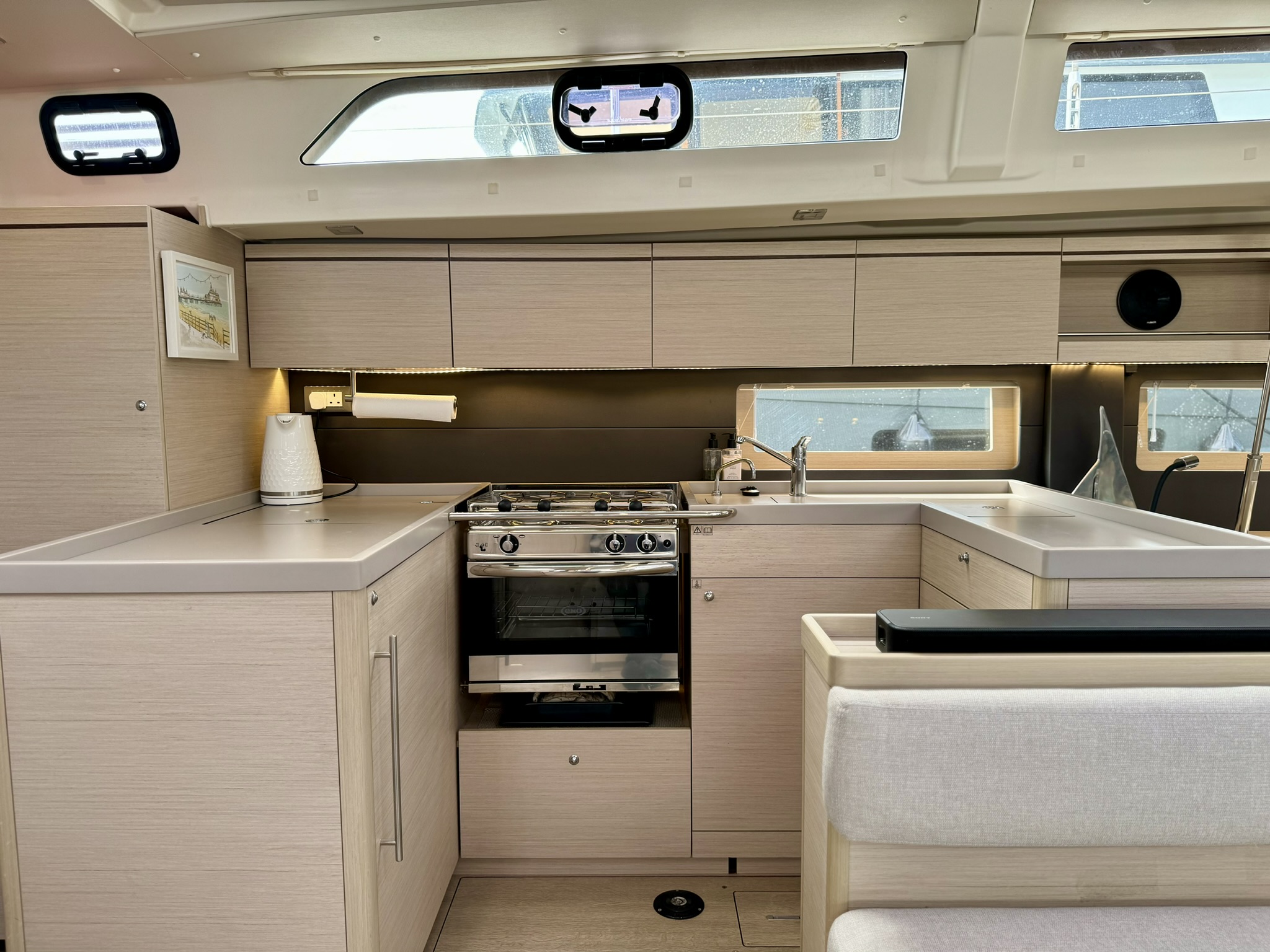 Headroom: 1,94 m / 6’4’’. U-shaped galley. Work top in Clay compact with Corian fiddles and sink cover. 1 rectangular stainless steel sink - 1 Mixer tap with hot/cold water under pressure - 1 seawater tap with foot pump - water filter. 1 Gas cooker 2 burners - Stainless 2 Burner oven / grill on luxe mounting. Stainless steel protection handrail. ice box, top opening with 12V refirgeration unit, front opening. 220v microwave. Sea/fresh water foot pump.