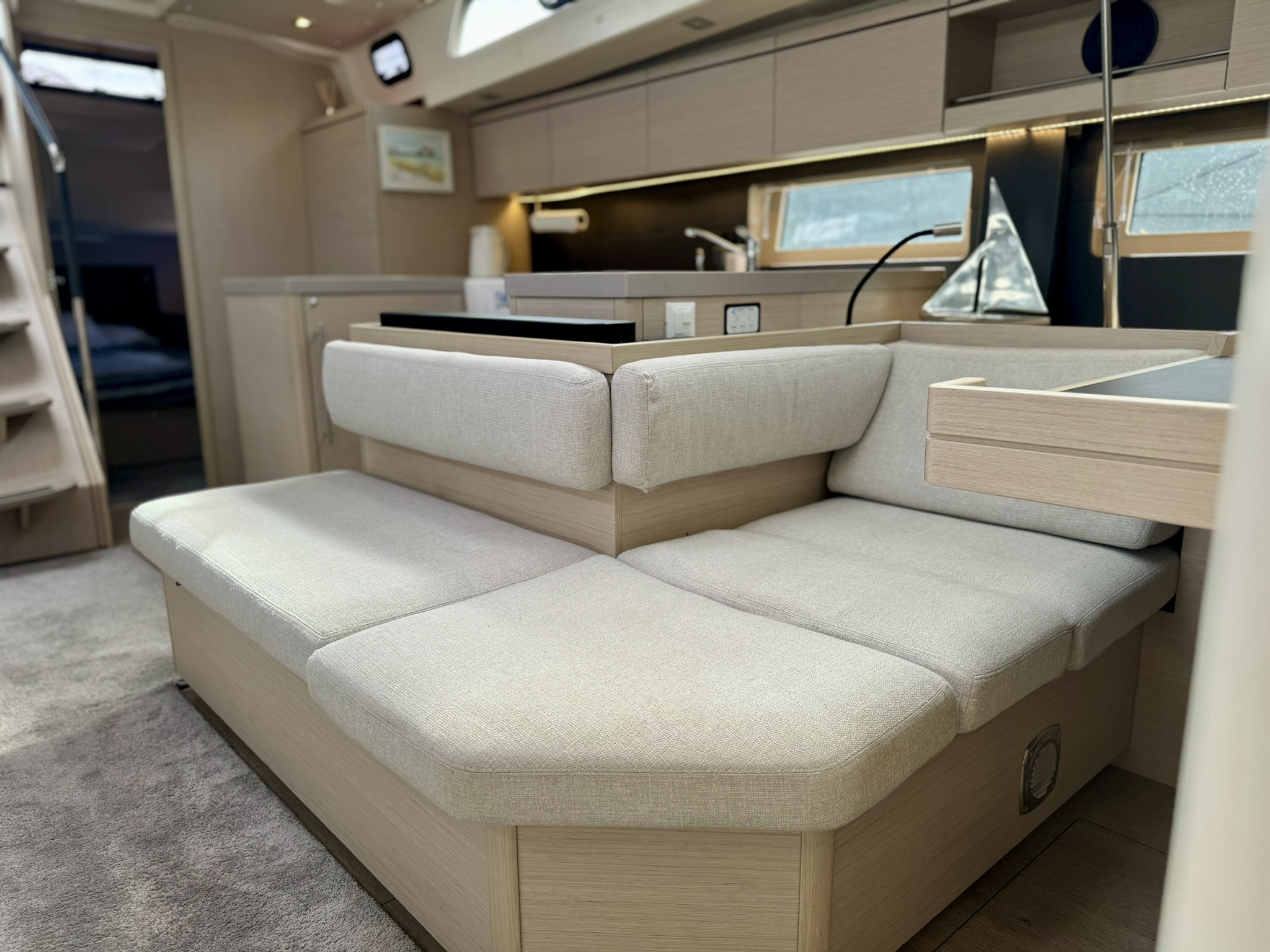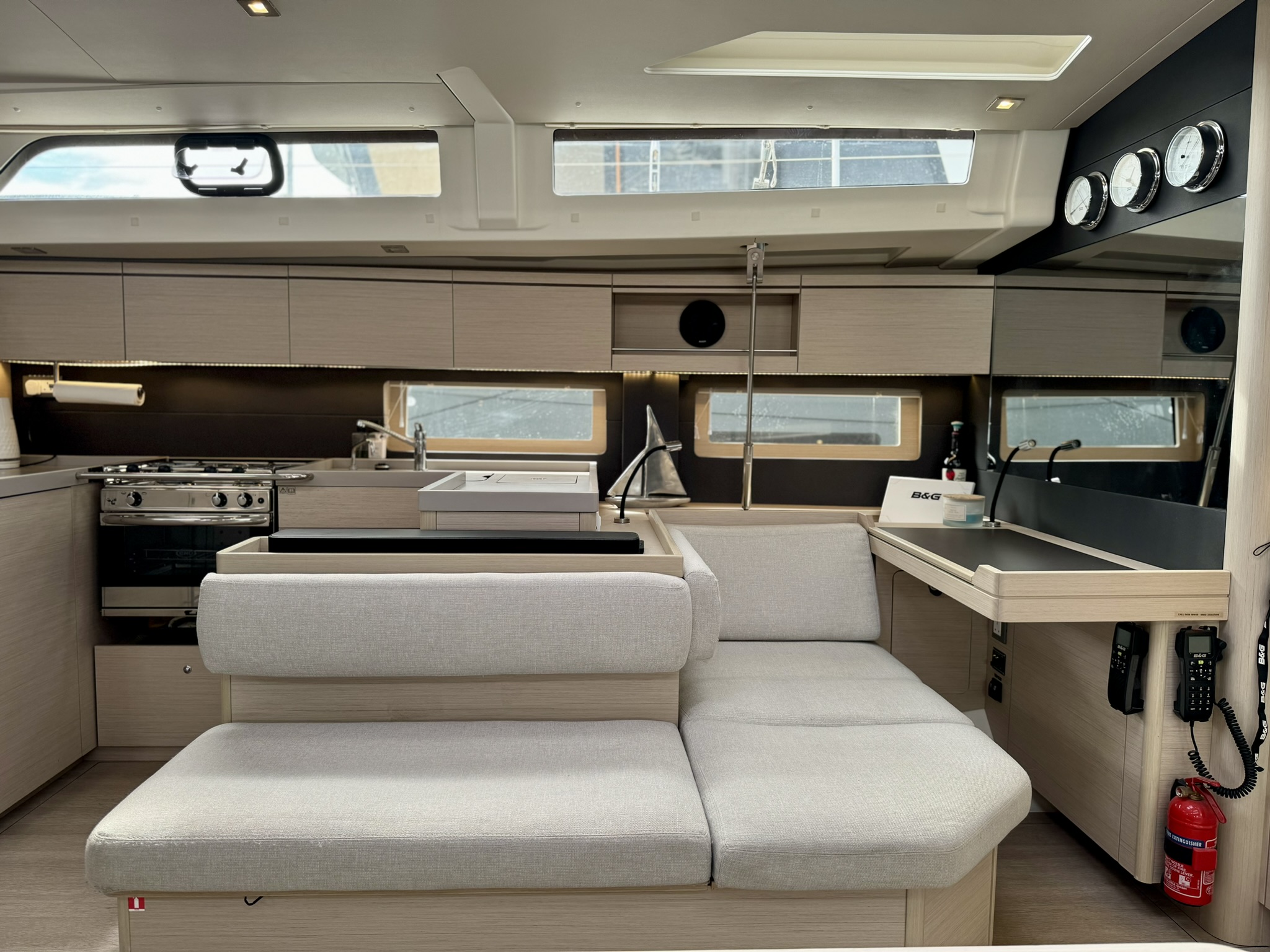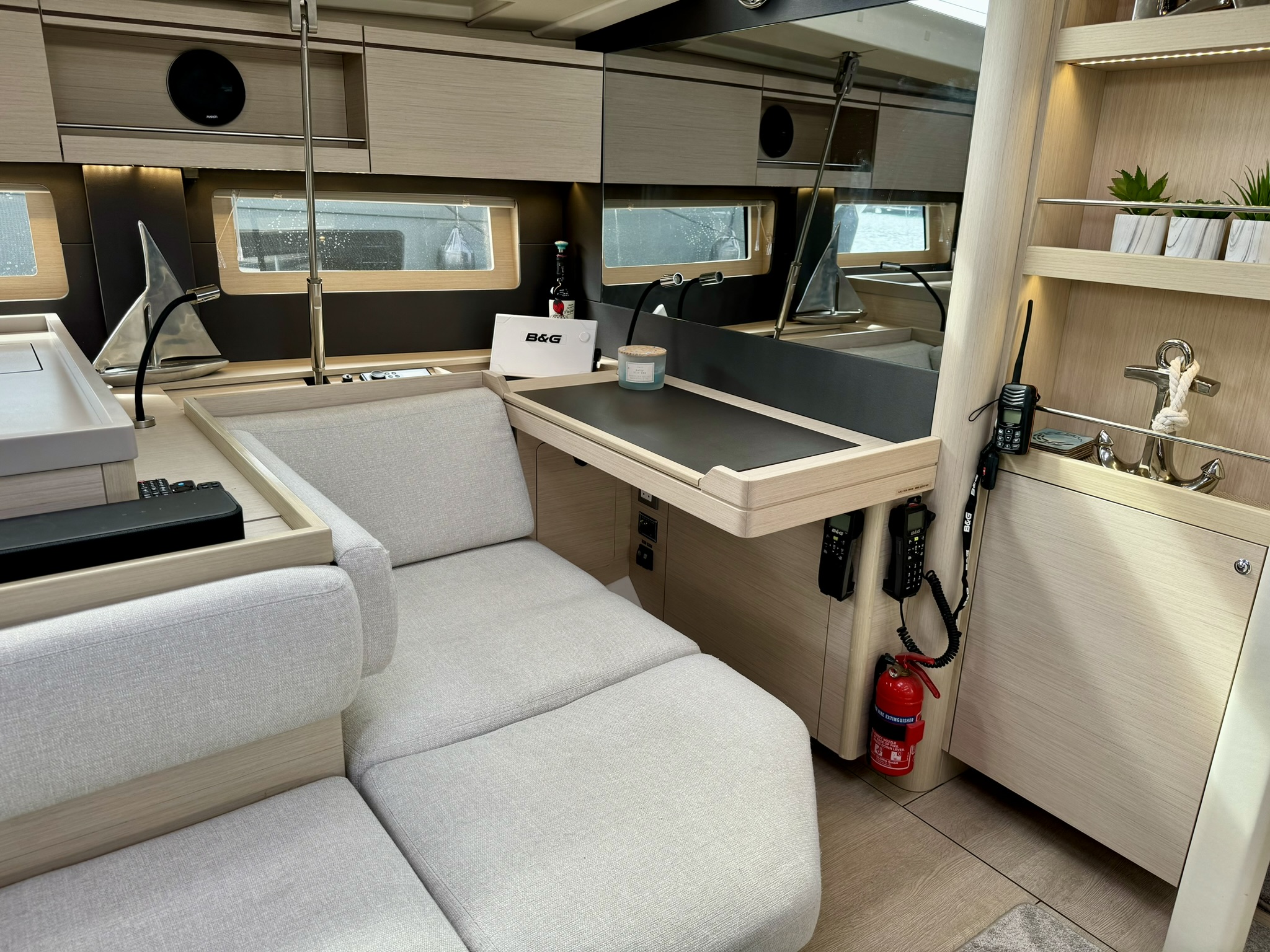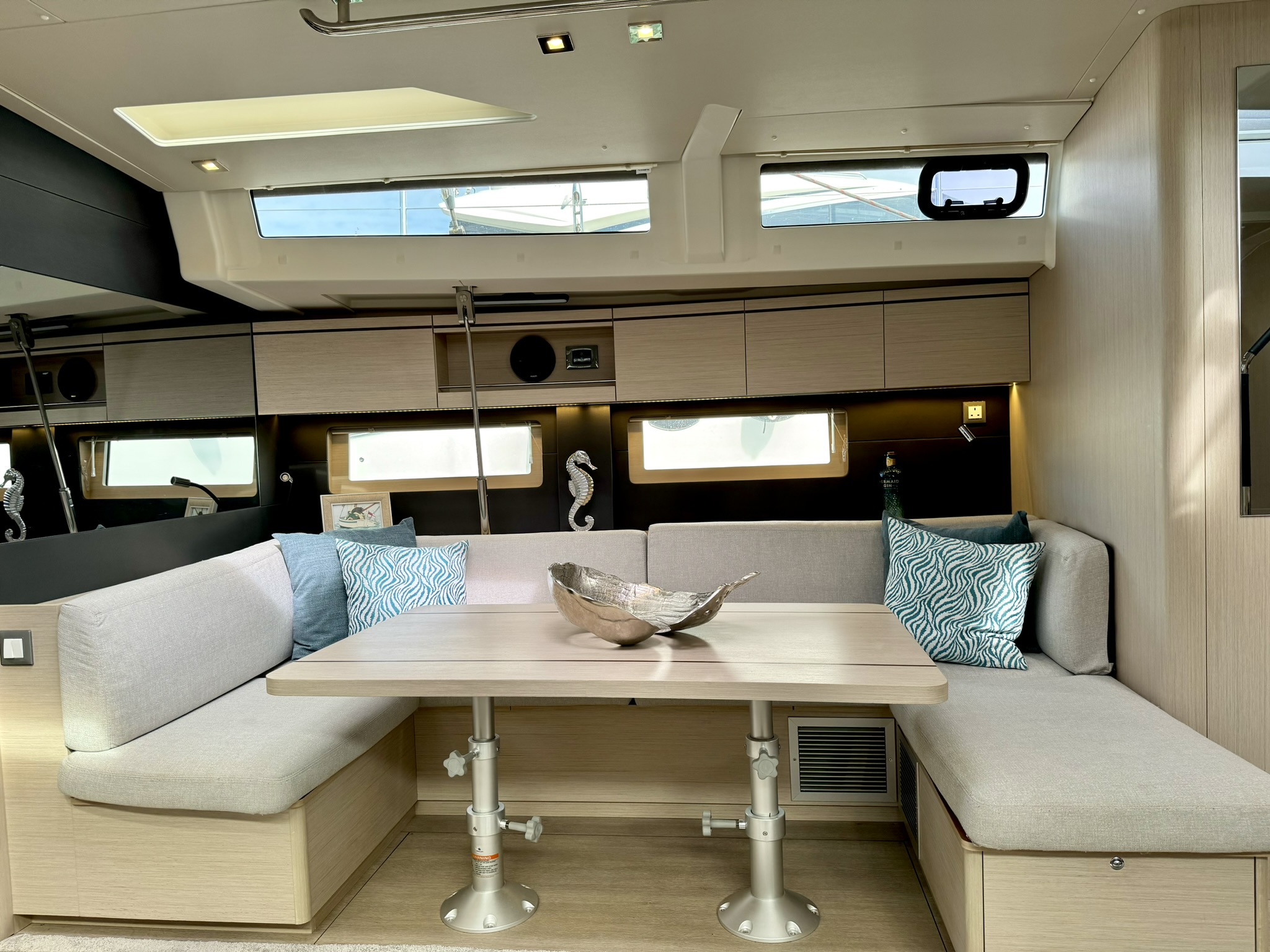 Headroom: 2,03 m / 6’8’’. U shaped saloon bench - double density foam. 1 Flexible and swivelling reading light. Saloon table with manual dropping legs. Storage under bench seats. Mirror on forward bulkhead. Bottle rack behind the bench against the forward bulkhead. Bose speakers in saloon. 40" Pop-up TV in saloon - antenna required, 2 Panoramic coachroof windows with curtains. 2 Hull portholes.