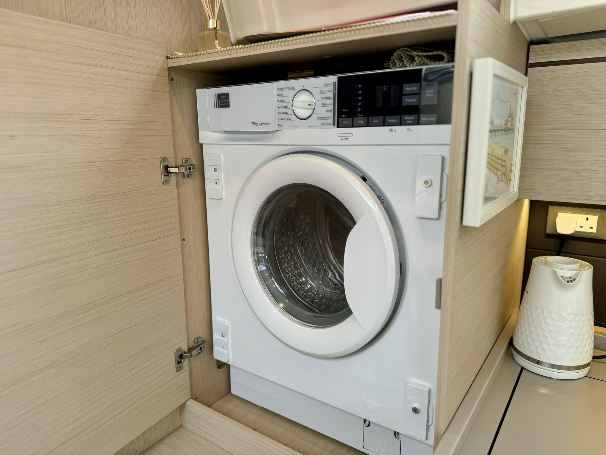 Headroom: 1,98 m / 6’6’’. Access via galley. Large storage area (1 Hanging locker, Cupboards). Washer-Dryer.