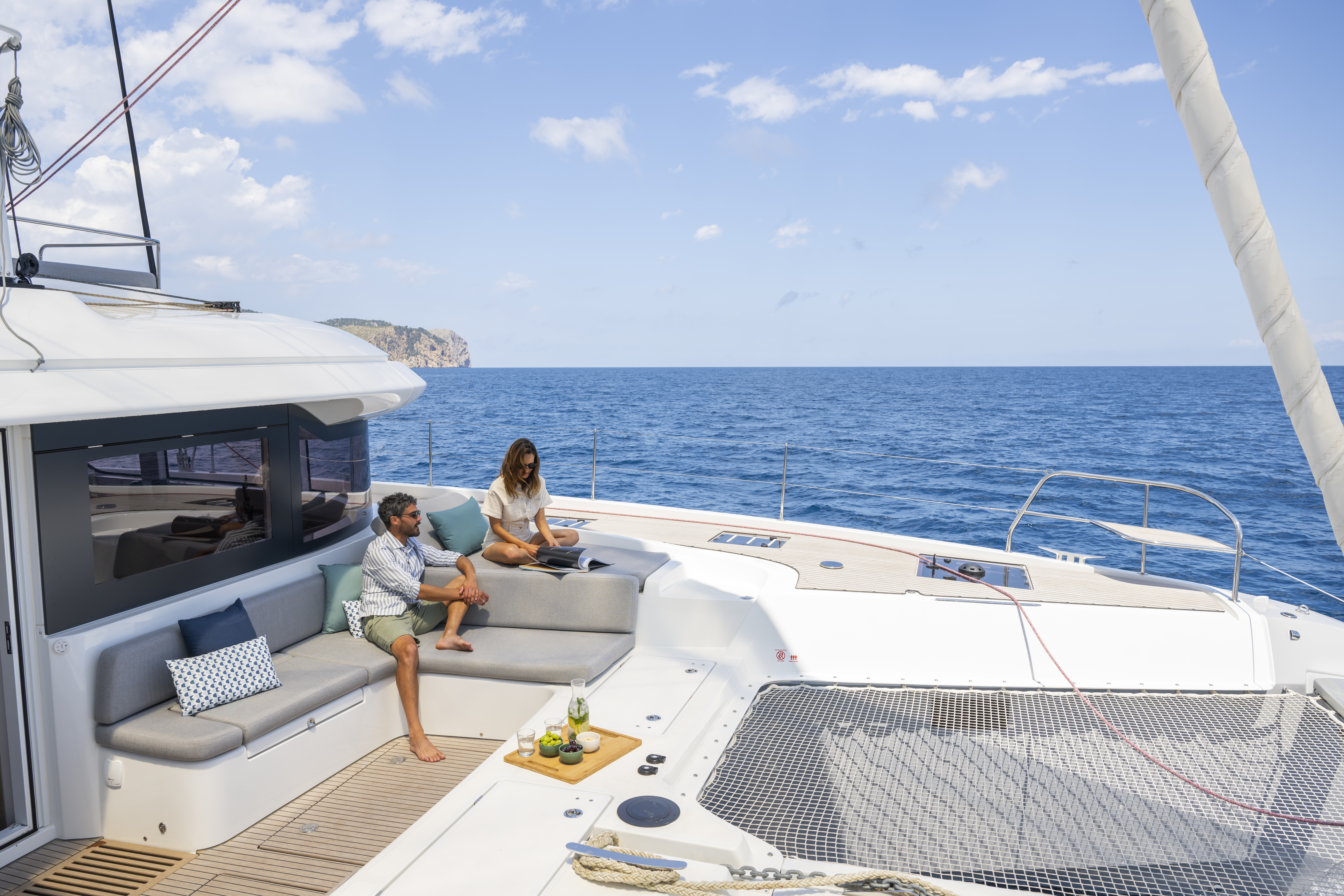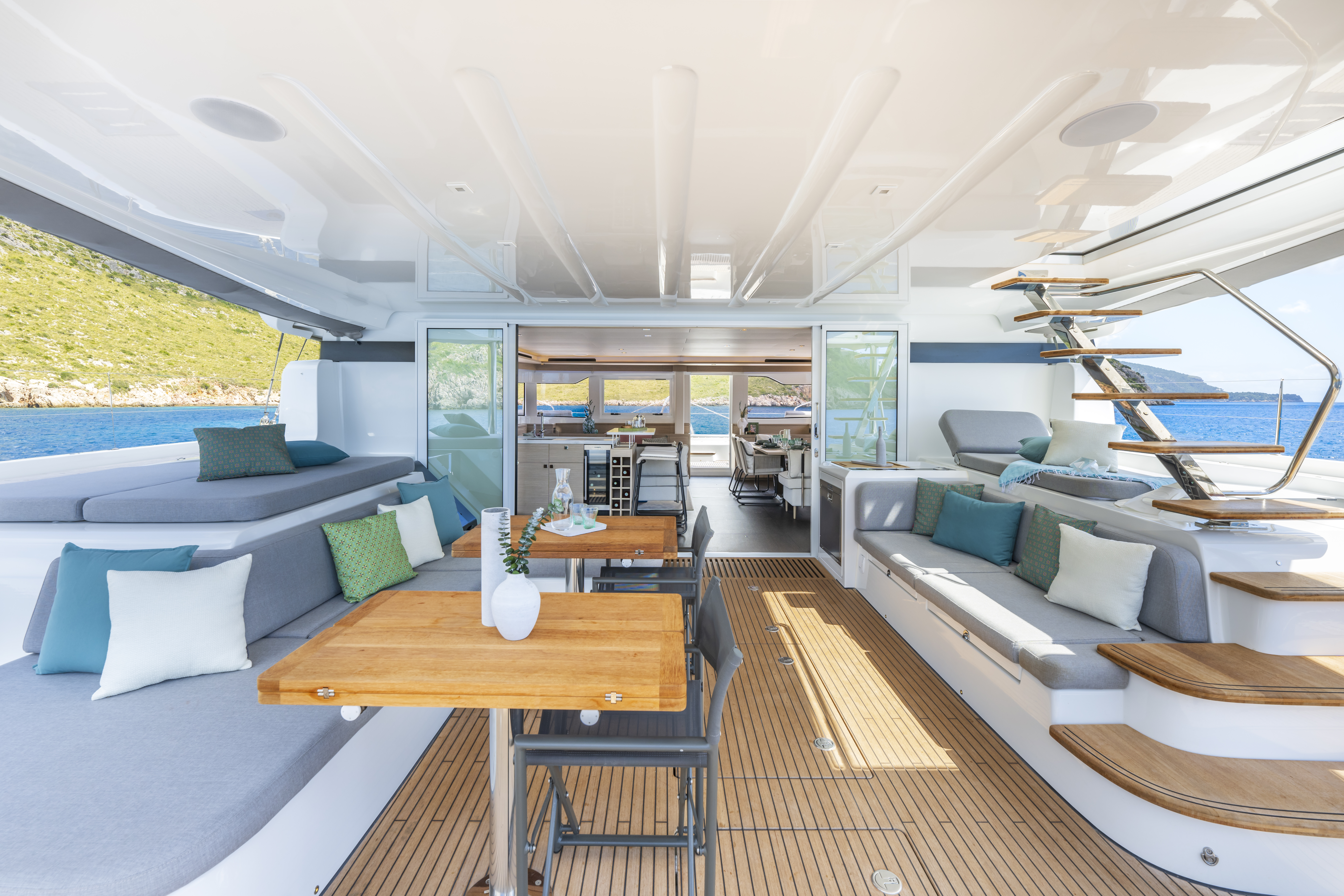 At 60 feet in length and with an impressive 32-foot beam, the Lagoon 60 maximizes space both above and below deck, ensuring that every journey is comfortable for owners and guests alike. The yacht’s signature feature is its expansive flybridge, which boasts a full helm station, ample seating, and a large sunbathing area, providing stunning 360° views. This area is perfect for lounging or socializing, with dedicated spaces that bring a seamless indoor-outdoor feel.