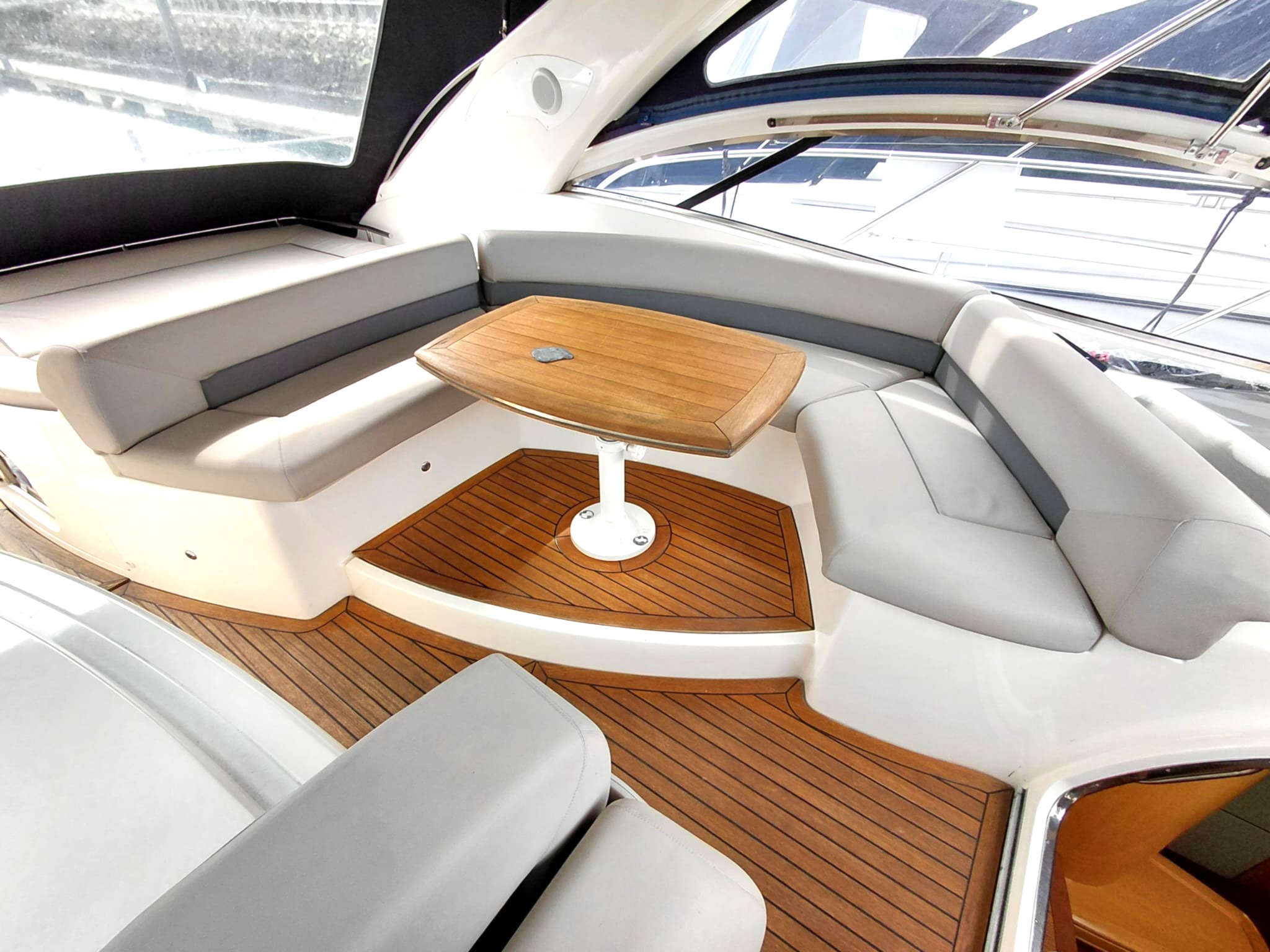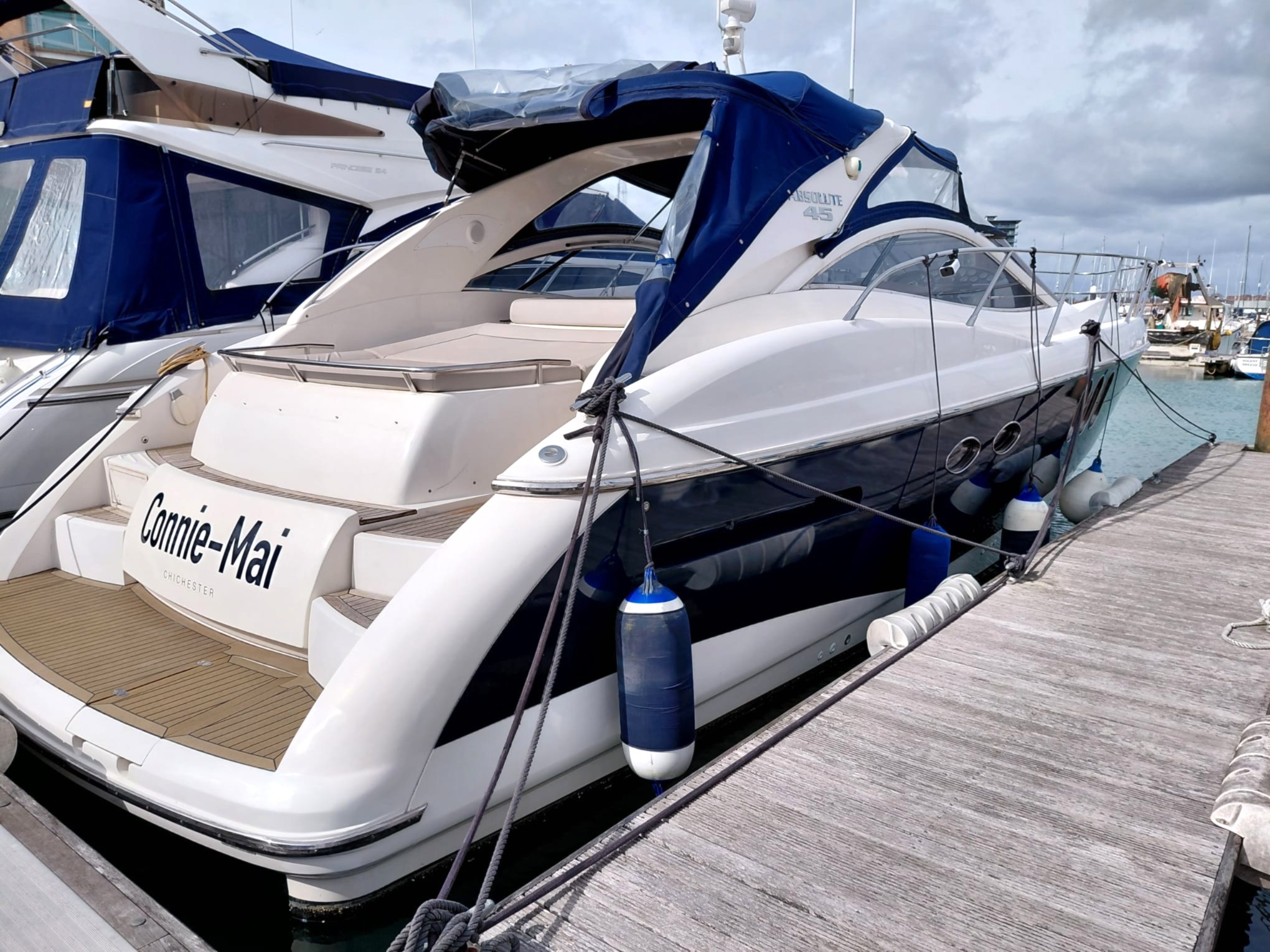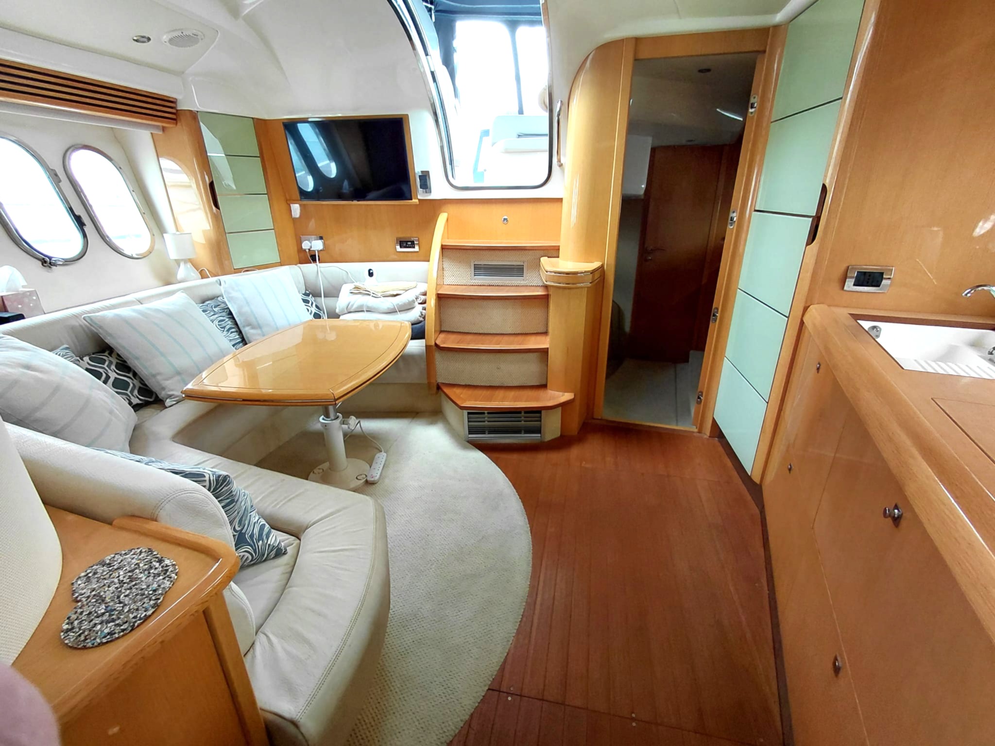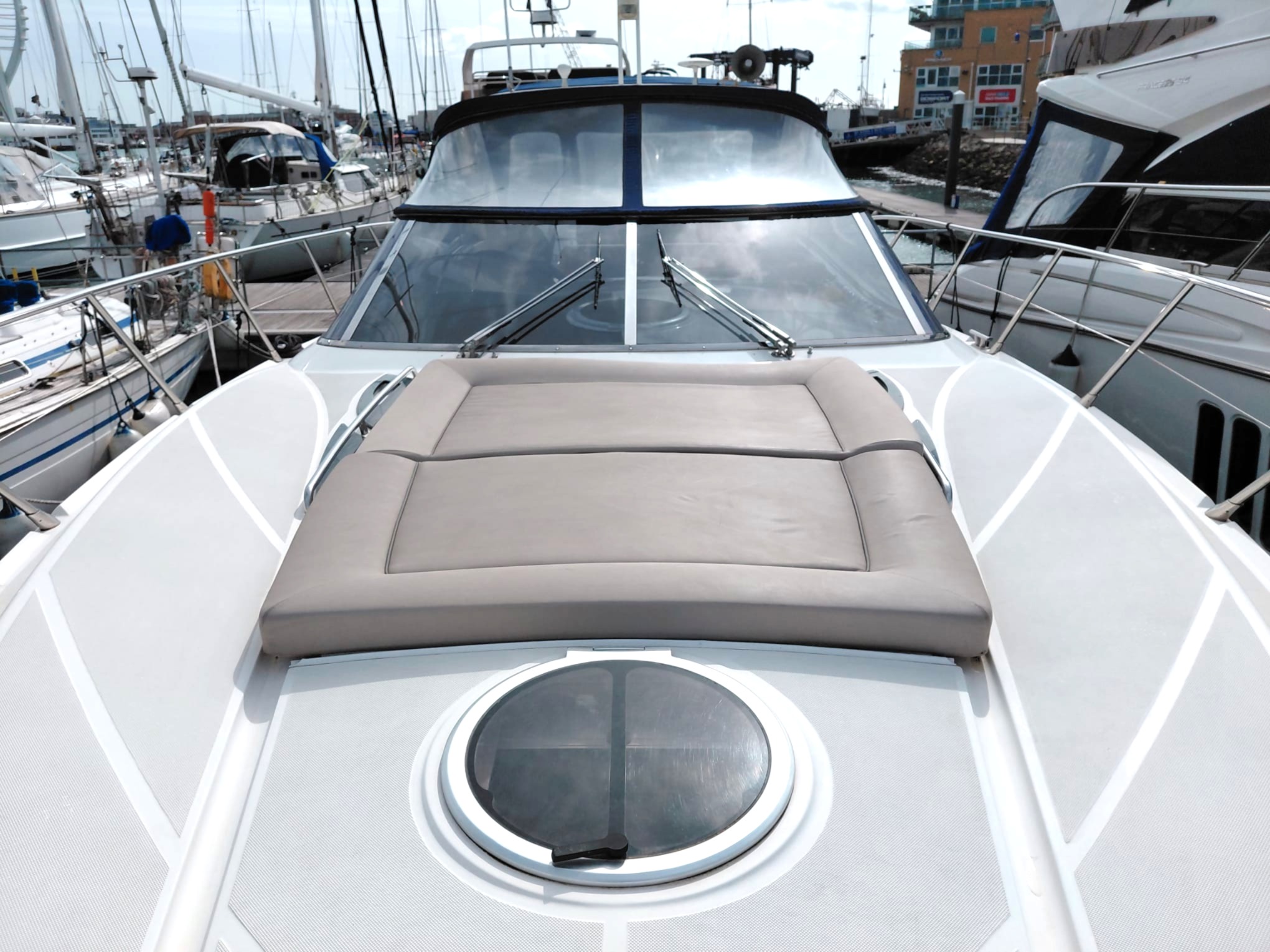 A premium finish inside and out. The 45 is generously proportioned and has a good top speed and cruising speed. The palatial aft cabin may prove irresistible for some and the big portholes fill the saloon with light. This a is true sports boat - fun to drive, good cockpit entertaining, big sunpad, tender garage along with beautiful interior styling. Available to view in Gosport.
