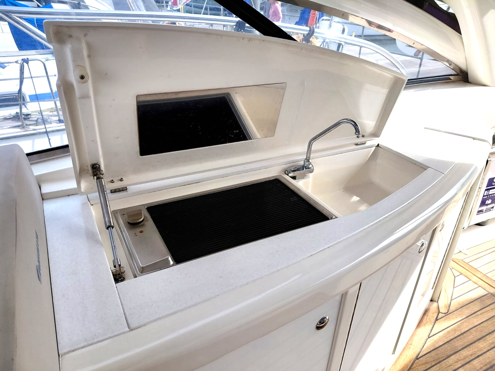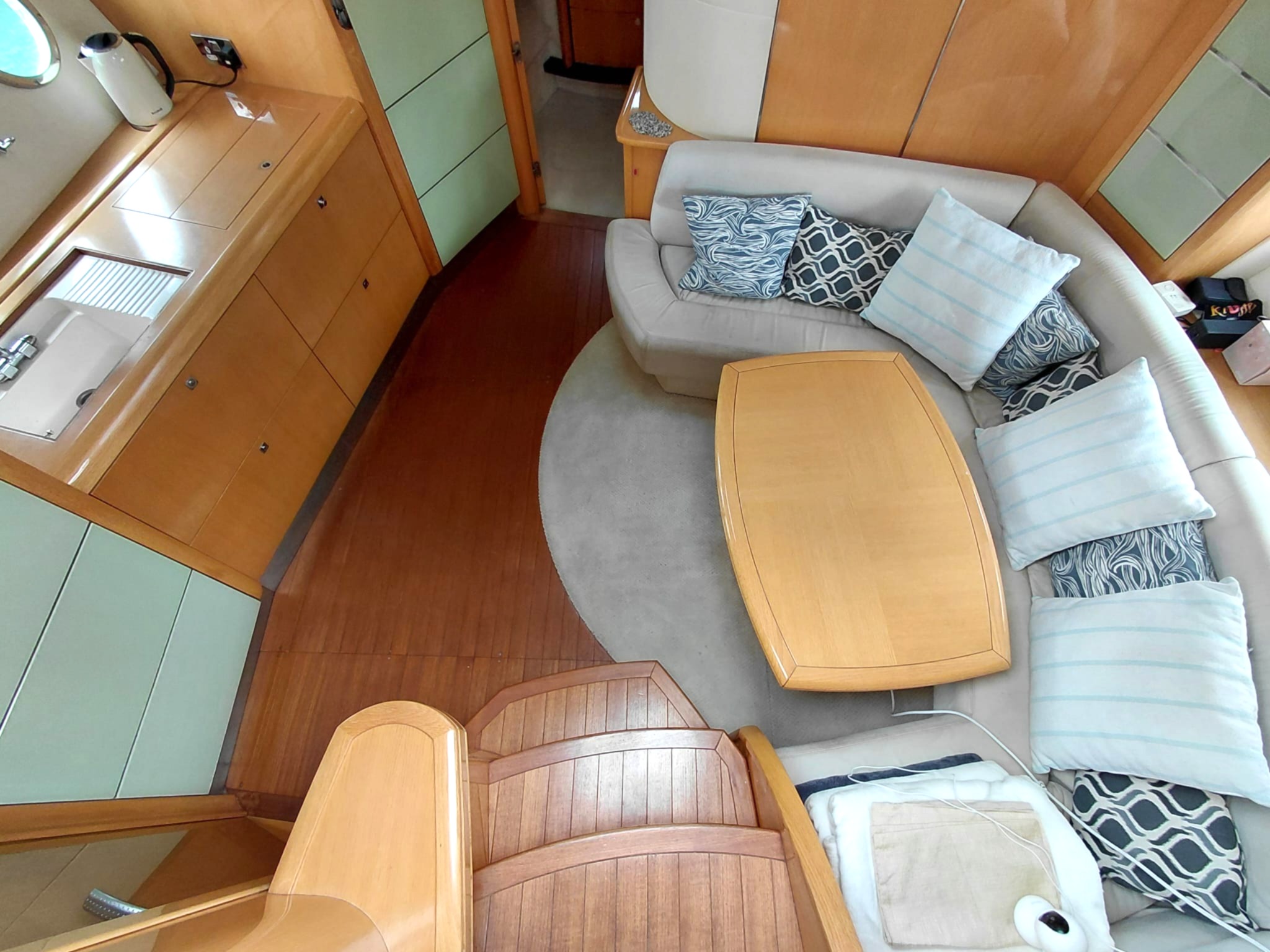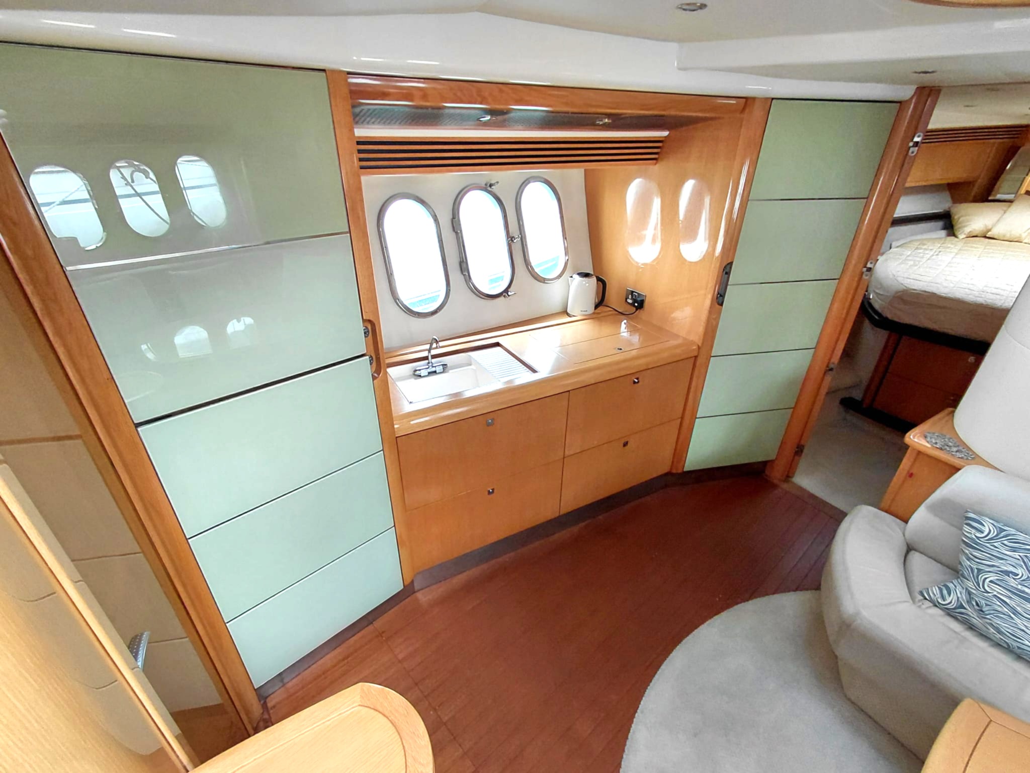 A premium finish inside and out. The 45 is generously proportioned and has a good top speed and cruising speed. The palatial aft cabin may prove irresistible for some and the big portholes fill the saloon with light. This a is true sports boat - fun to drive, good cockpit entertaining, big sunpad, tender garage along with beautiful interior styling. Available to view in Gosport.