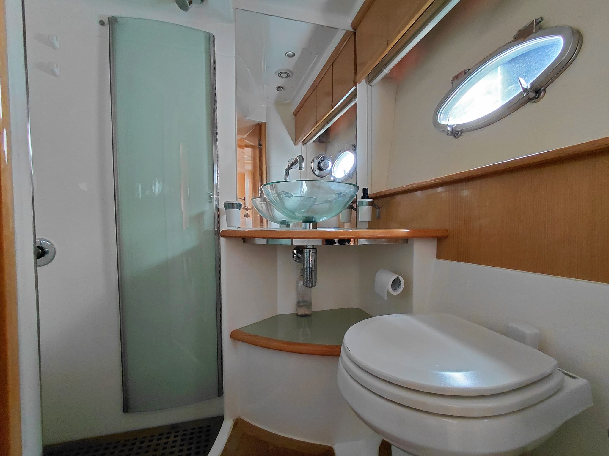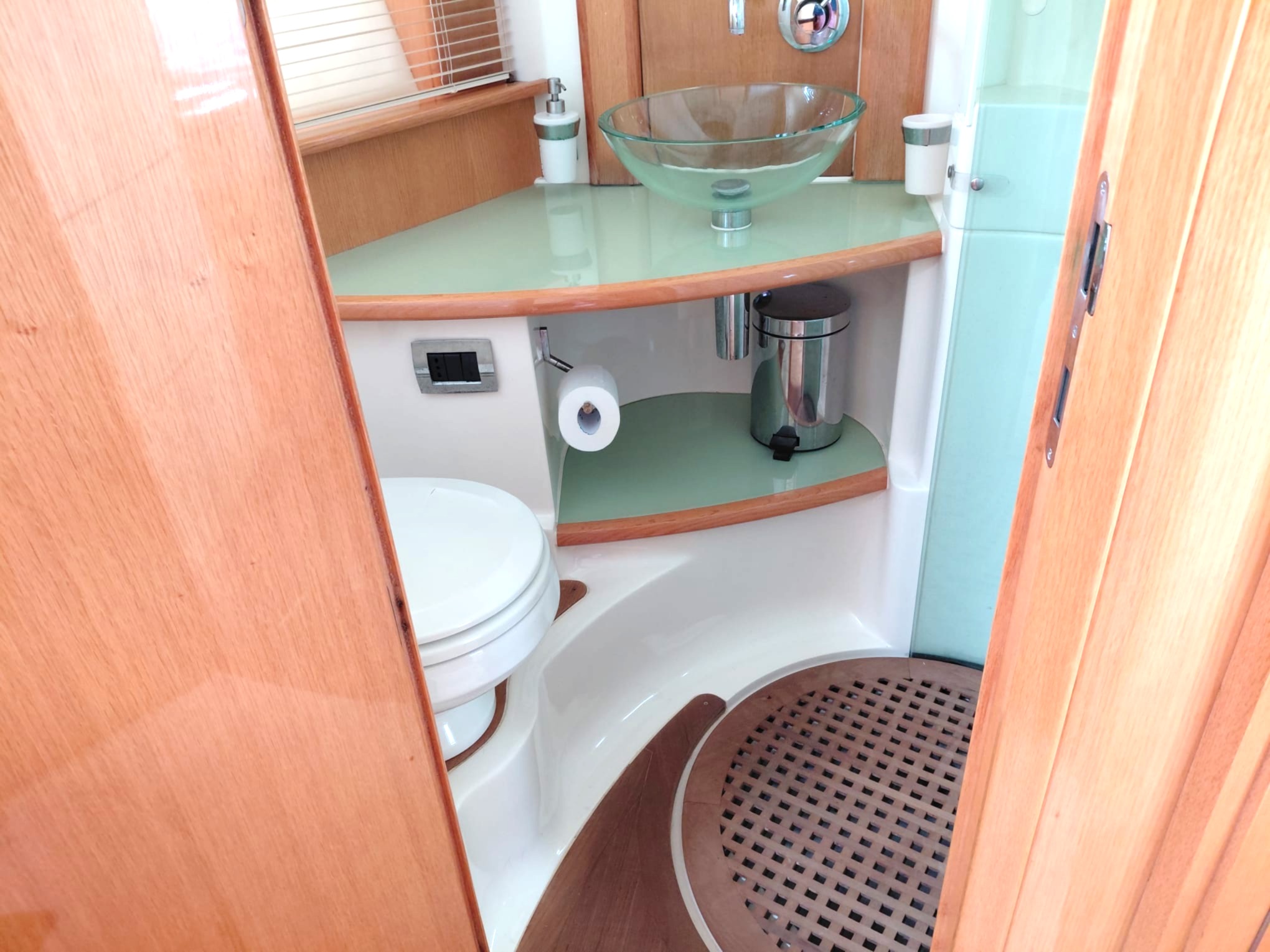 Heads compartments, each equipped with domestic Sealand marine wc, designer glass handbasin and shower