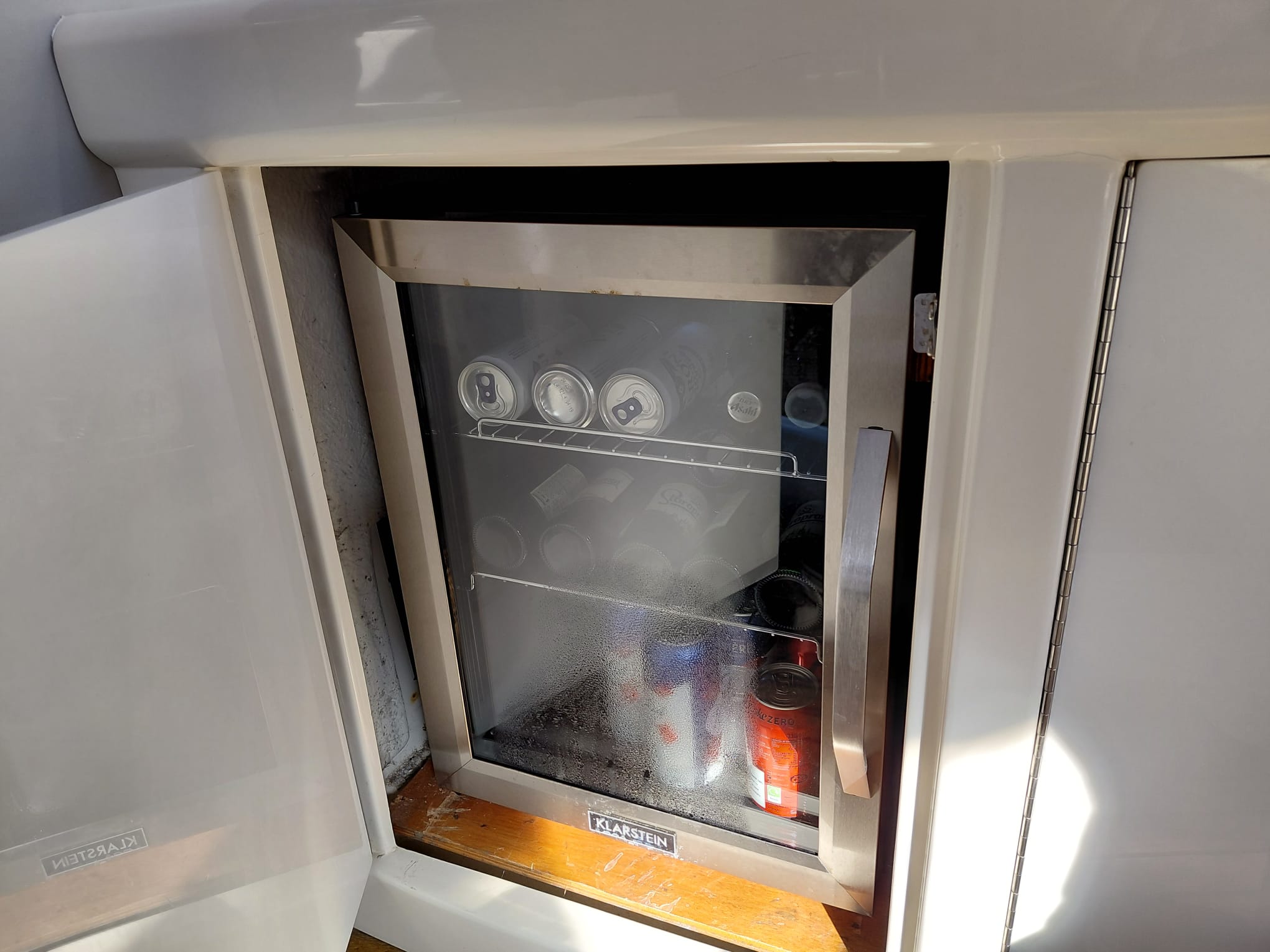 Galley includes De Longhi 2 plate electric hob, Sharp microwave, sink unit with foldaway mixer tap and domestic Isotherm fridge and freezer unit. Galley sink and hob are cleverly concealed.