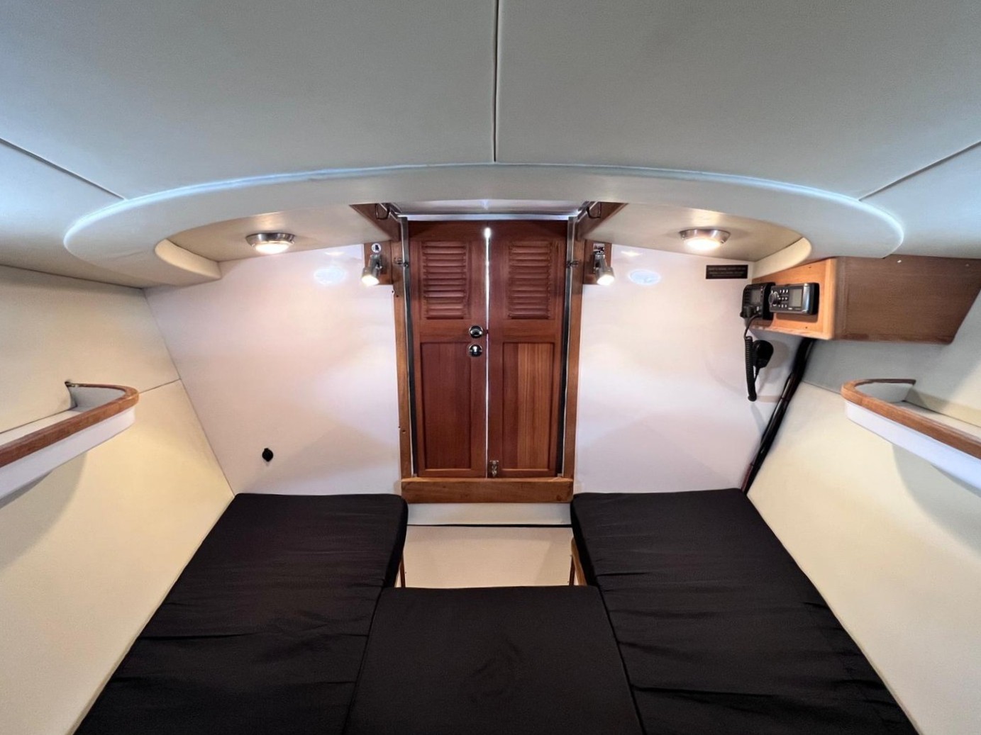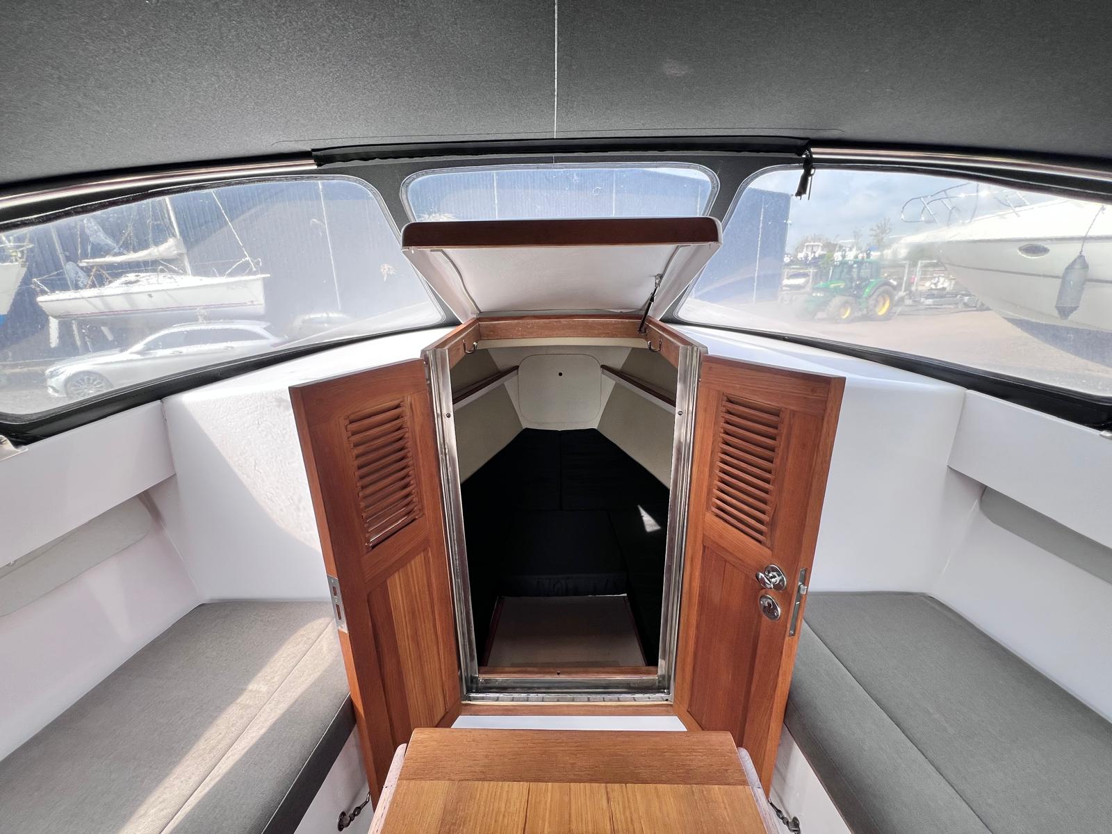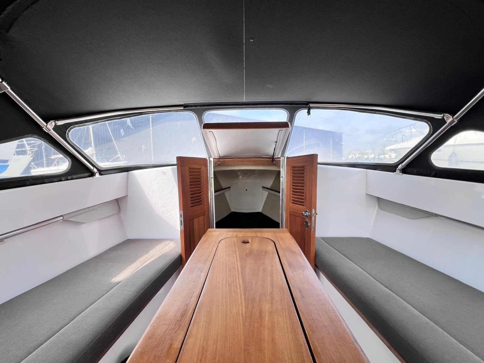 She is an exceptionally well-equipped launch, featuring a forward cabin, a wet bar and stove on deck, and seating for up to 10 guests. This Admirals Tender also benefits from the addition of spray rails, which not only improve her seakeeping abilities but also enhance her elegant profile.