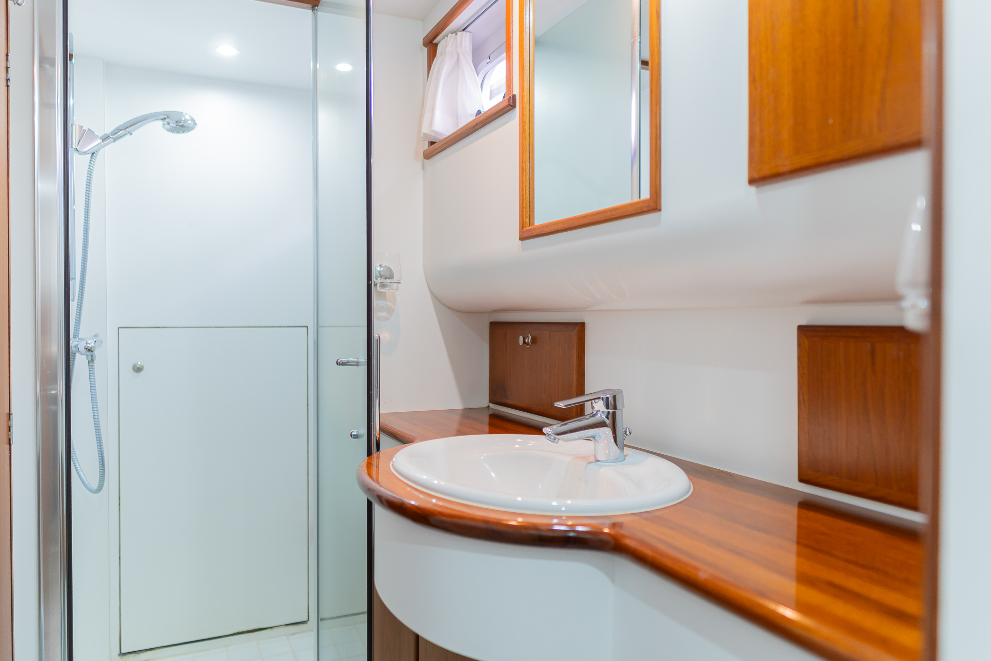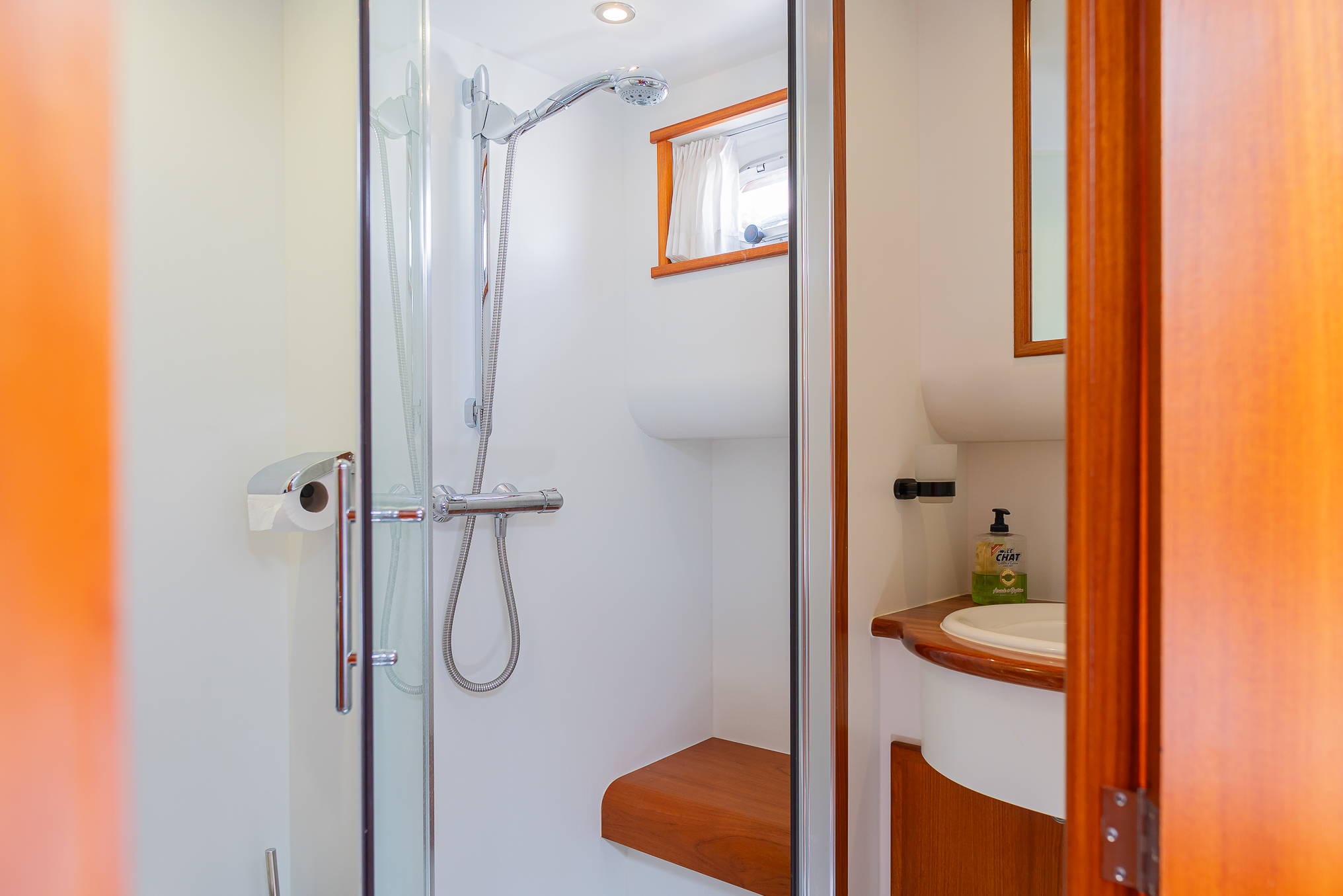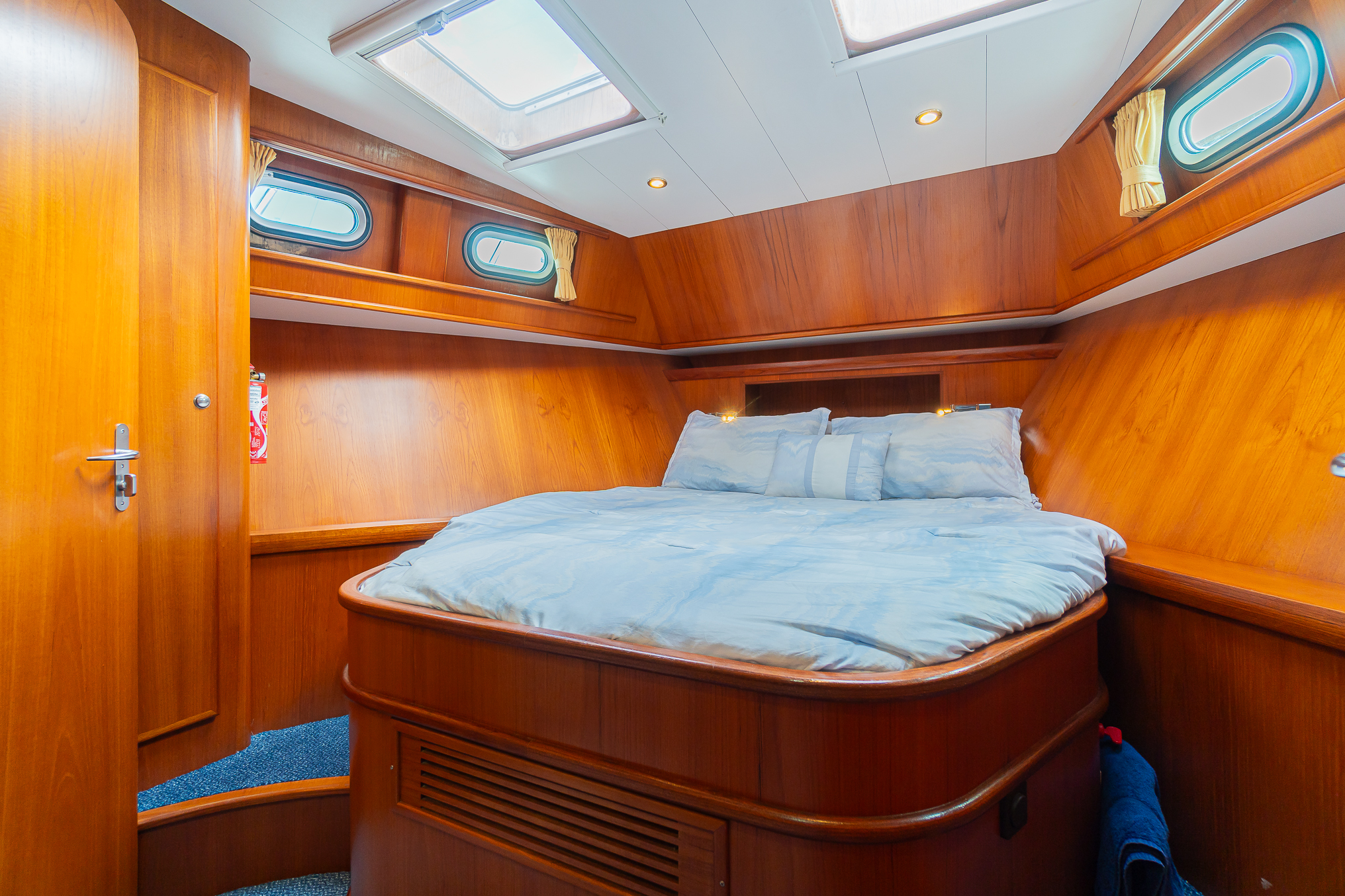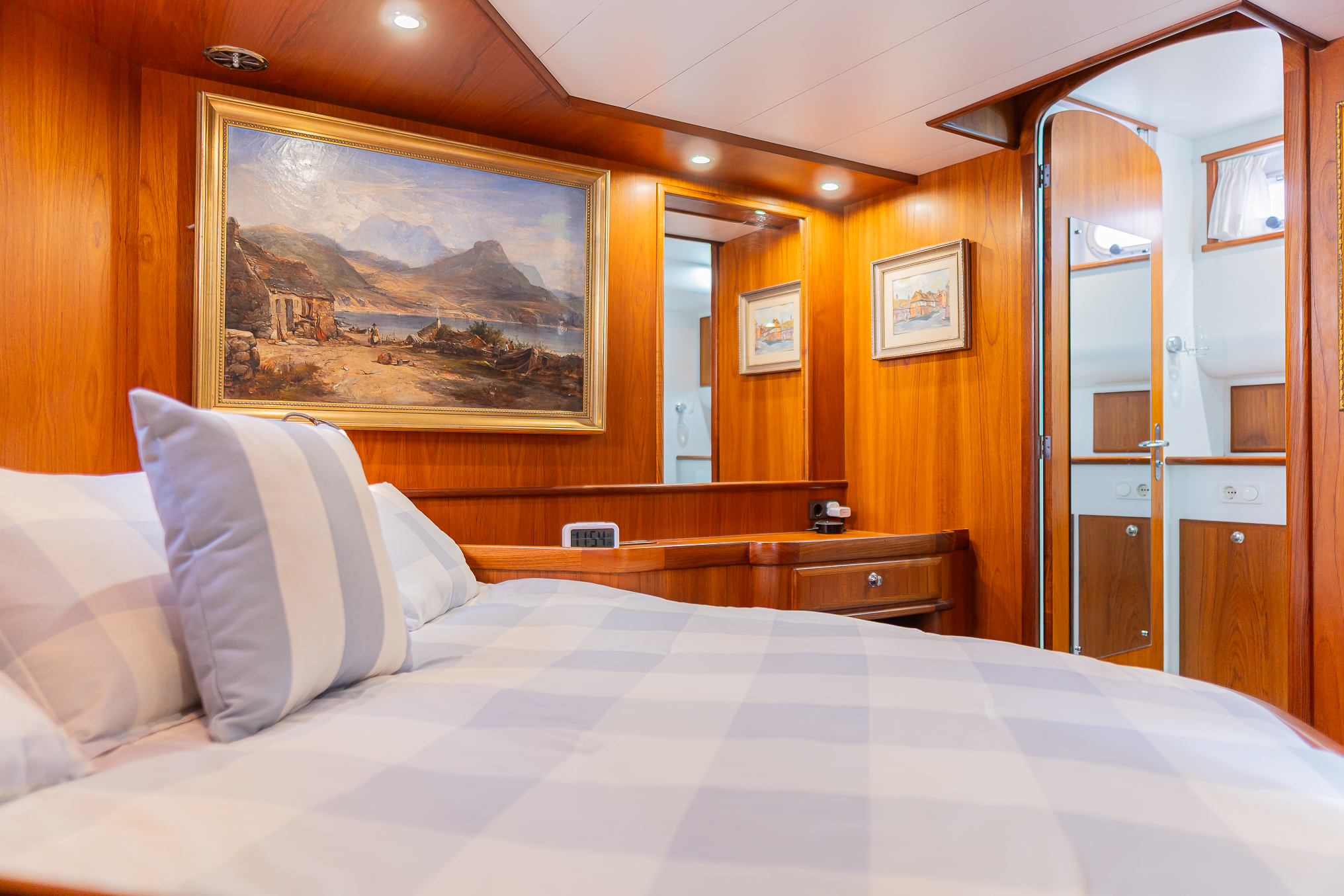Guest cabin forward with centreline double berth, sprung mattress and slatted bed, wardrobe, storage cupboard and reading lights.