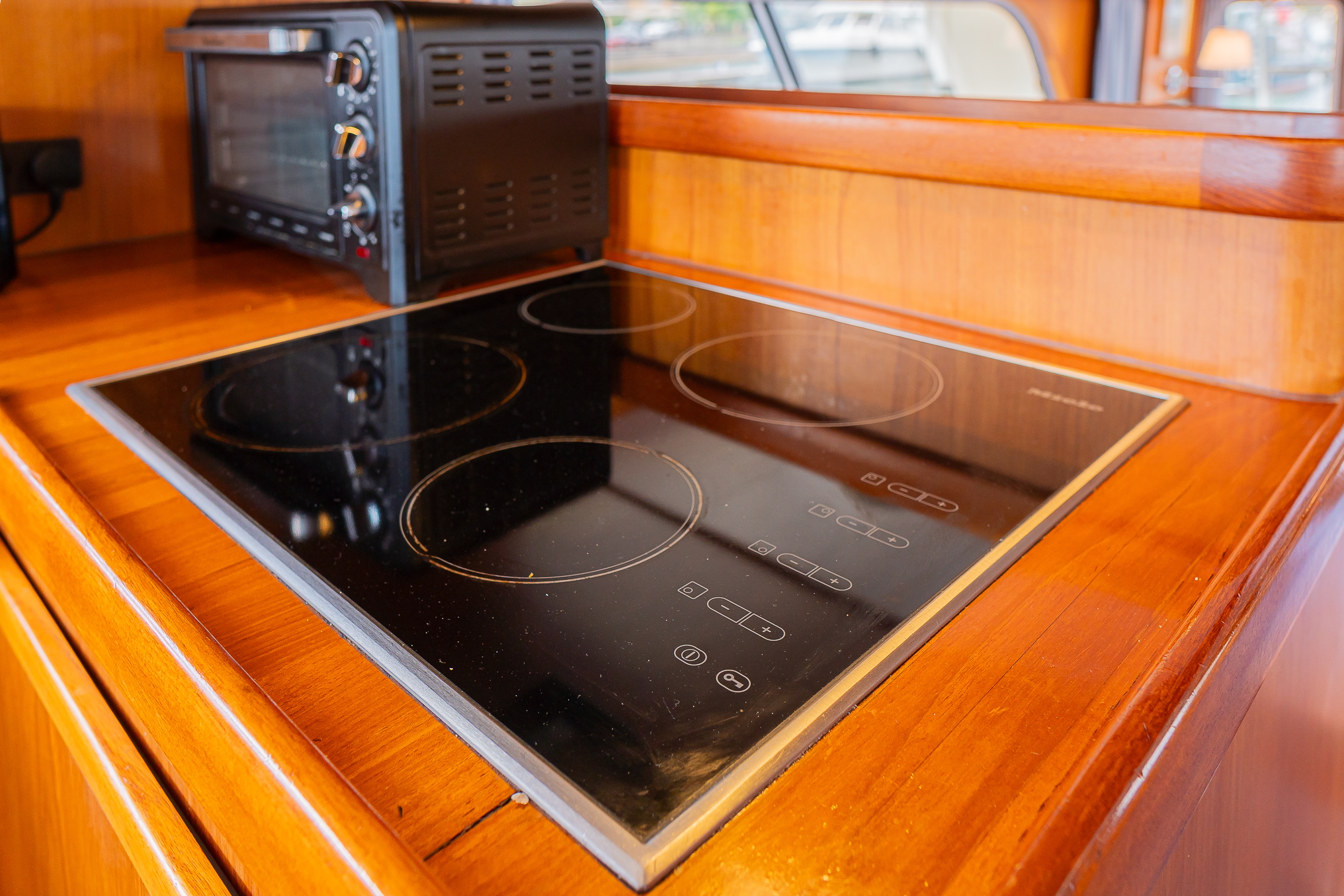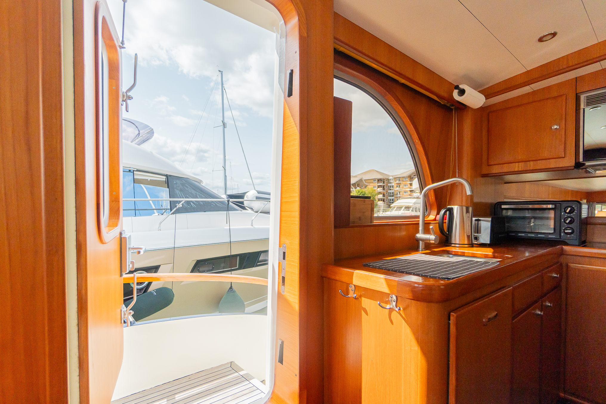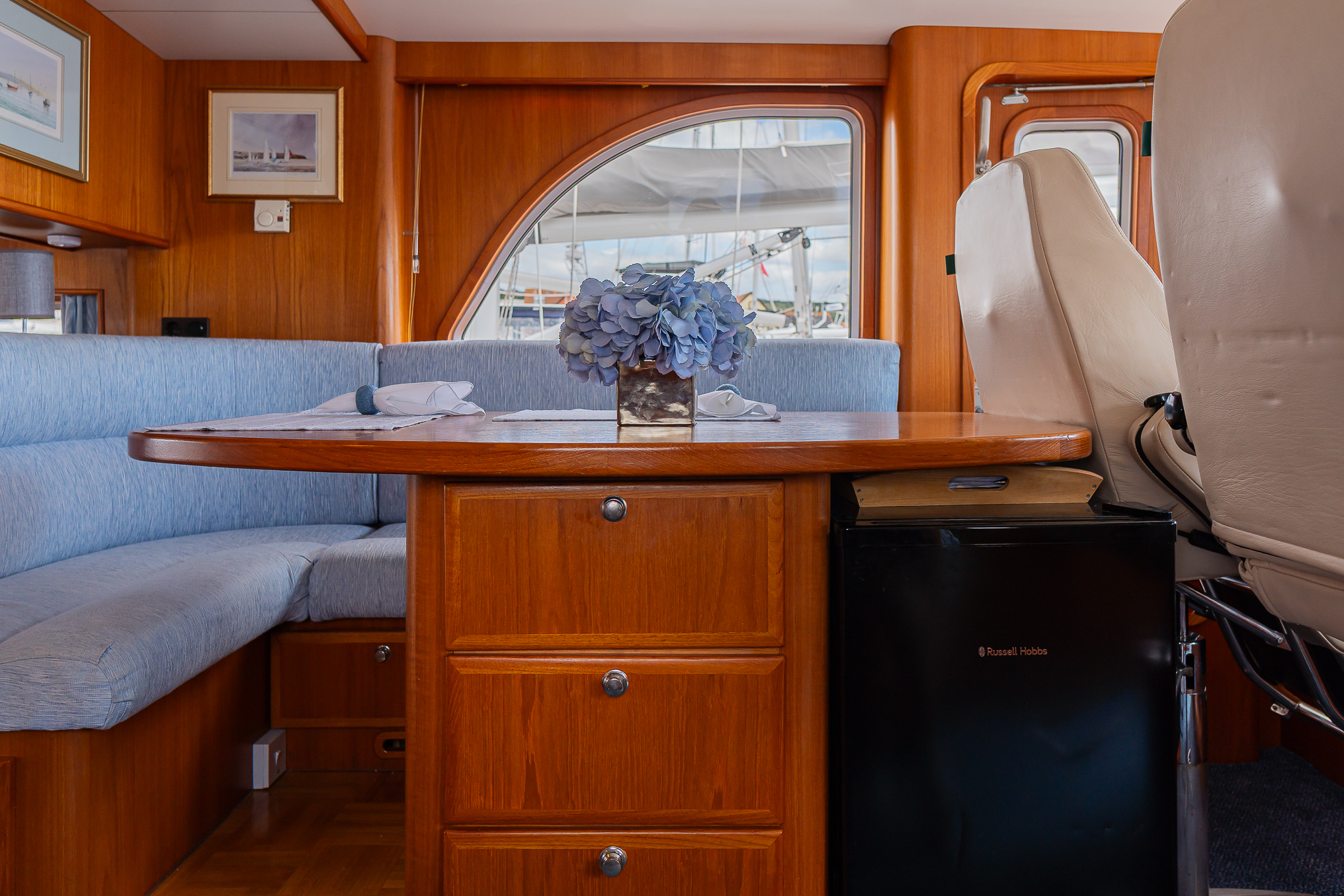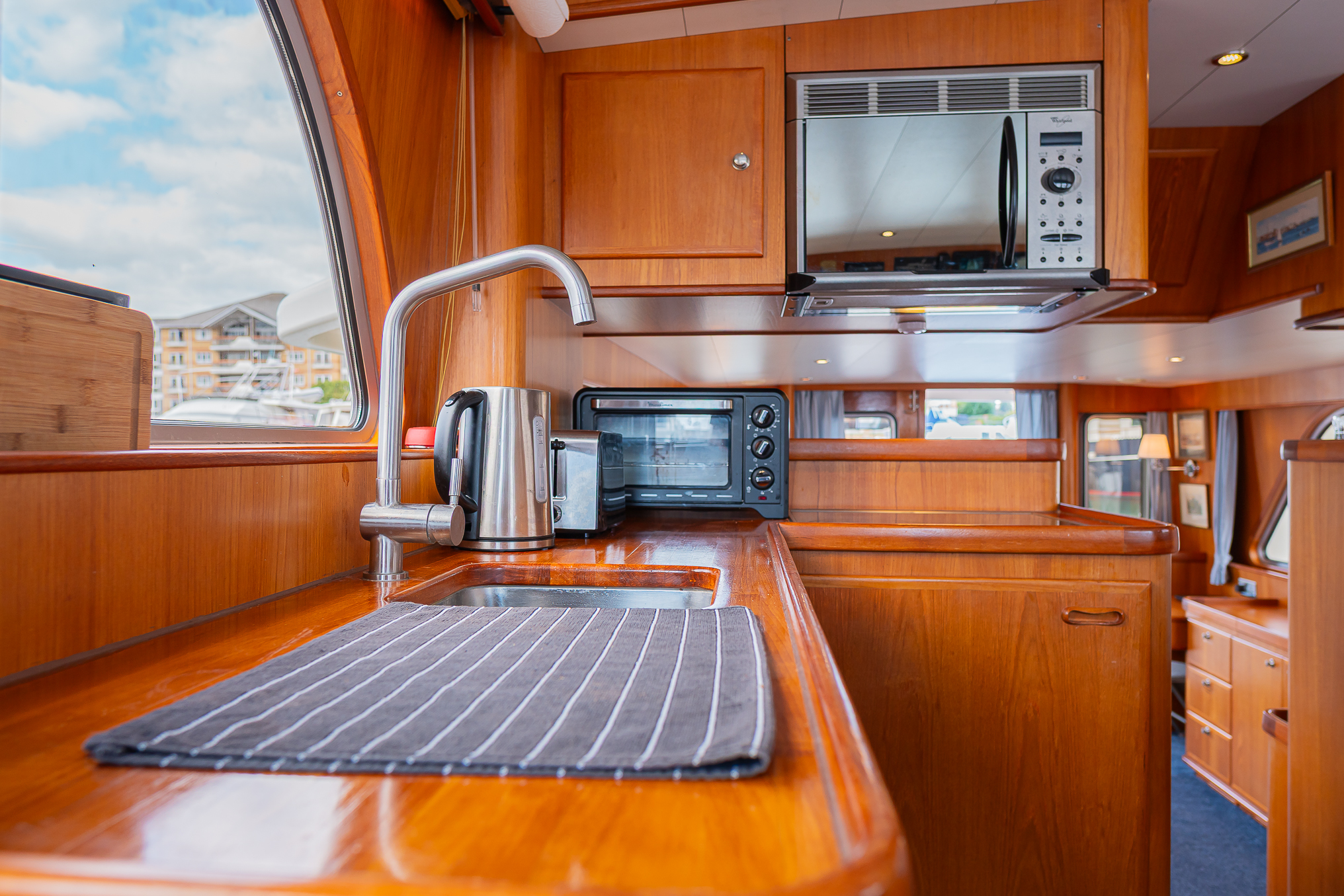 Raised pilothouse with L-shaped seating and dining table to port. Galley opposite with stainless steel sink, Miele 4-burner hob, Moulinex oven, extractor fan, Whirlpool microwave oven & grill, fridge & Miele dishwasher.