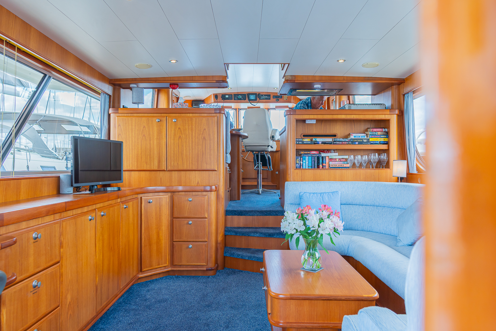 Saloon with U-shaped seating to starboard, coffee table & shelving. Sideboard opposite with extensive storage and LG TV with multizone DVD player.
