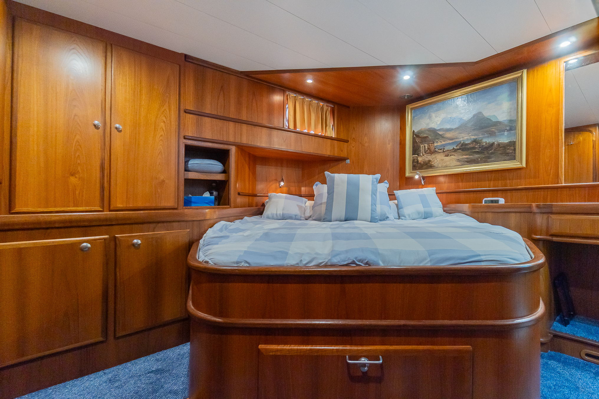 Owners cabin with offset double berth, sprung mattress and slatted bed, wardrobe, storage cupboards, vanity until, mirror and reading lights.