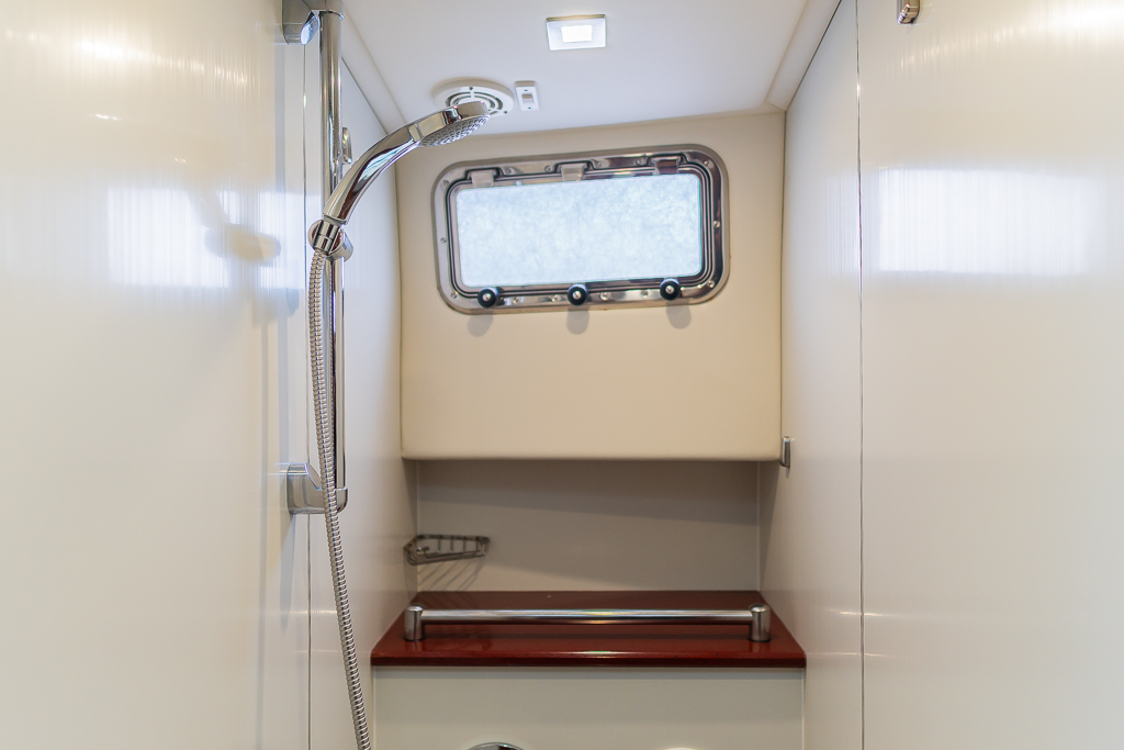 Master cabin aft with spacious island walk-around double berth, storage under berth, dressing table with mirror, hanging storage, down-lights, reading lights, opening portholes and hatches. Master cabin ensuite with Jabsco electric vacu-flush toilet, storage with mirror, sink and towel radiator. Separate master ensuite shower compartment.