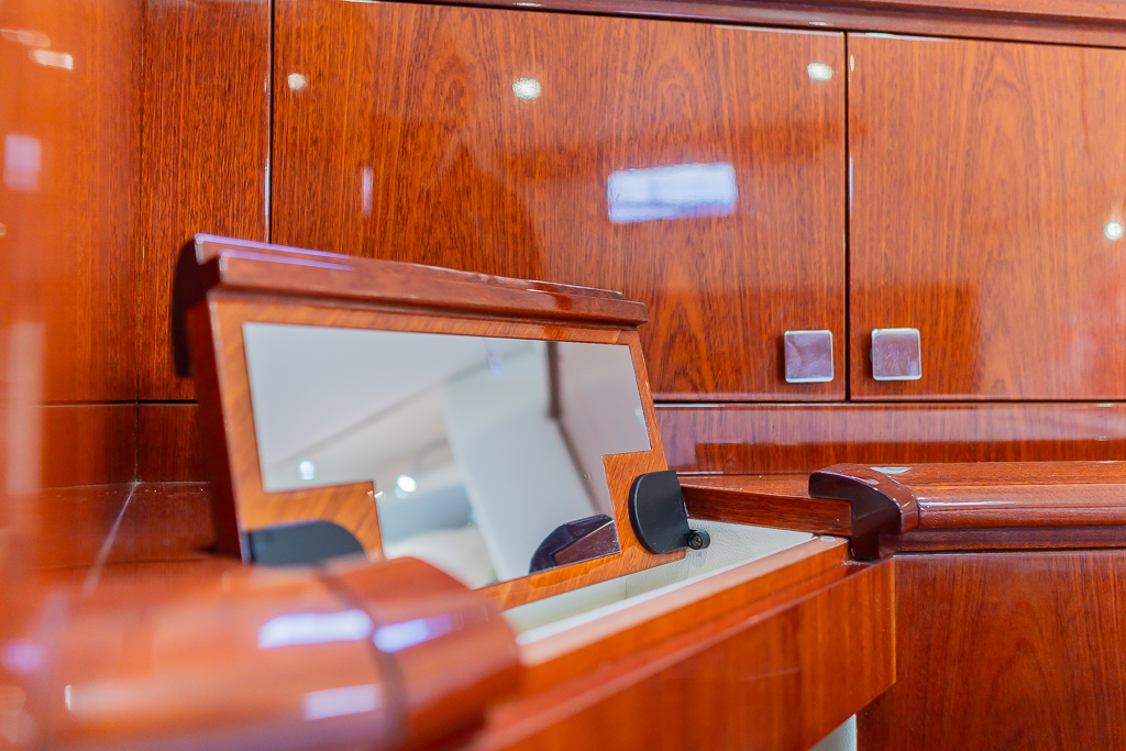 Mahogany interior timber in high gloss finish with selected maple joinery to master cabin and side cabin
