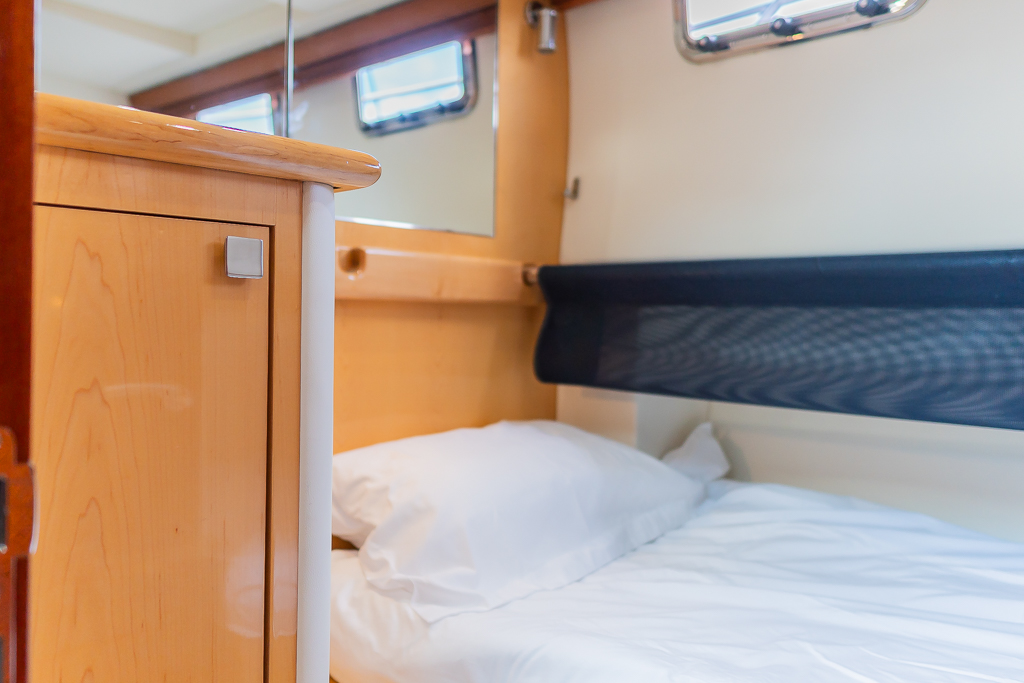 Guest cabin to port with single bunk berth with hammock style 'Pullman' single berth above, hanging locker, storage, down-lights and reading lights.