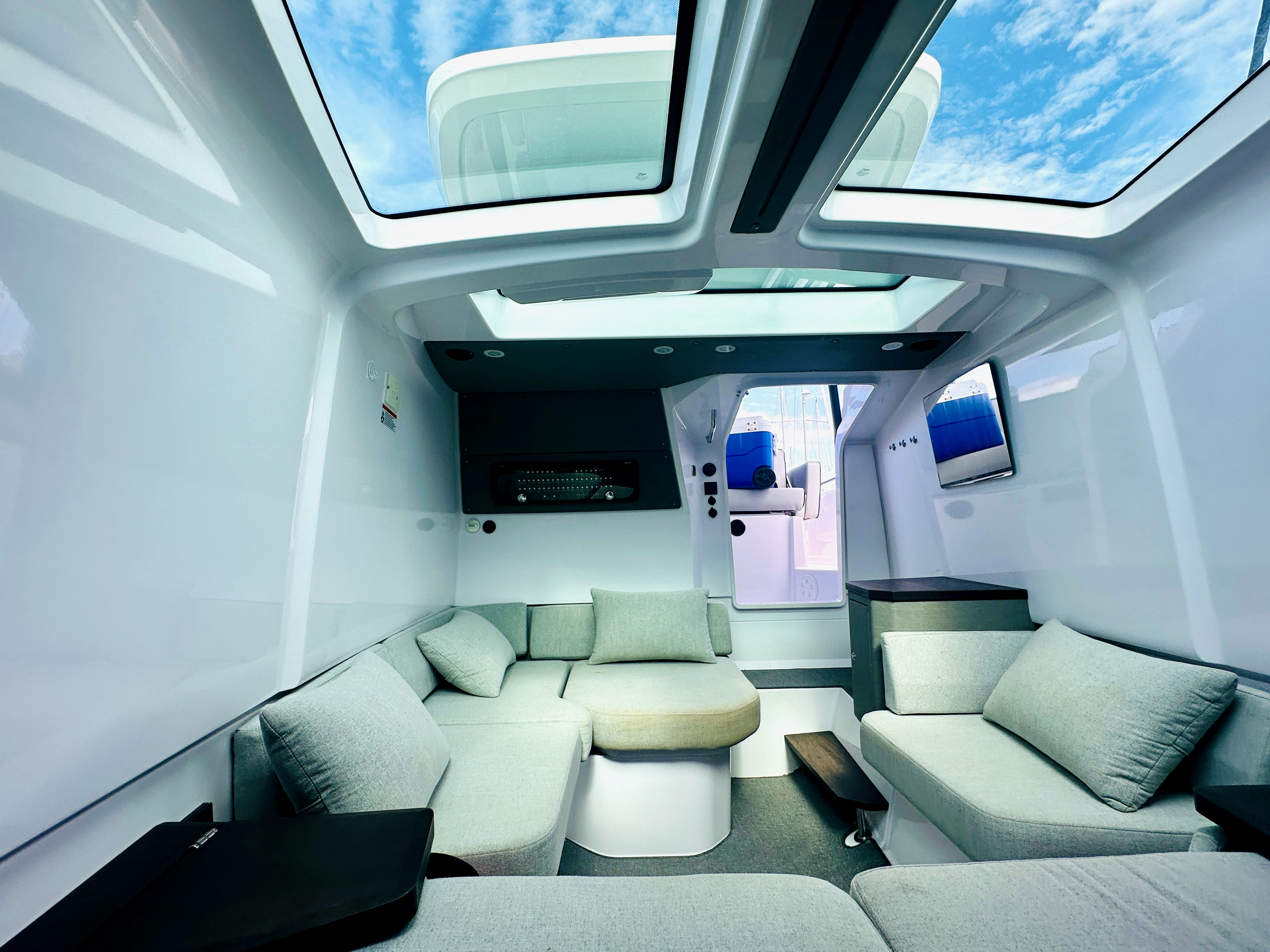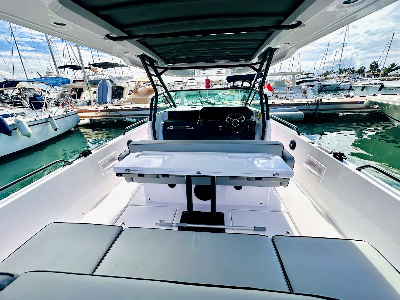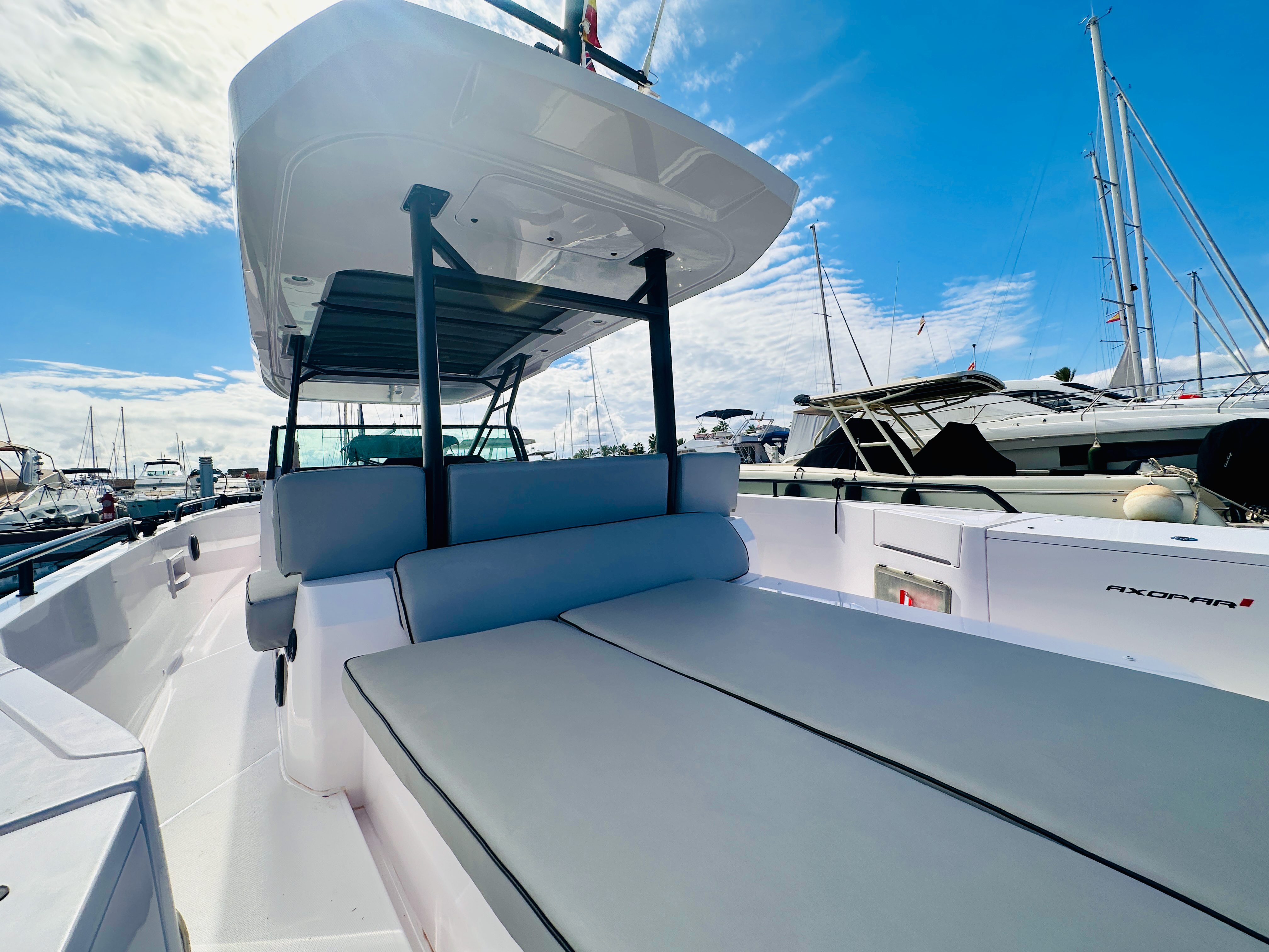 This Axopar 37 is a lovely example of this very popular model. Spectacular design custom wrapped hull. Viewing is highly recommended in Mallorca! The 37 Sun Top has more than enough versatility for enjoying all day long hospitality and all kinds of water-sports fun, and is the perfect boating cocktail by adding friends and family. It is in every way a long-distance, comfortable passage-maker. Its impressive driving characteristics and clever design allows for even wider, multipurpose usability and comfort. Enjoying a great day in the sun with family, savouring ‘alfresco’ dining, having a party with friends or for those who love the feeling of running an open boat but still being protected from the weather. The 37 Sun Top has proved to be the perfect choice, easily justifying its position as a true game-changer. The 37 Sun Top version, with its full-length shaded roof, is loaded with a myriad of innovative functionality and luxury comforts. The extended roof offers the best shade and weather protection possible without compromising on the space and versatility of the walk-round sides and a sun lounger on the aft-deck.