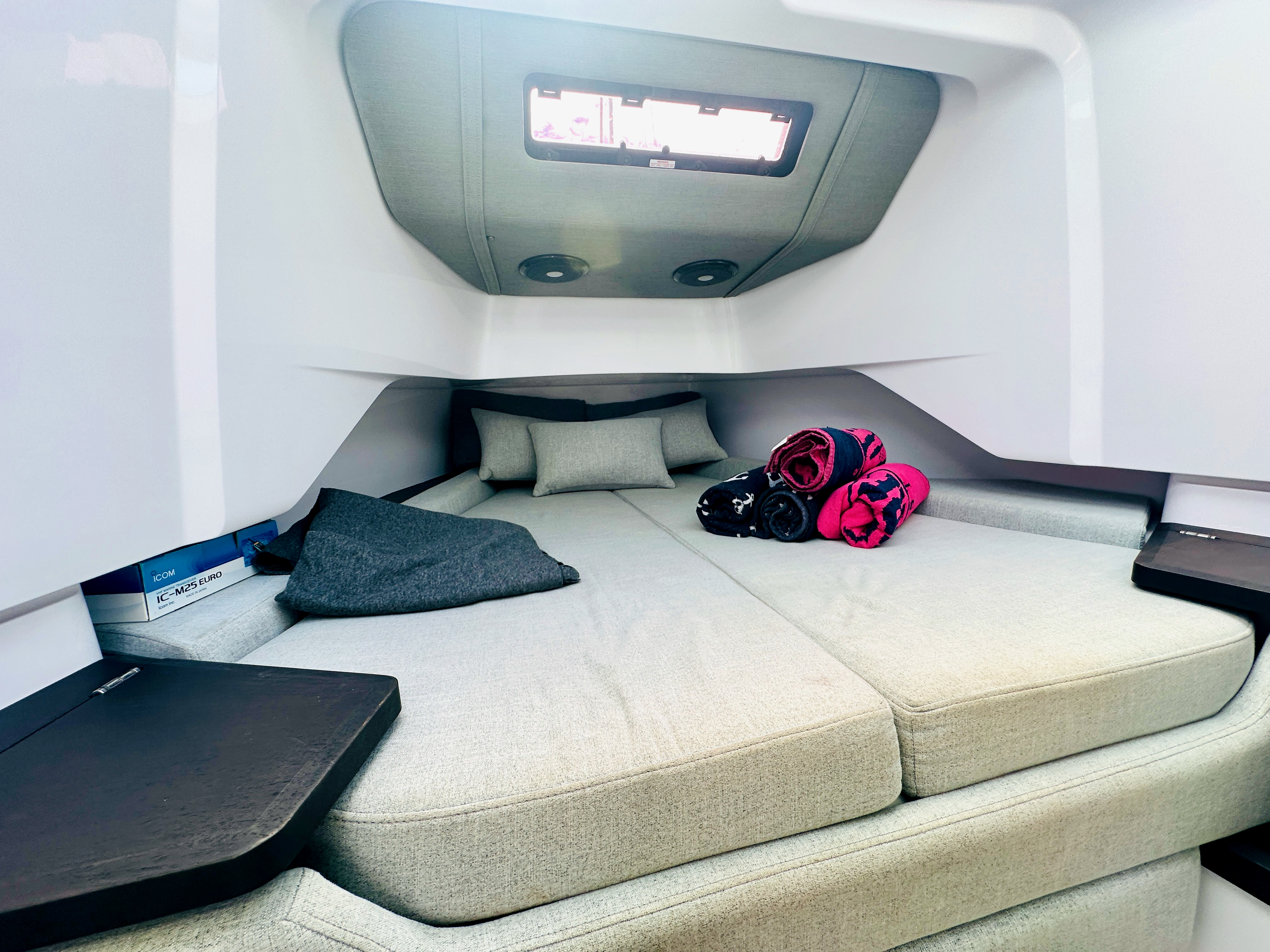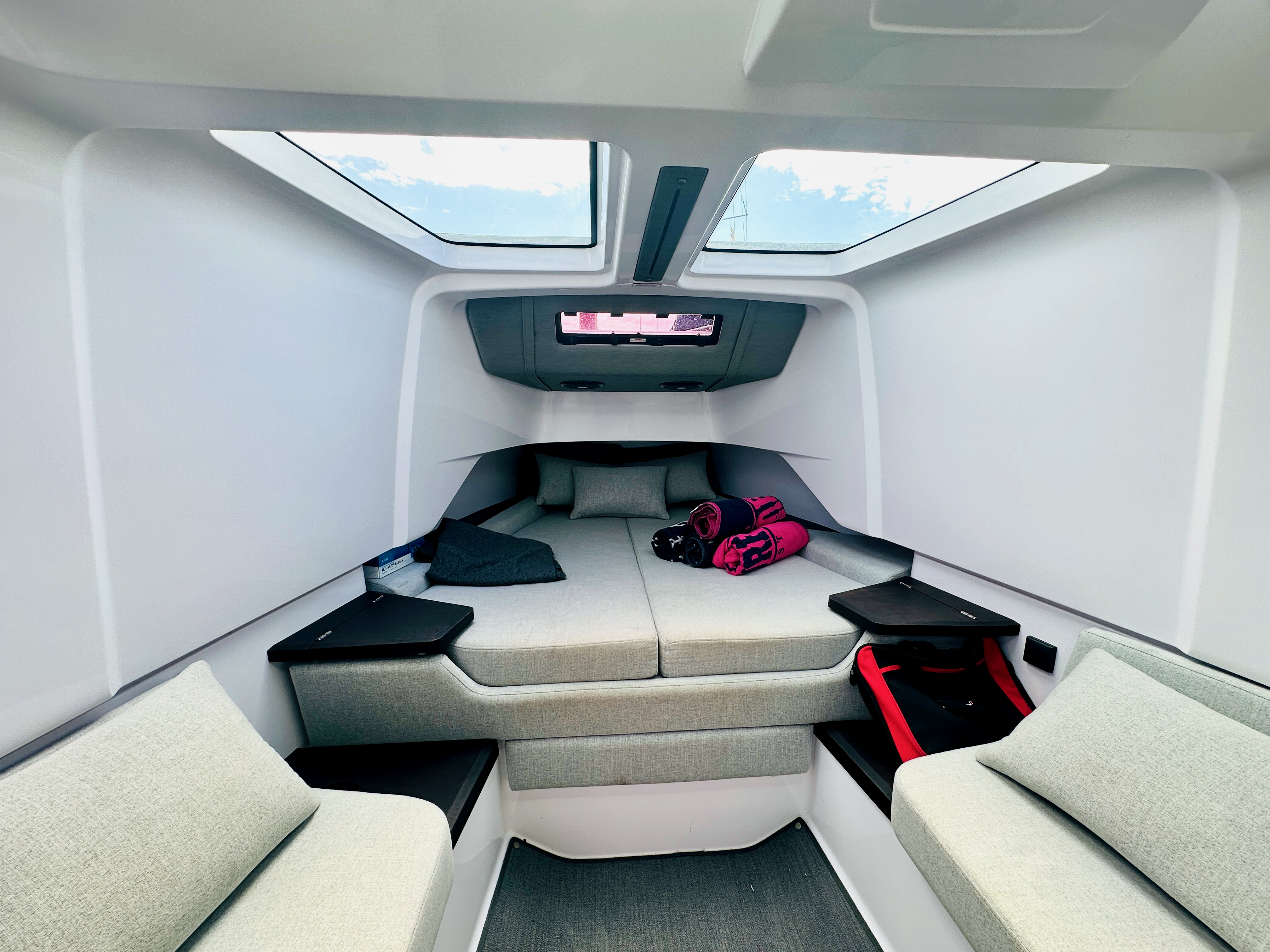 Front cabin with sofa and lounge chair and fixed cupboard, converts into a double berth