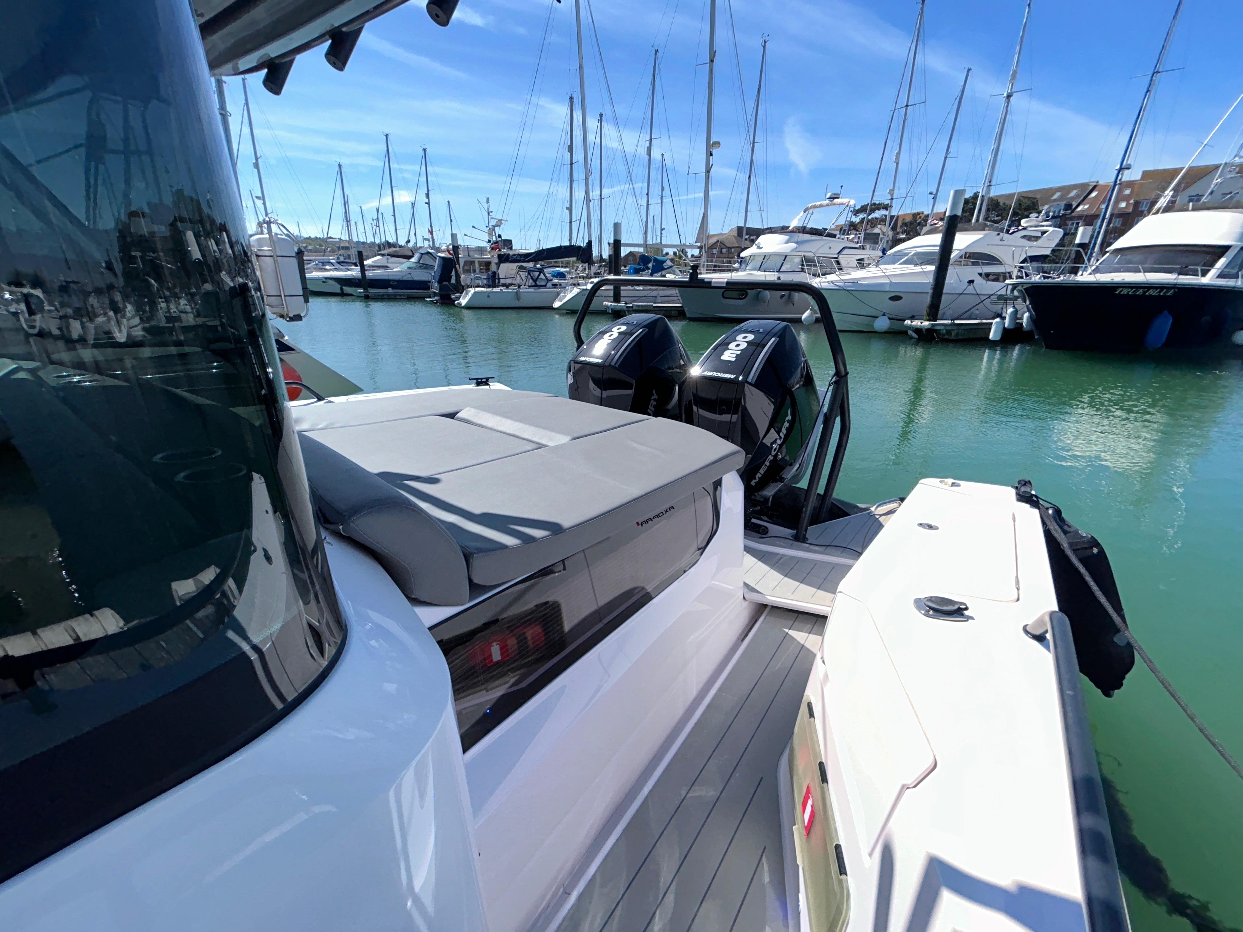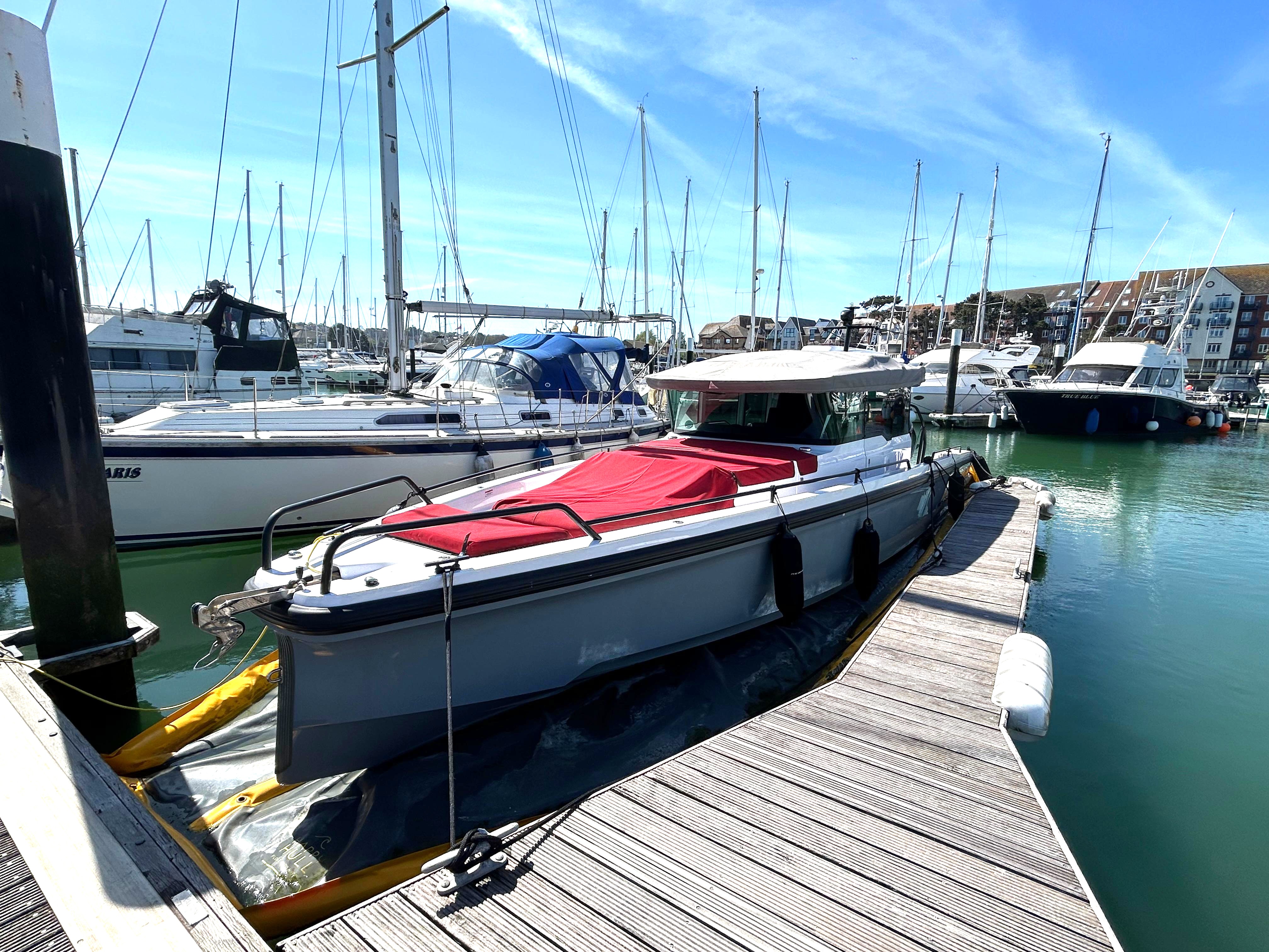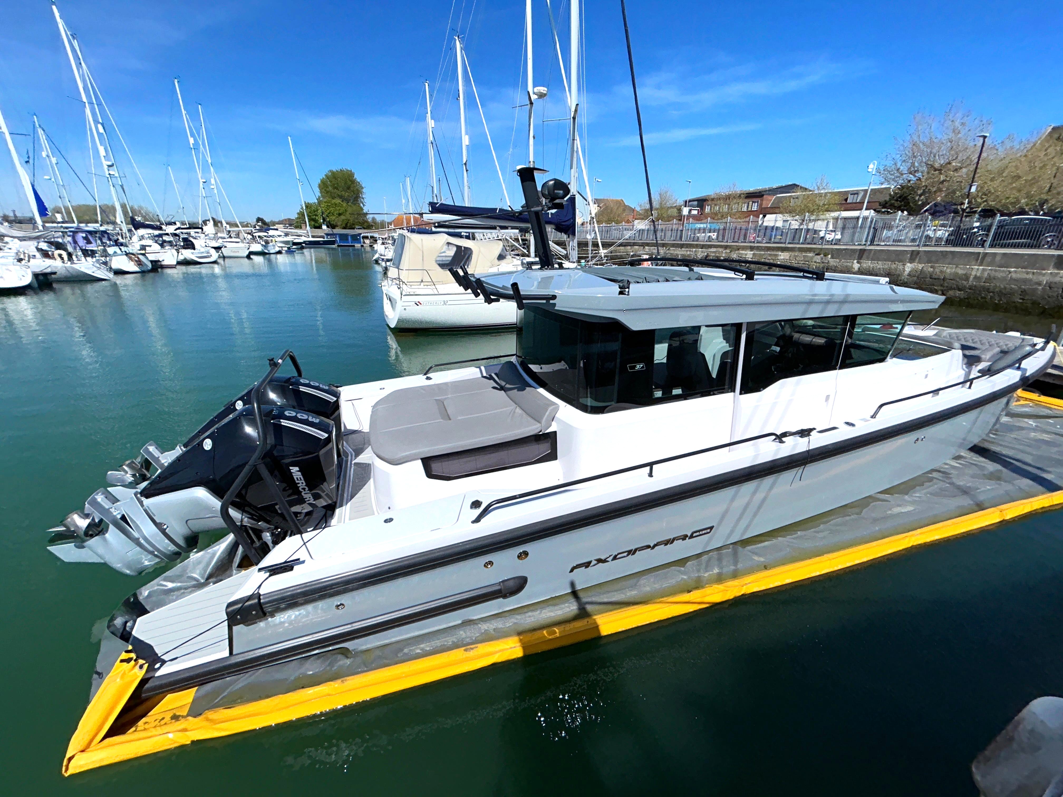 A great opportunity to get afloat this season on one of Axopars most popular models finished with a stunning grey hull and Brabus line package. "Pace" Was supplied by Axopar London Group to her current owner approx two seasons ago and had the benefit of 2 new Mercury outboard engines fitted and supplied by the local Mercury dealer Holes Bay Marine, Fully commissioned and receiving large full service which brings her up to date and having still remaining manufactures warranty. She has since had very little use but always maintained to the highest standards including a recent hull and superstructure polish. A true all round season practical boating come rain or shine with central heating throughout , Pace also offers the aft cabin layout option for those who requires second cabin and more storage space for the occasional guests or family members. She has the benefit of being afloat withing a very cleaver "Happy Hull" storage arrangement which is included in the sale and avoids growth and weed on the underwater section. refer to " happyhull.com".